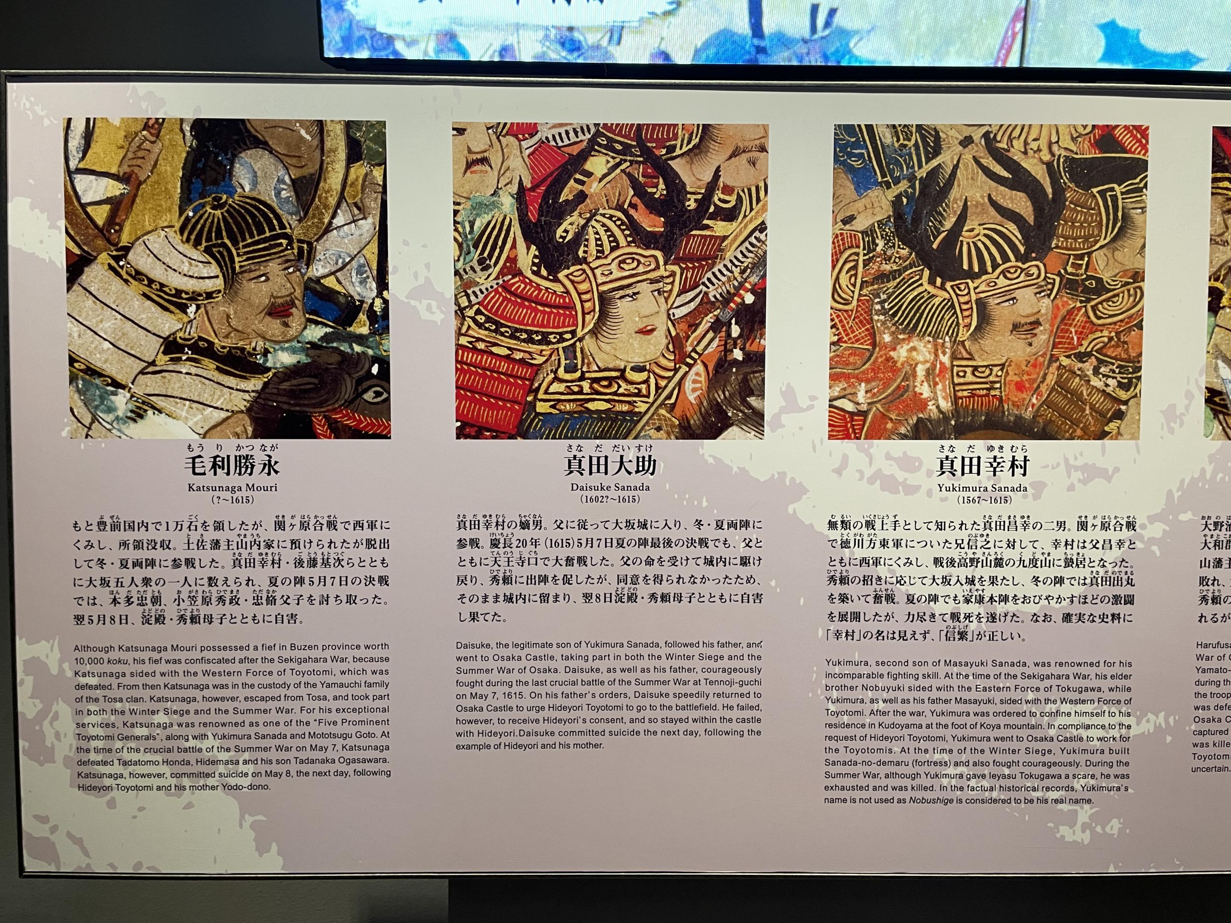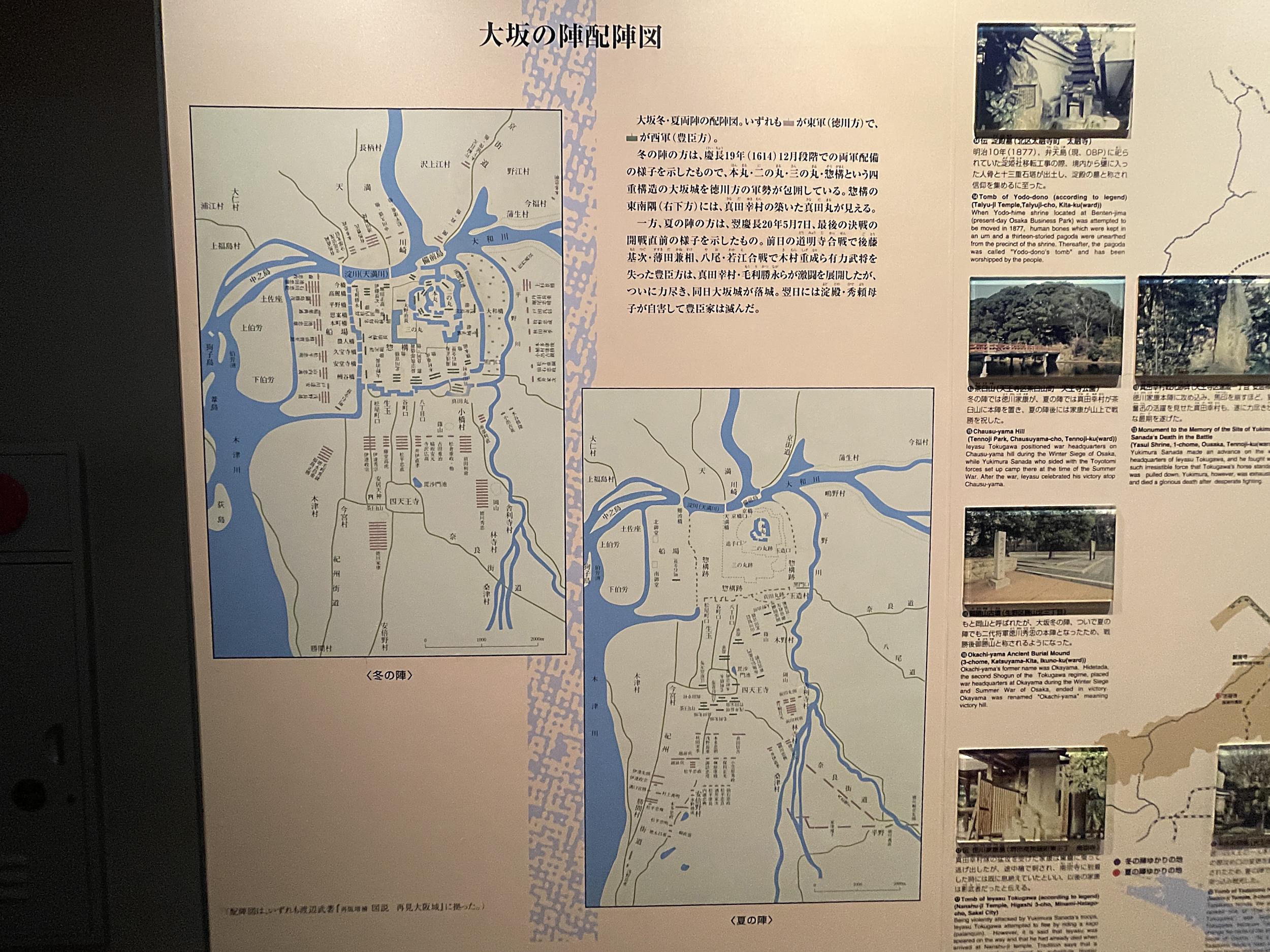 エレベーターで5階へ上がると、大坂夏の陣図屏風の世界。大坂の陣配置図のパネルから、夏の陣では濠が埋められてしまい真田丸も無くなっていて、よくぞこれで豊臣方が戦ったものと思わざるを得ない。