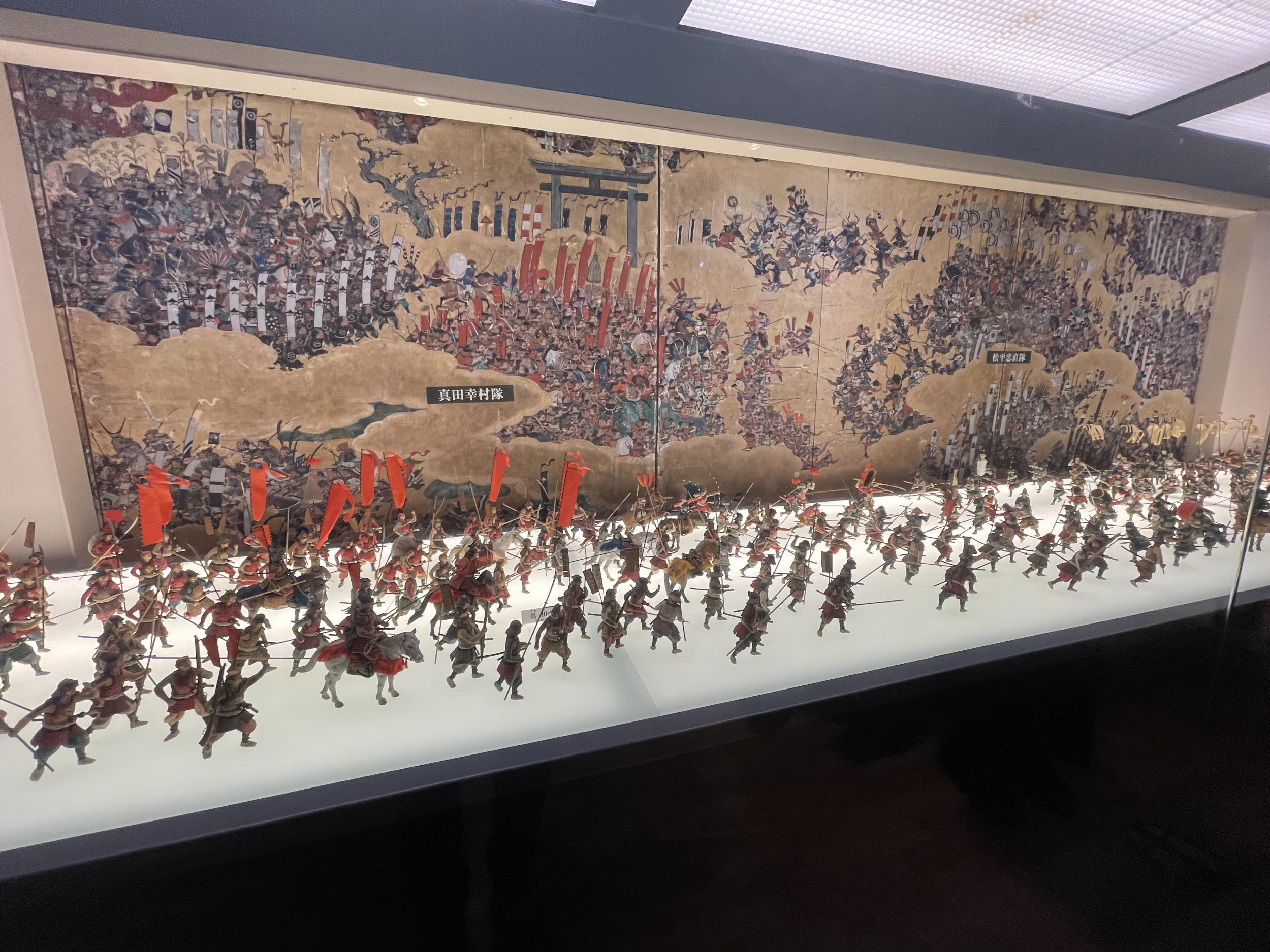 夏の陣のミニチュア、うしろは一心寺存牟堂にレプリカが飾られている図屏風の一部です。実物が天守閣に保管されているはず。