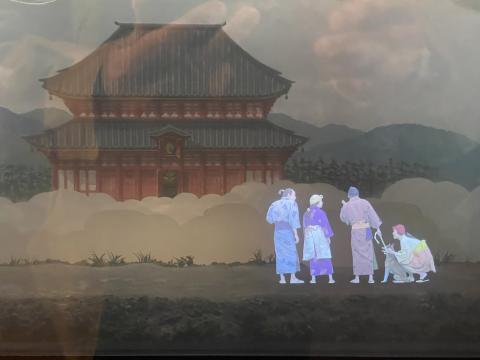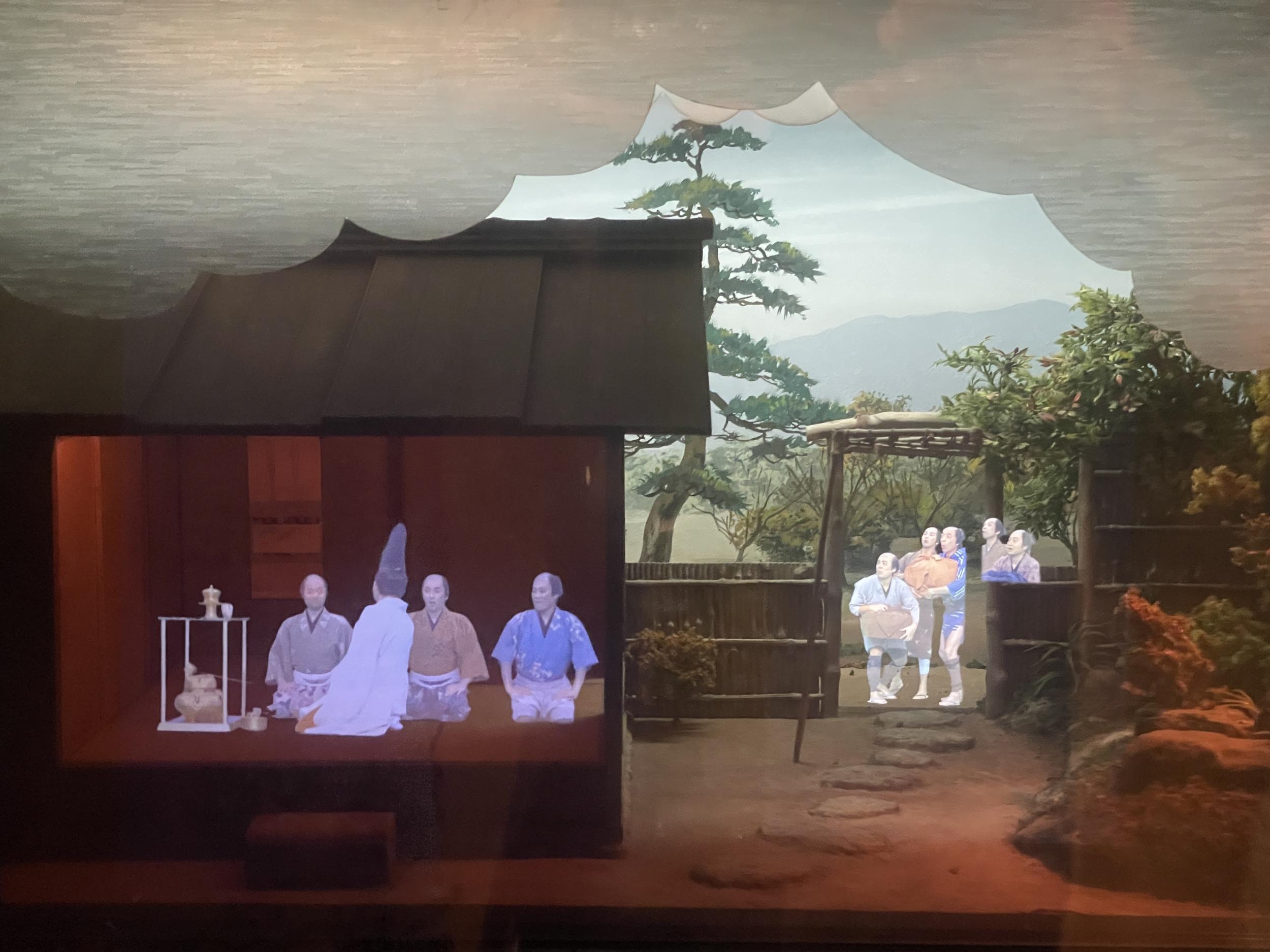 ジオラマとCGを合成した「からくり太閤記」。白装束に烏帽子の秀吉が町衆を招いた茶会の場面と、方広寺大仏殿を見て驚く京の町衆の場面。
