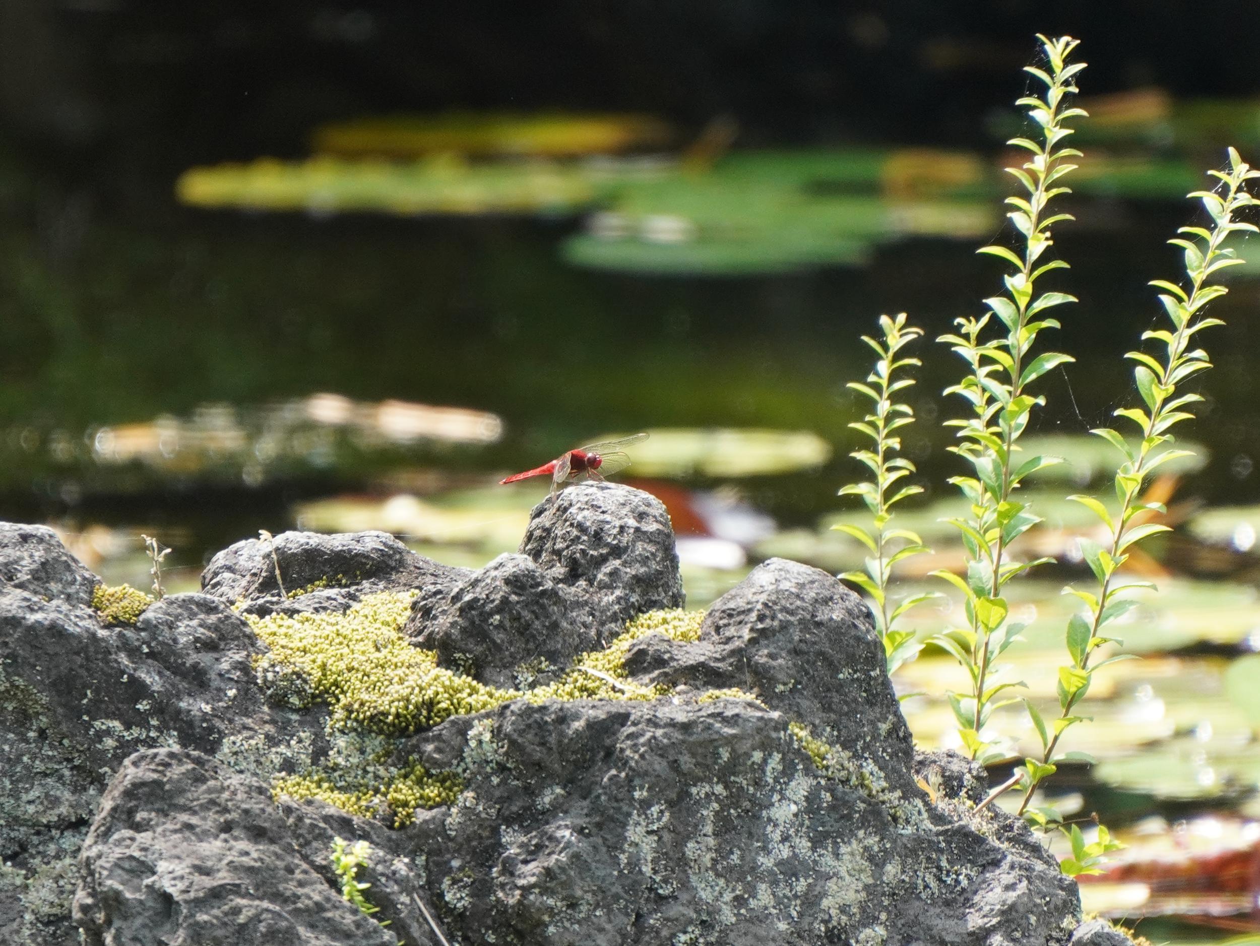 「和泉中央駅からあしをのばして」の左上が腰を下ろしてショウジョウトンボを撮った椅子、右上は池上遺跡の大型掘立柱建物「いずみの高殿」。