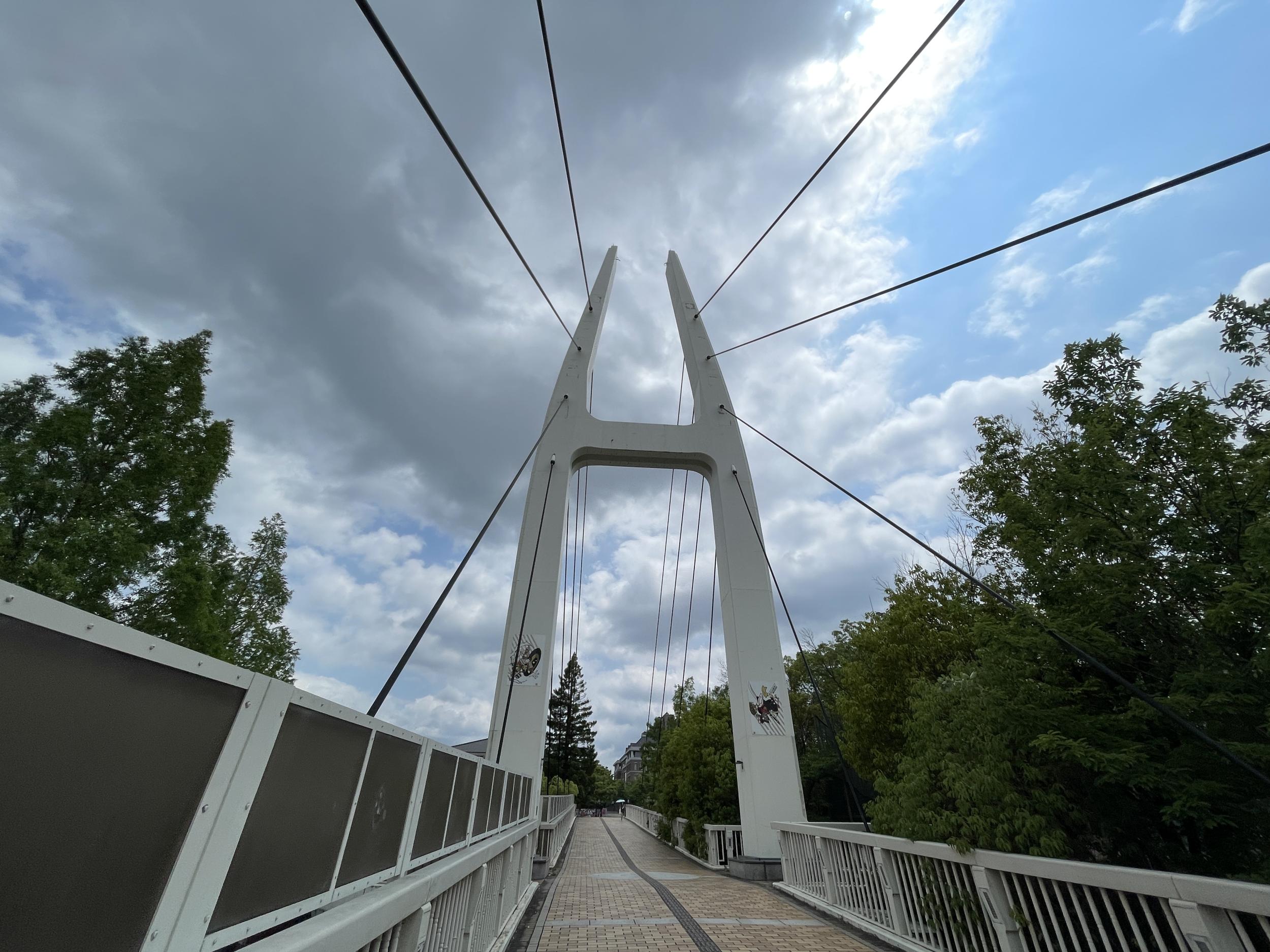 桃山学院大学と美術館への矢印に沿って歩いていると斜張橋が現れました。斜張橋の向こうが桃山学院大学のキャンパス。桃山学院大学(ピン大)といえば谷村新司、在学中はアリス以前のロック・キャンディーズだったはず。今聞き直してみてもこの人の声の美しさはすごい。