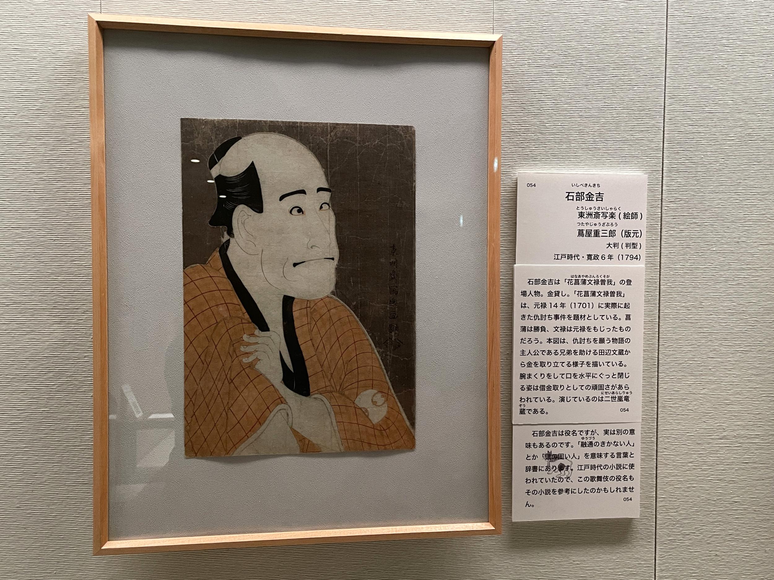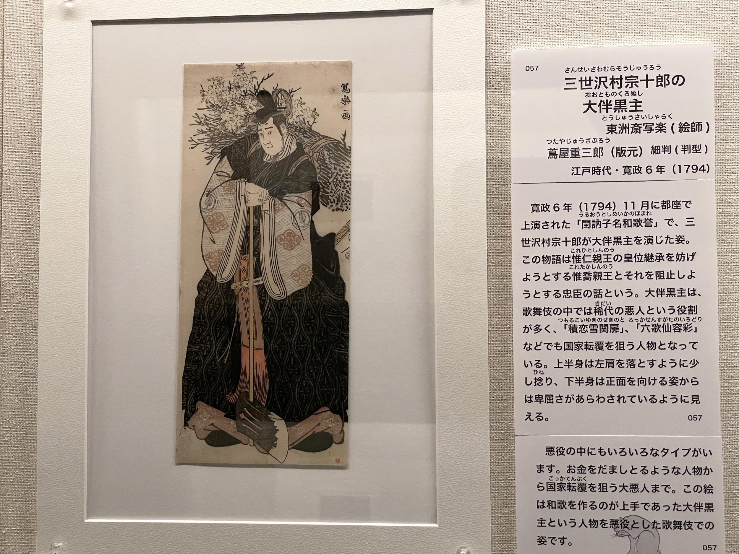 ダース・ベイダーを彷彿とさせる迫力ある写楽の画は、三代目沢村宗十郎演ずる国家転覆を狙う稀代の悪人、大伴黒主。三代目沢村宗十郎の当たり役は仮名手本忠臣蔵の大星由良助も実悪(残忍な悪人)役も得意としたらしい。ここに掲げたすべての浮世絵はべらぼうこと蔦屋重三郎が版元です。