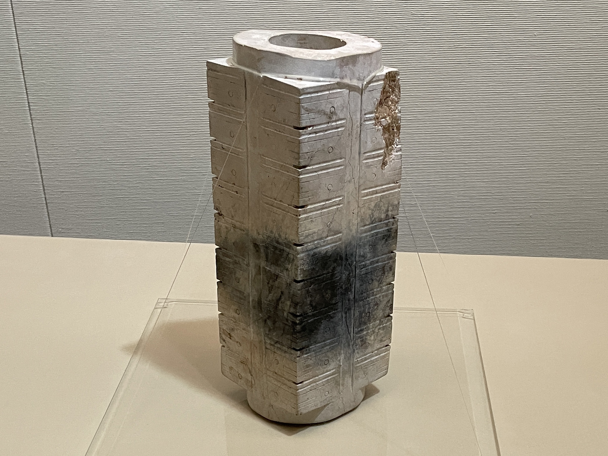 続いて平常展「中国の工芸品」、獣面文琮(じゅうめんもんそう)はなんと新石器時代(紀元前3300〜2200年)、青銅器の殷より千年以上、中国最古の王朝とされる夏よりさらに数百年前、三皇五帝時代の玉製品です。長江文明の一文化とされる良渚(りょうしょ)文化のWikiPediaに似た玉製品が紹介されています。