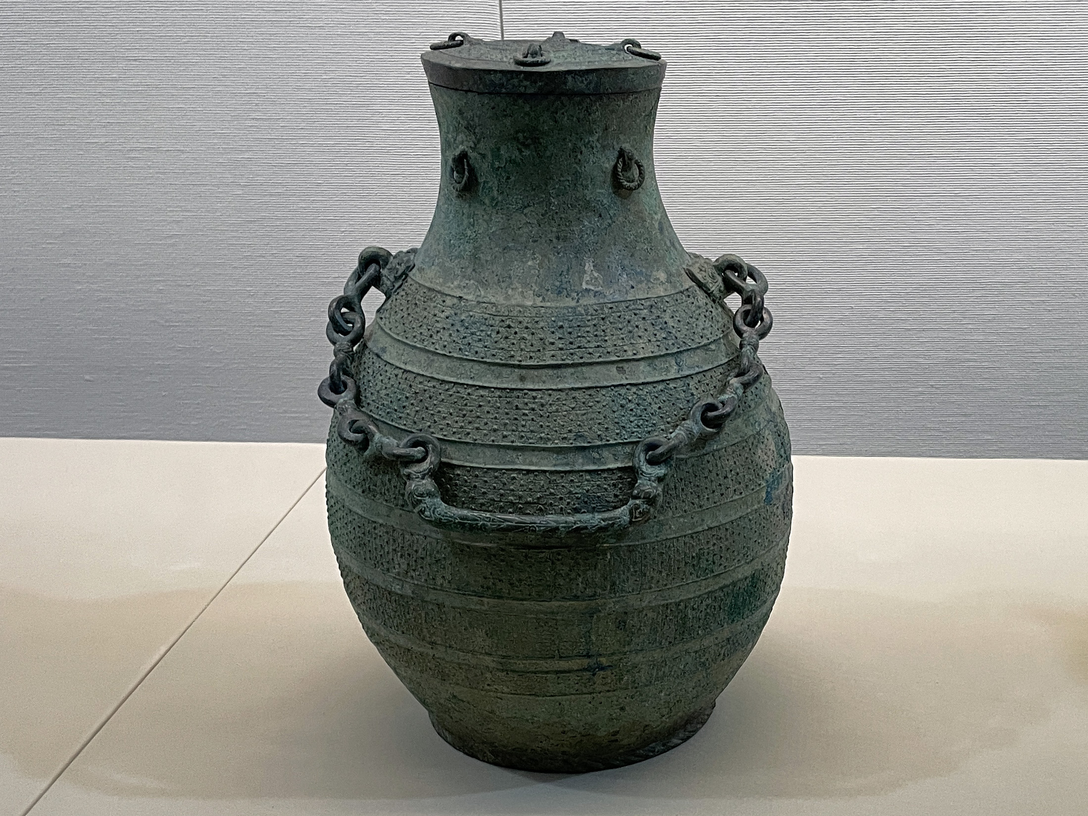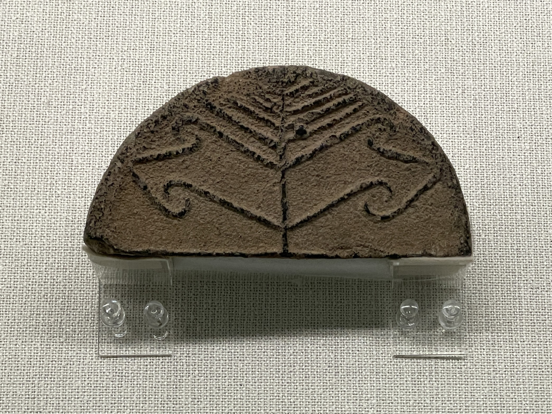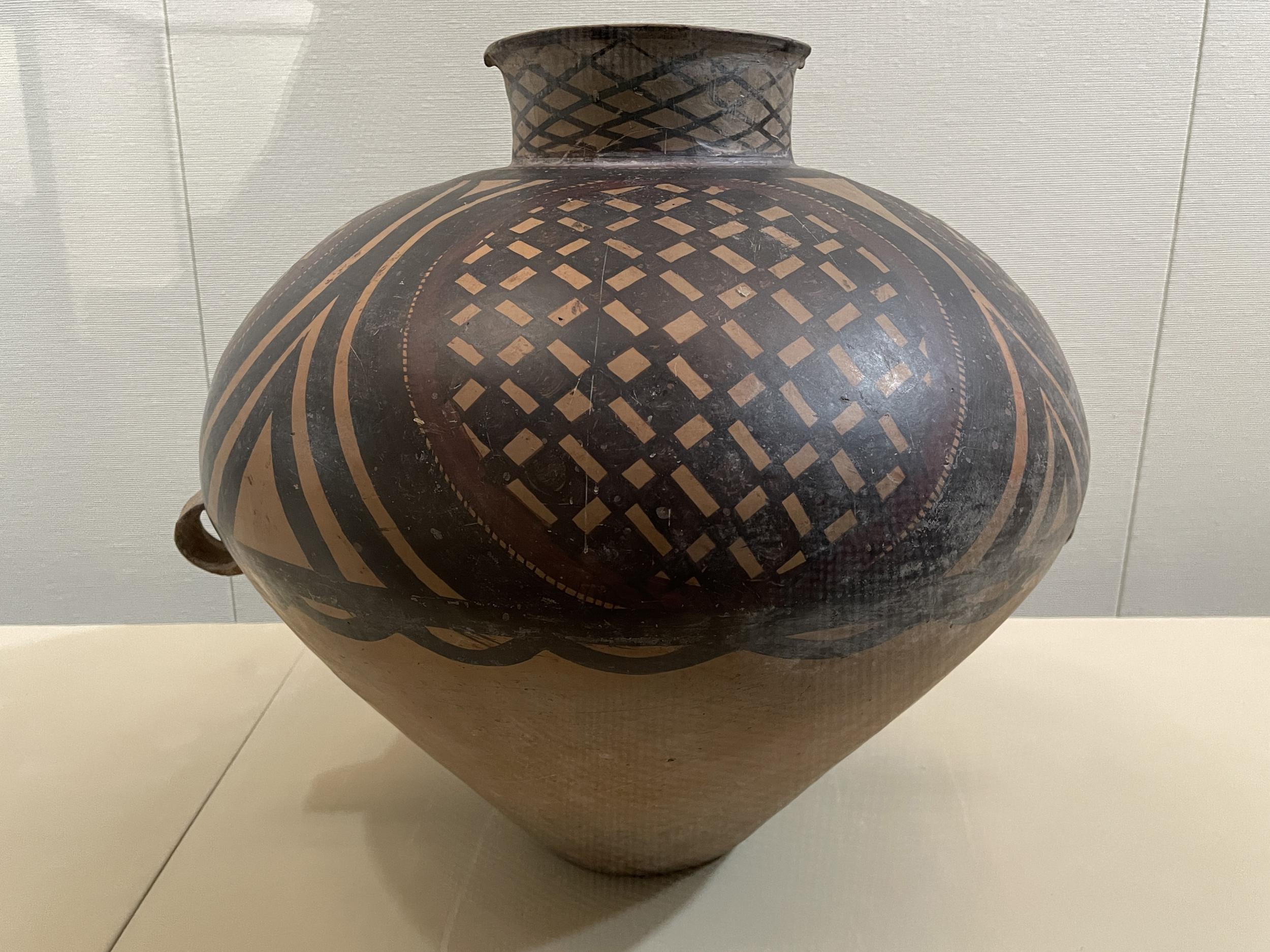 まるで木製のような軽快感を感じさせる顔料で彩色された土器、円文双耳壺(えんもんそうじこ)。新石器時代(紀元前3000〜2000年)と紹介されていたものの、デジタルミュージアムでは甘粛・仰韶文化(紀元前4000−同2000)の後半期とありました。こちらは長江文明ではなく黄河文明。