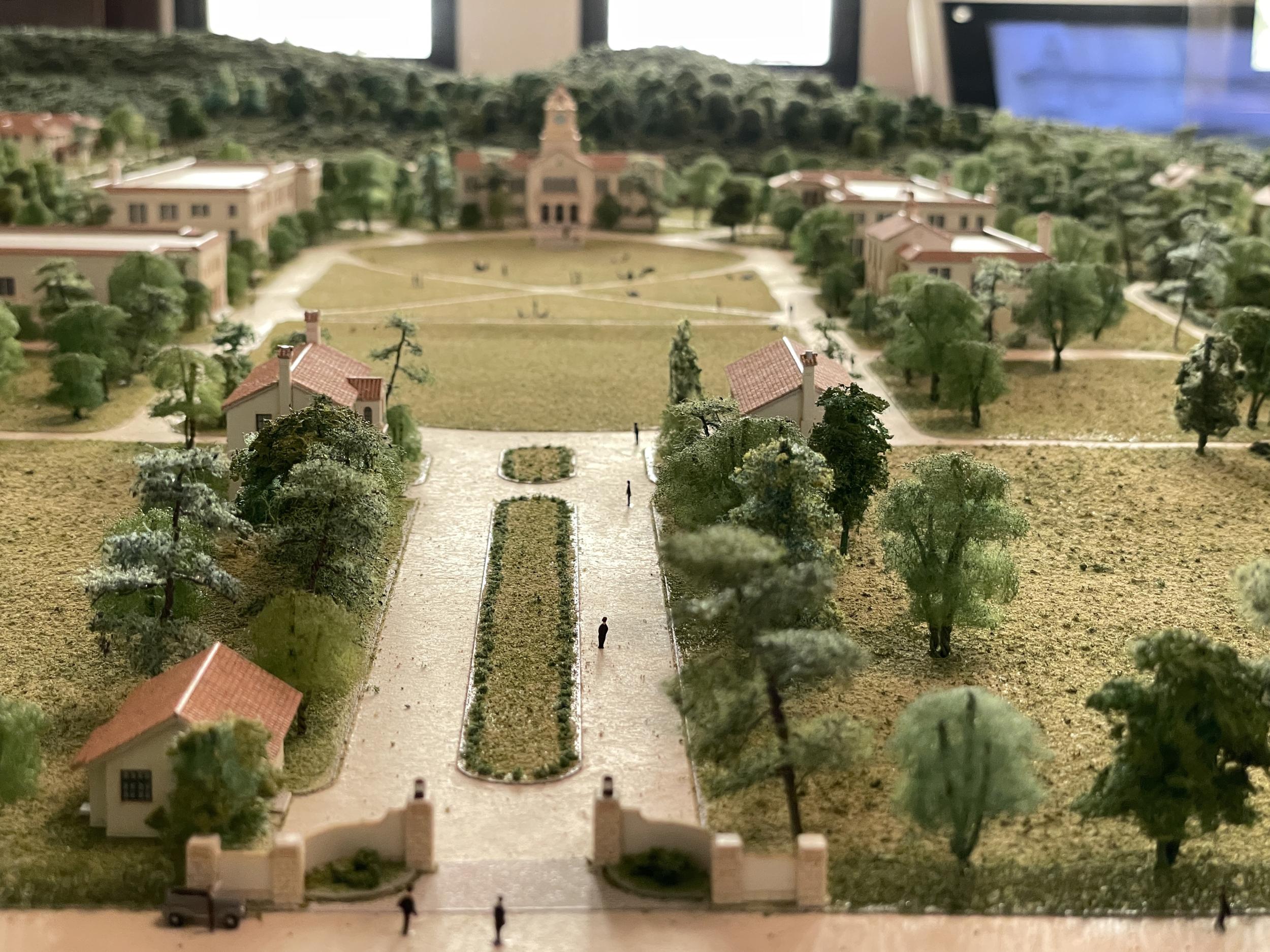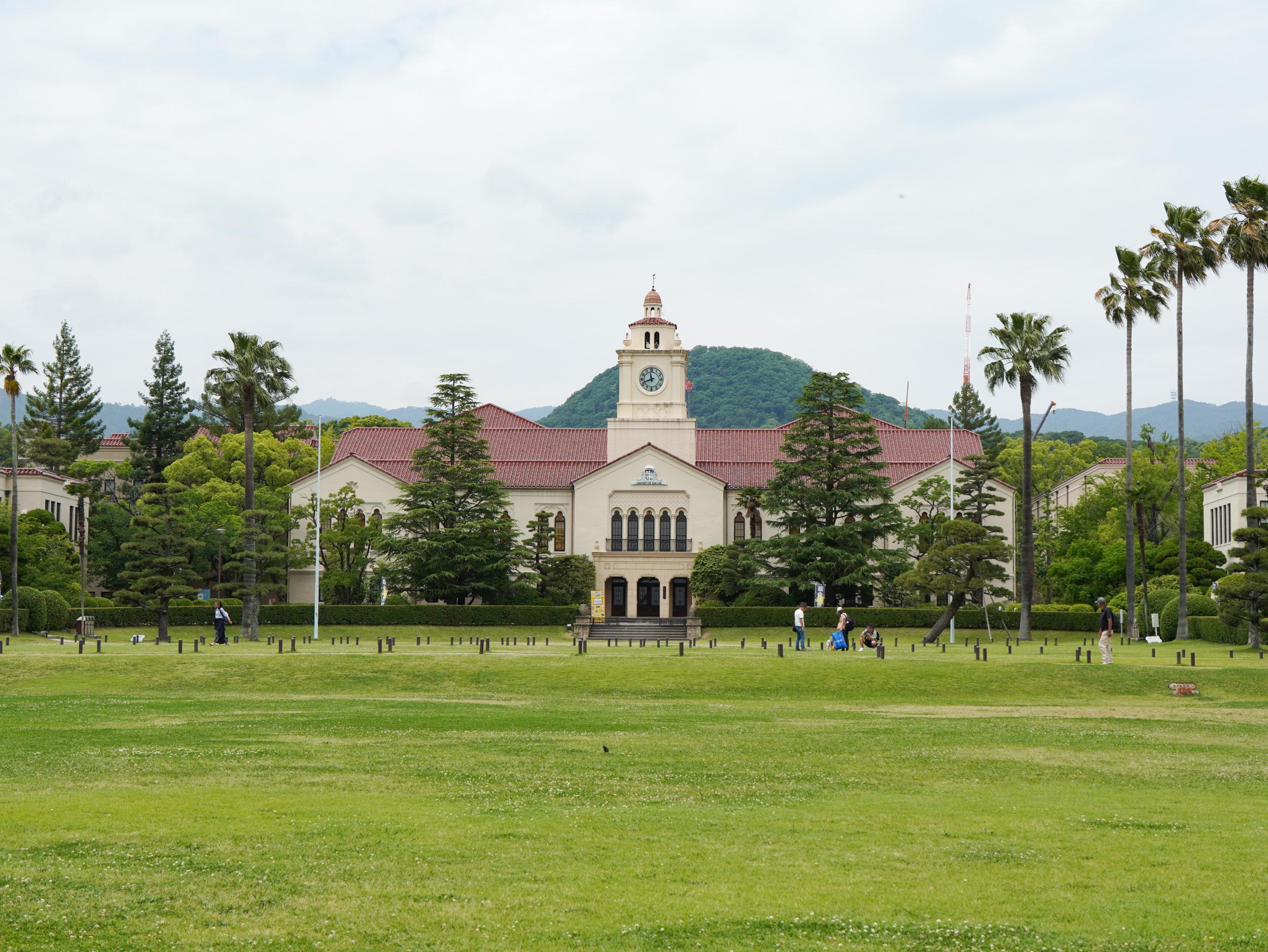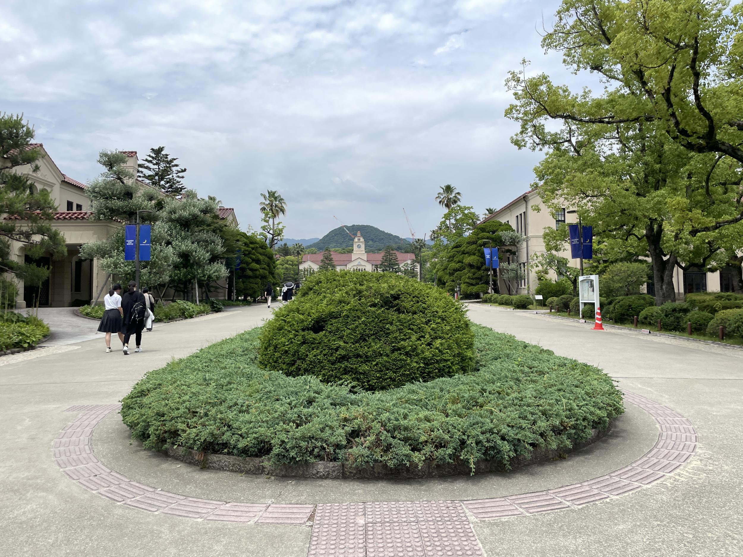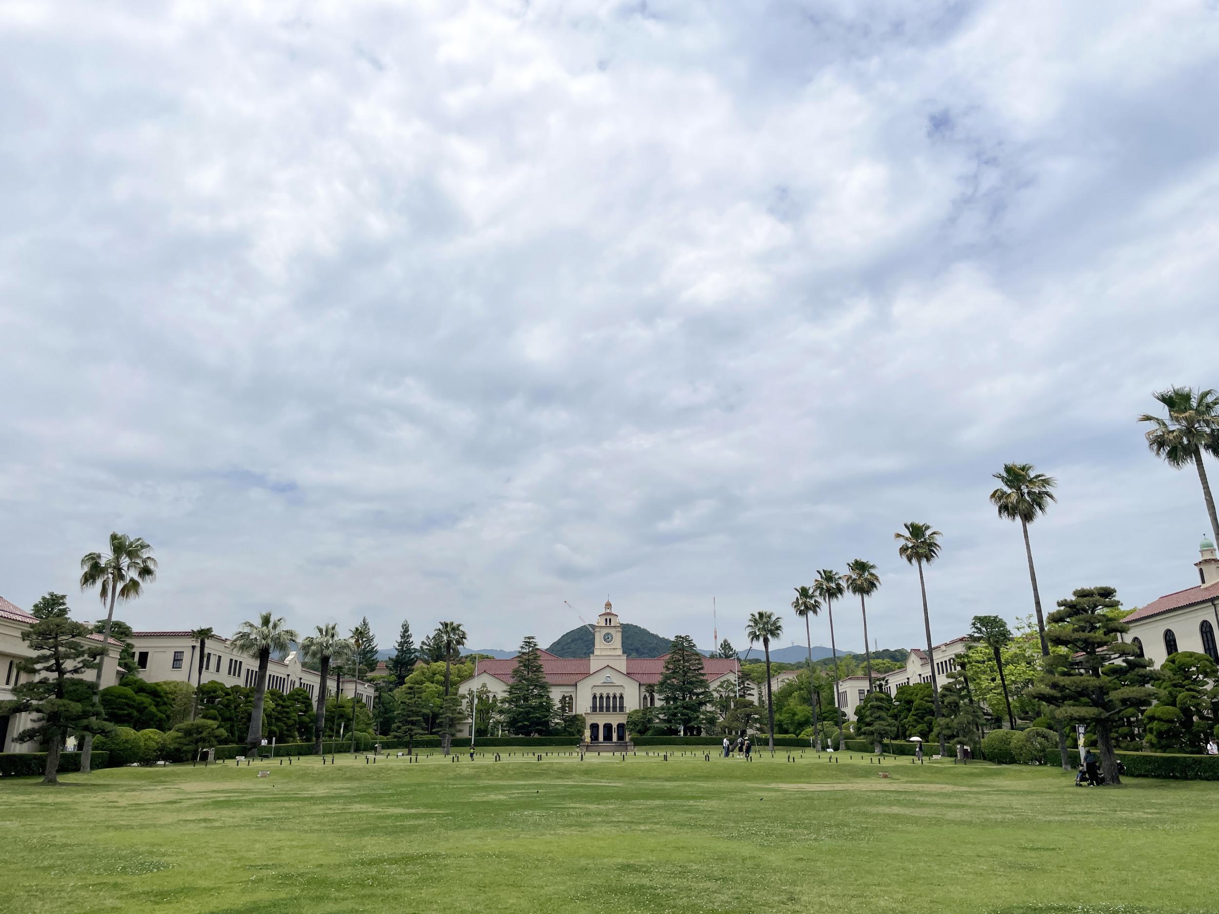中央芝生にやってきました。右手に神学部と文学部、左手は経済学部とパイプオルガンも設置された中央講堂でその奥に商学部。右手は理念的研究分野、左手は実業的研究分野で、その中央で両者を統合するのが関学のシンボルとなる甲山を借景にした時計台だそうです。青空じゃないのが残念ですが、全国でも有数の美しいキャンパスであることは間違いないかと。