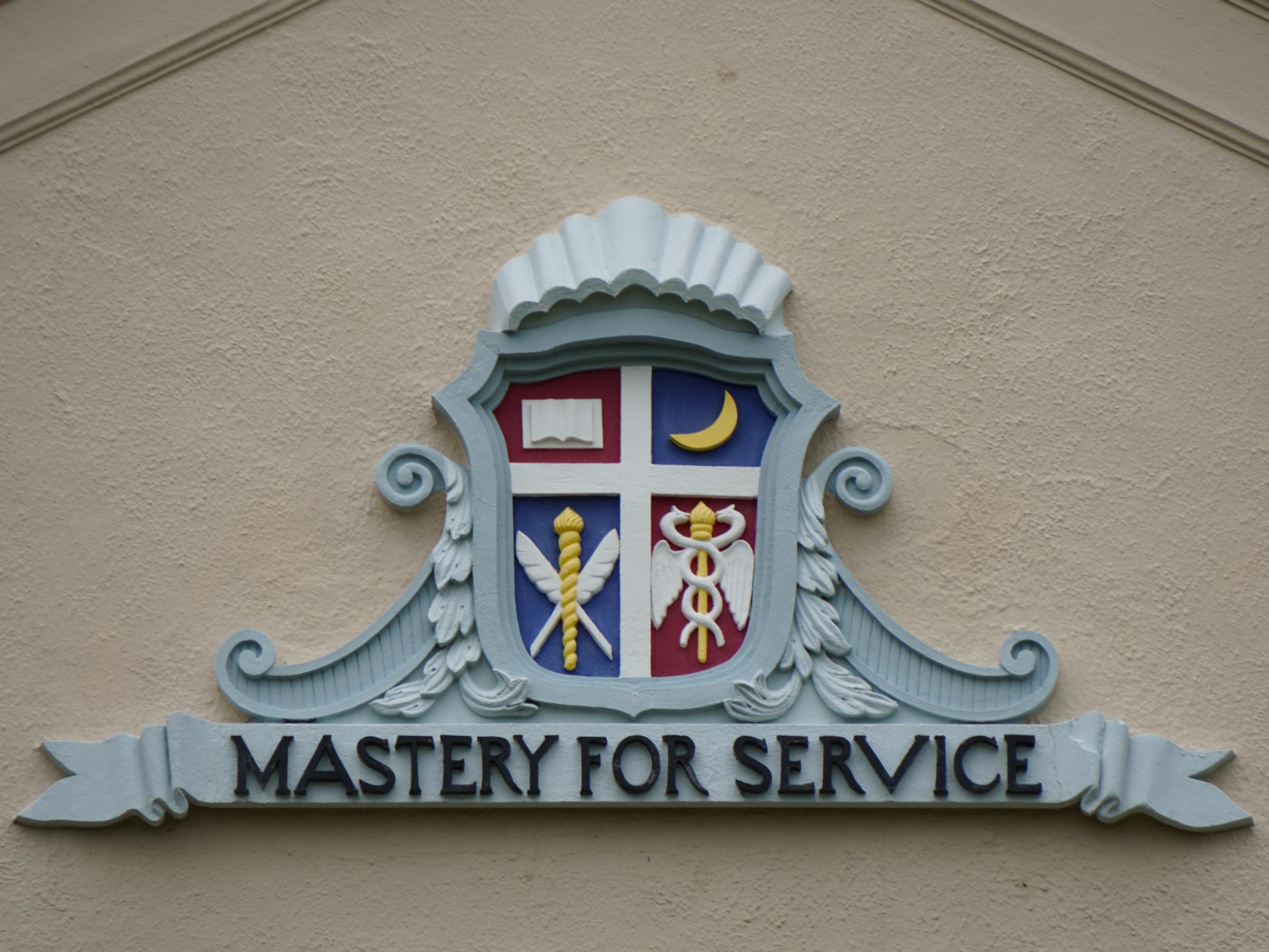 時計台に付けられた関学のエンブレム、スクールモットーのMASTERY FOR SERVICE(隣人、社会、世界に奉仕するために自らを鍛錬)を土台に十字架が立ち、左上の聖書は神学部、右上の校章にもなっている新月は中等部、右下のマーキュリーの杖は商学部、左下の松明とペンは文学部を象徴するそうです。