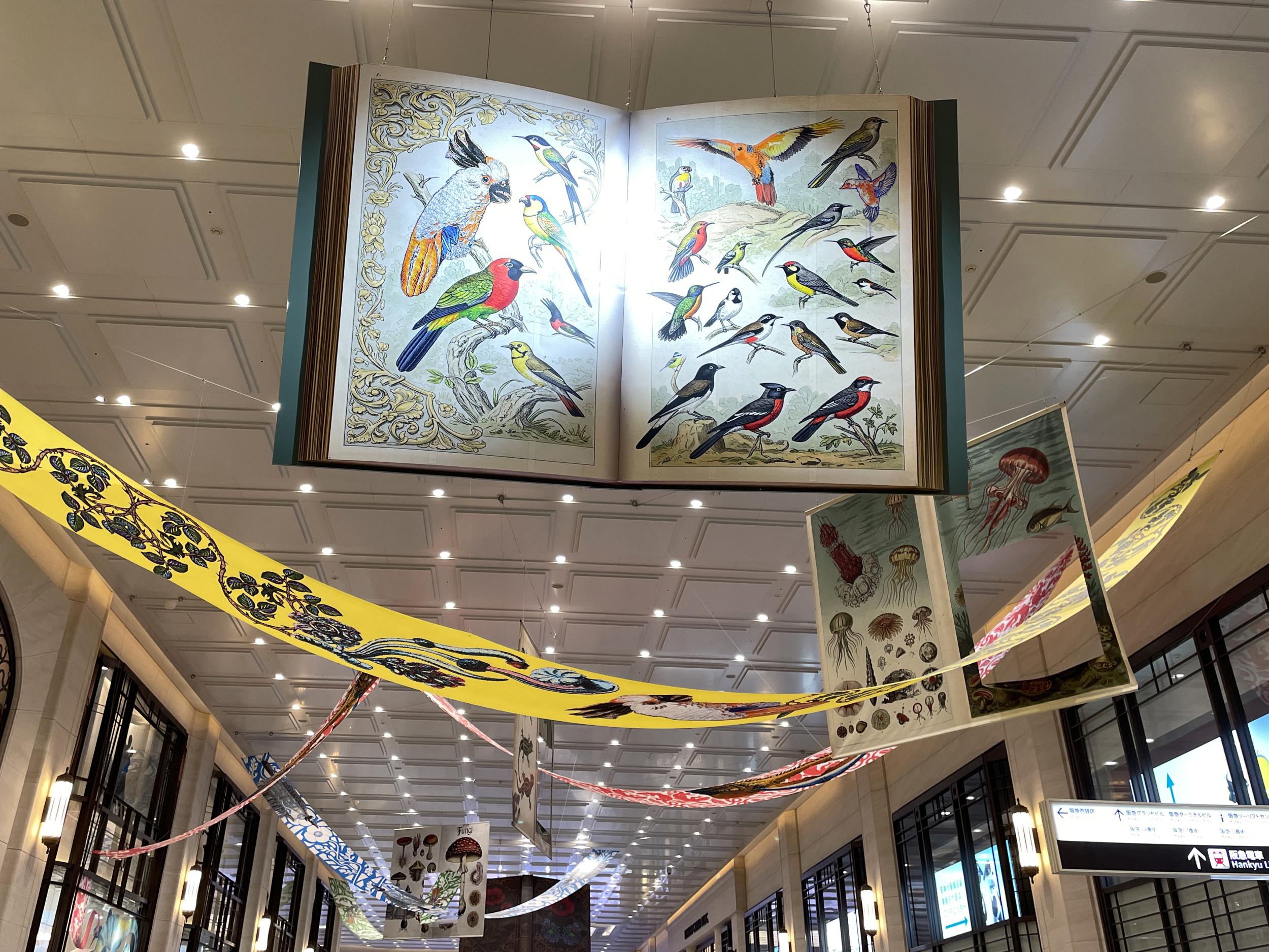 梅田阪急ビルコンコースに鳥の図鑑、シジュウカラやアカハラ、クロツグミに似た鳥もいるものの、微妙に違っていて、実在する鳥なのかよく分かりません。その向こうにはクラゲの図鑑、さらにキノコの図鑑。このコンコースは国鉄の北側に移転する前の阪急梅田駅ですが、自分が通学していた頃はすでに移転完了、ムービングウォークも設置されていて、阪急三番街や紀伊國屋書店もありました。