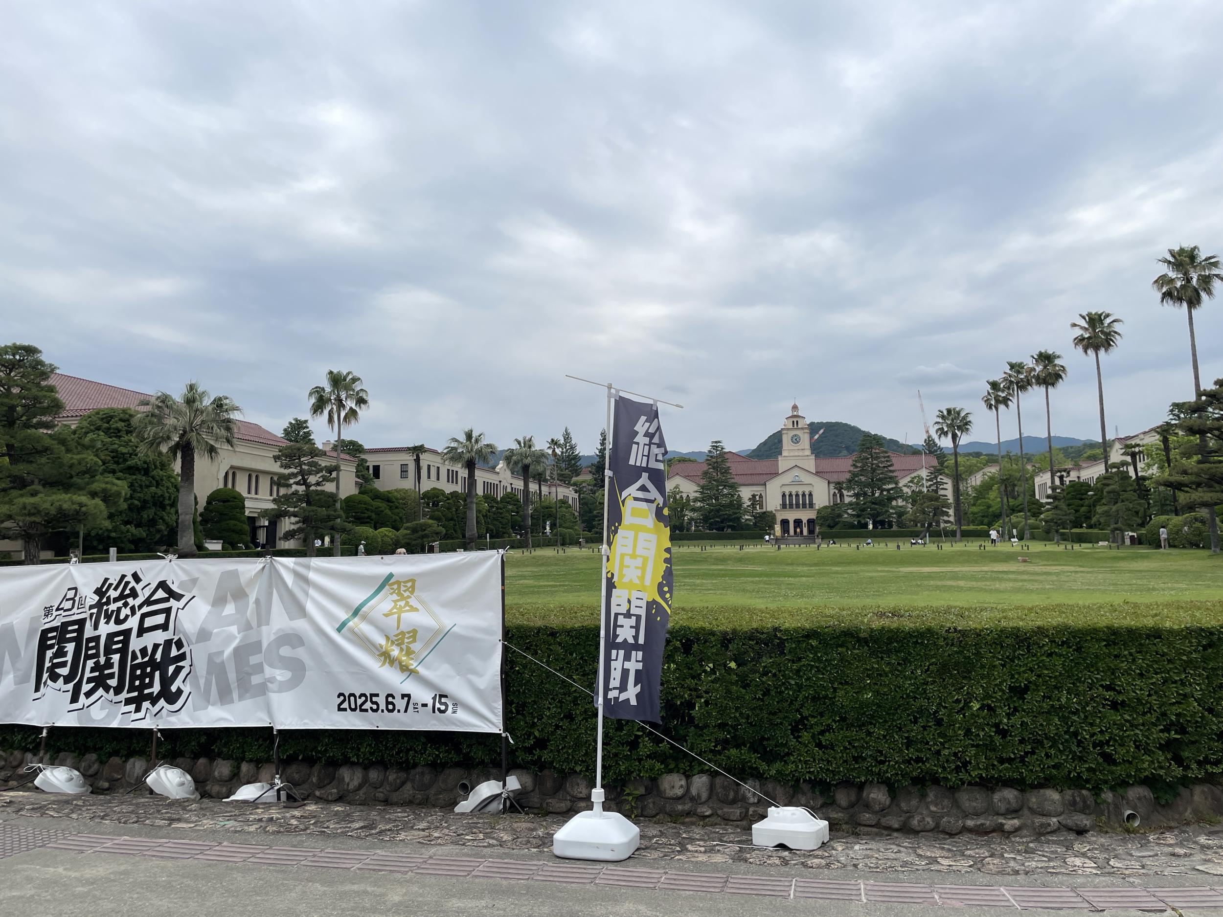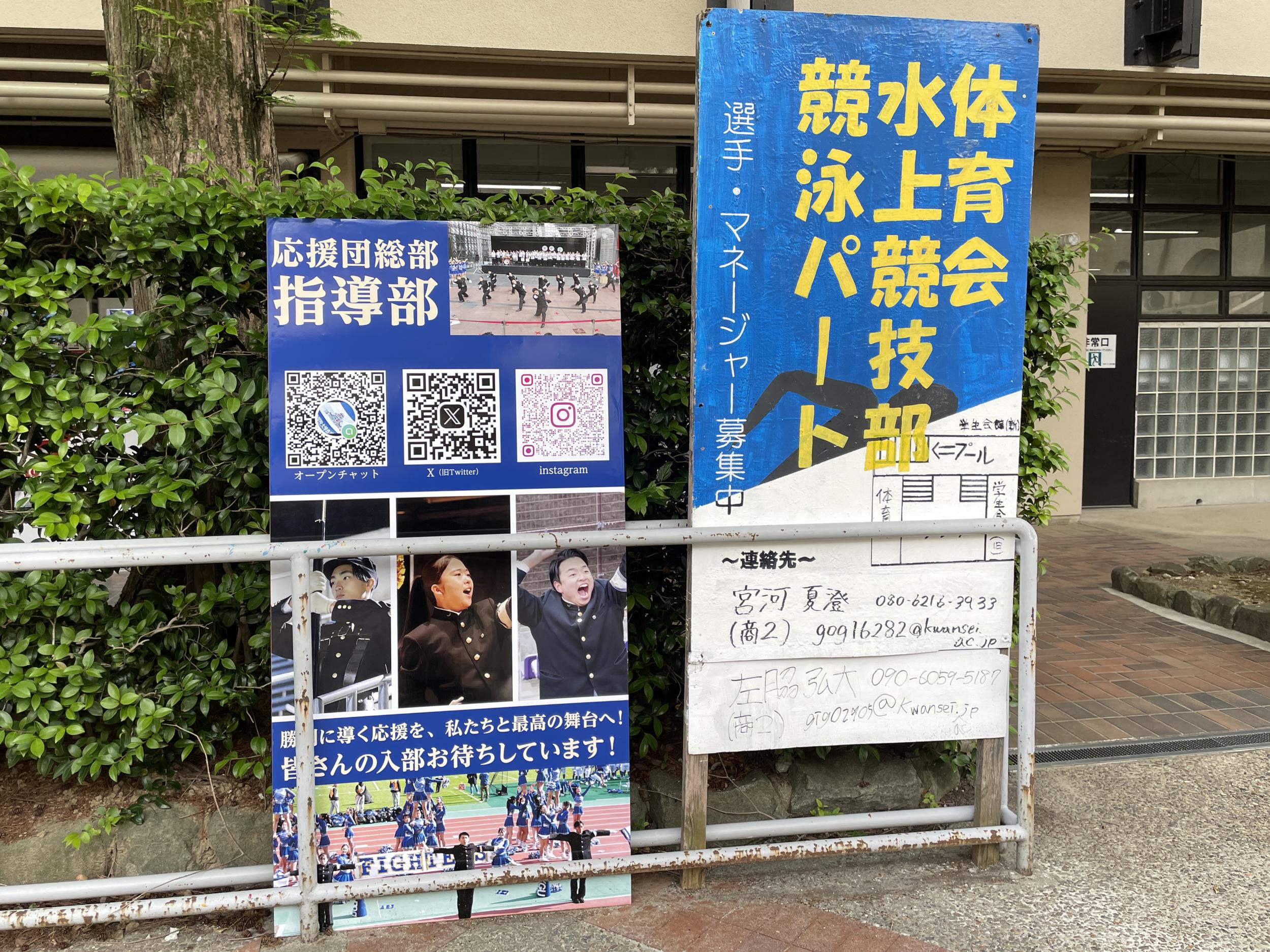 体育館前に立てられた応援団総部指導部の看板、同志社の紫に対して、関学のスクールカラーは紺色。応援団総部歴代団長には女性も、第73代団長岸本ゆずかさん、めちゃかっこいい。自分の在学中はどおくまんの花の応援団の頃、想像の域をはるかに超えた変化です。