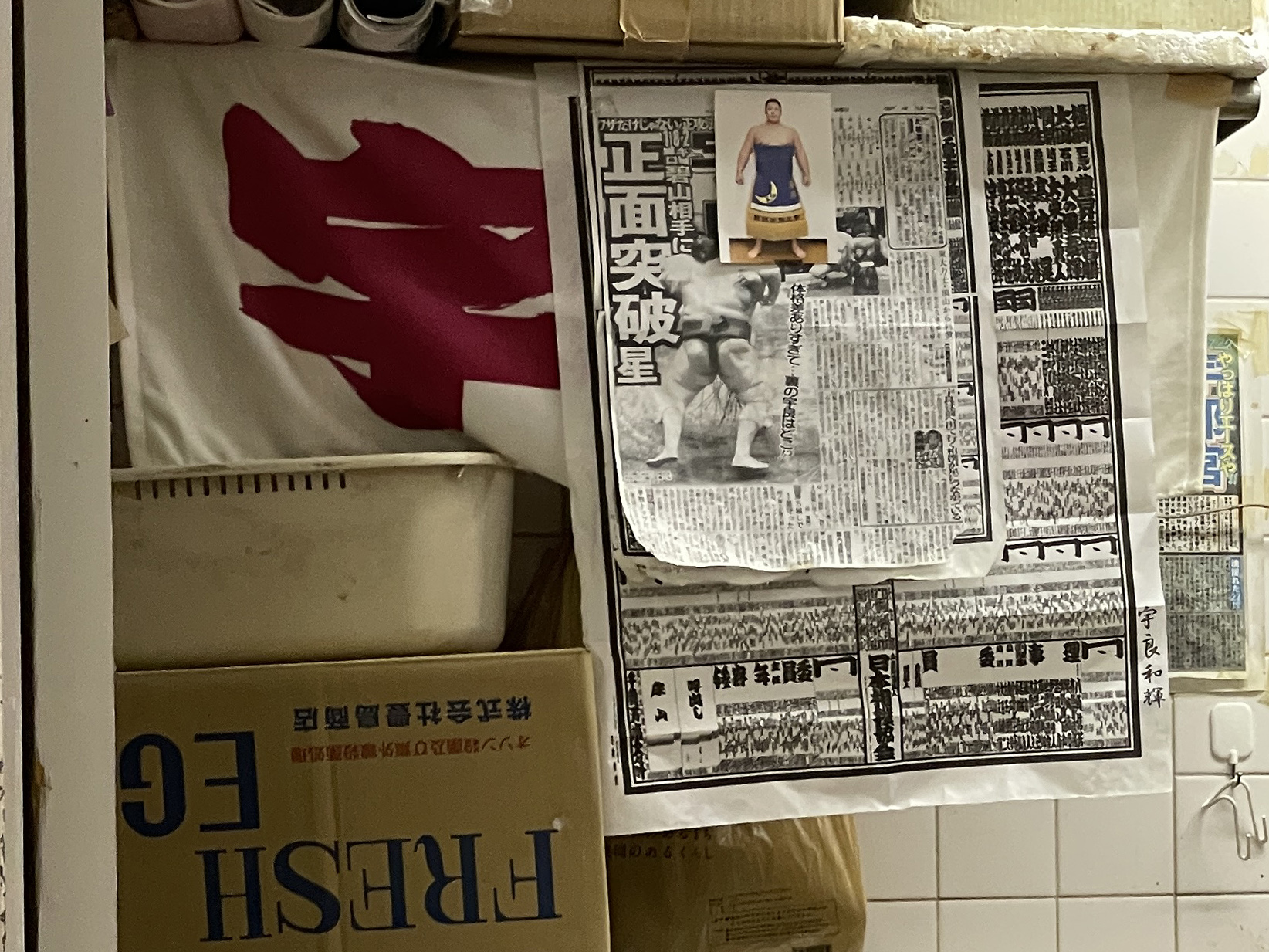 厨房に宇良関の写真とデイリースポーツ、番付表、応援タオル。番付表は東横綱豊昇龍、東小結高安、東前頭五枚目宇良なので、この五月場所のもの、右下隅にサイン付き。新聞は令和四年五月場所11日目の碧山戦、青いKG化粧まわしの宇良関は今より小さめです。