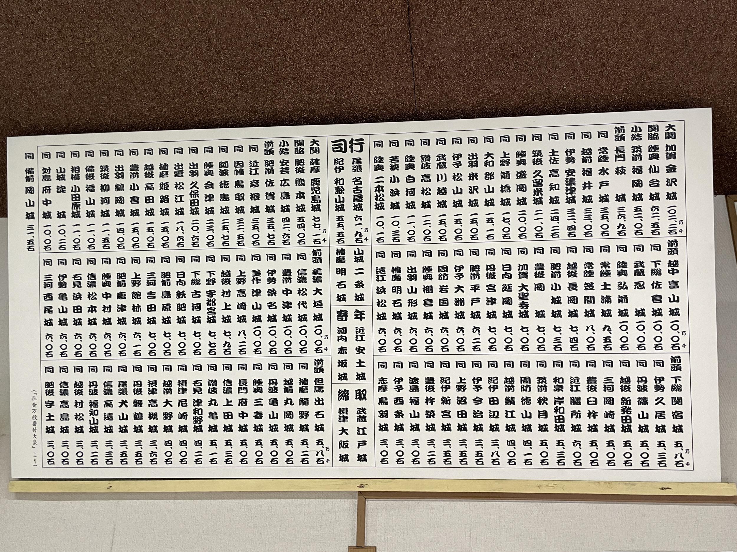 全国お城番付が掲げられていたいました。大坂城ではなく大阪城とあるので明治のものと思われます。石高順の番付でやはり加賀金沢が図抜けています。和歌山は行事役。今なら人気順で東の横綱はやはり姫路かと。