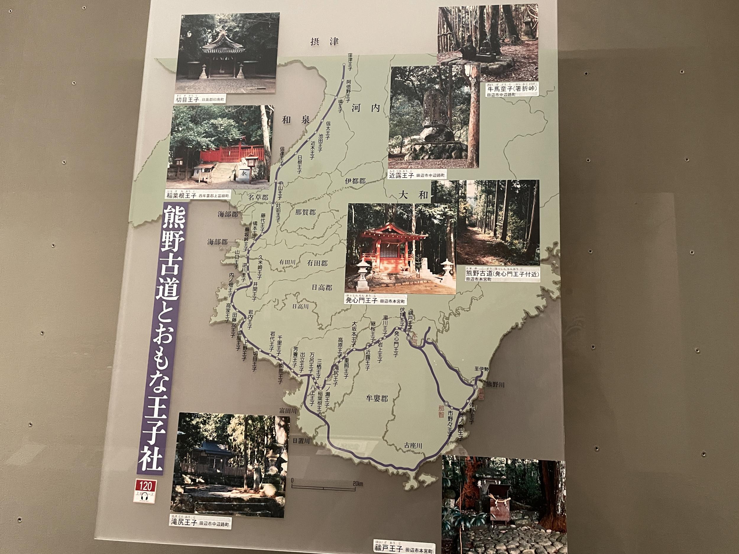 熊野詣関連の史料はかなり充実。熊野古道とおもな王子社のパネルです。千里王子と岩代王子は訪ねたことがあります(海辺の熊野古道)。