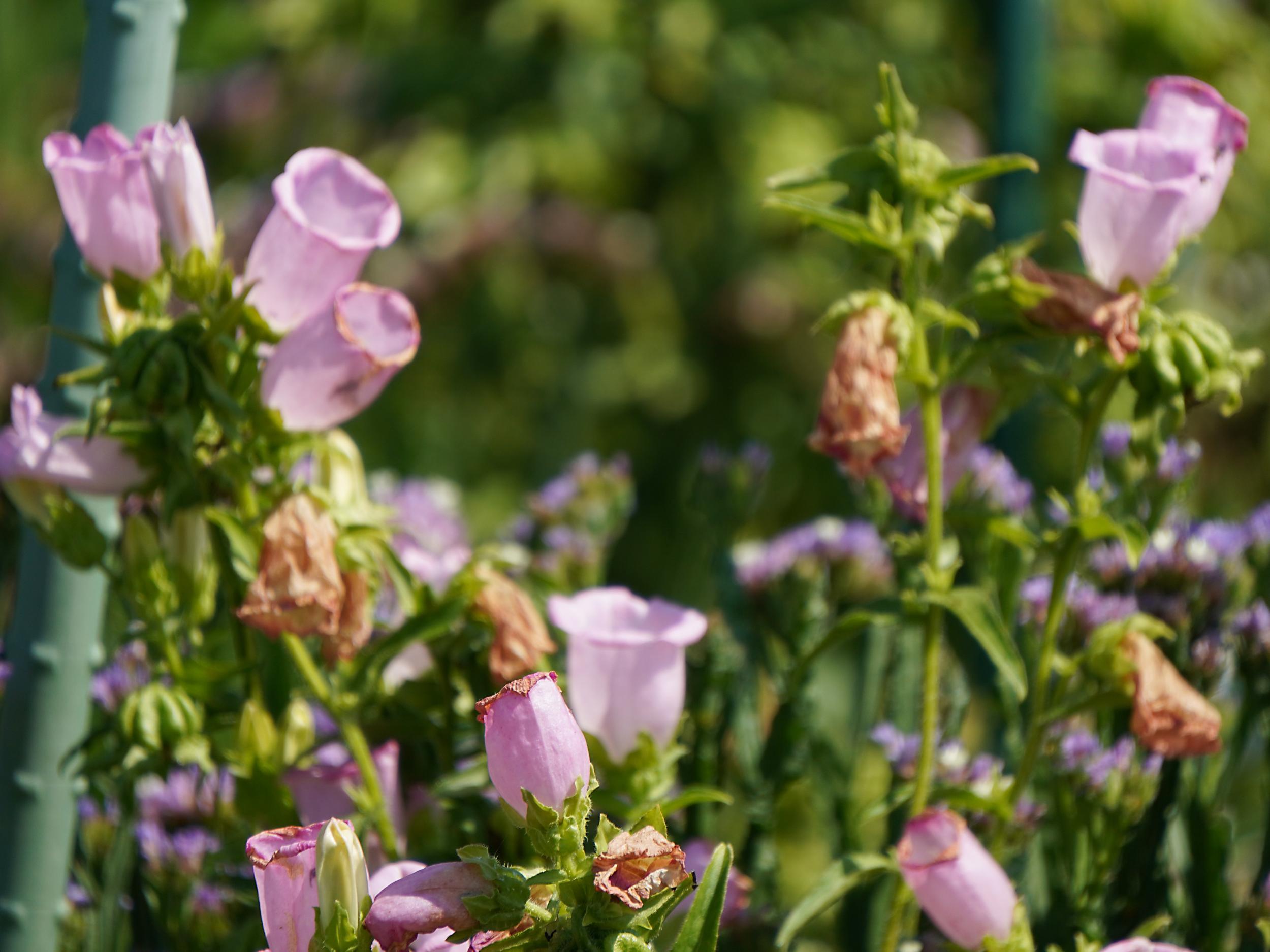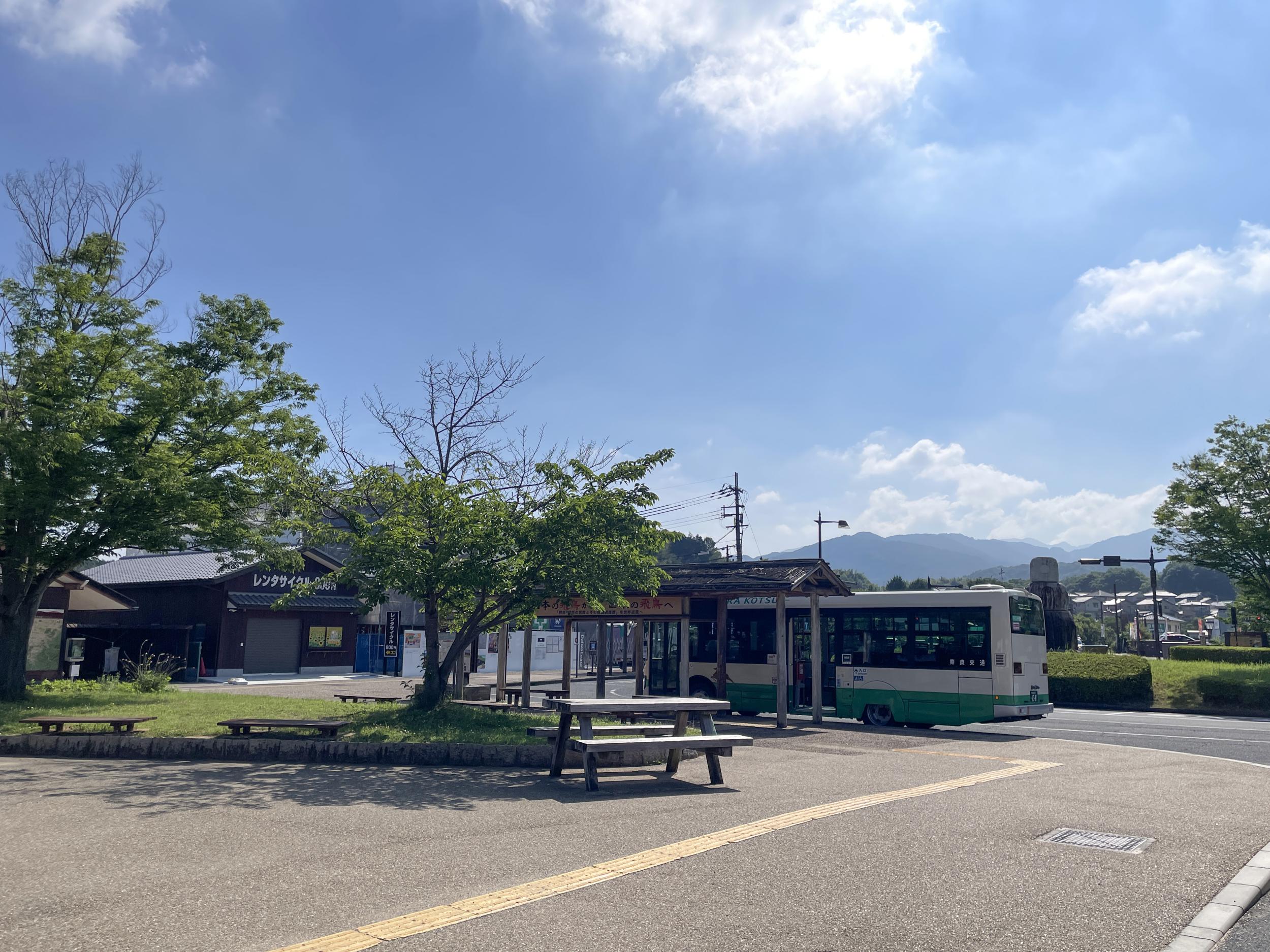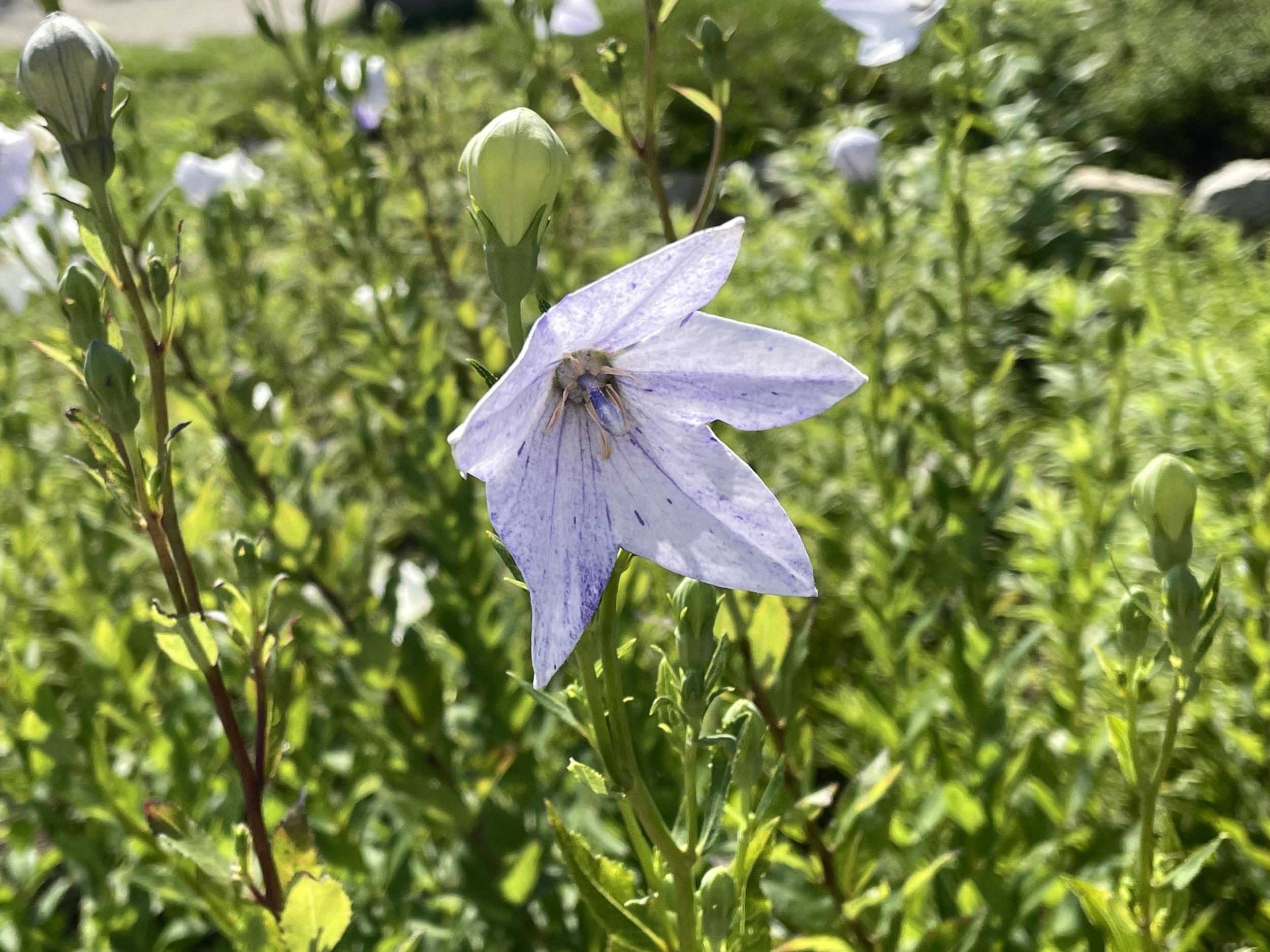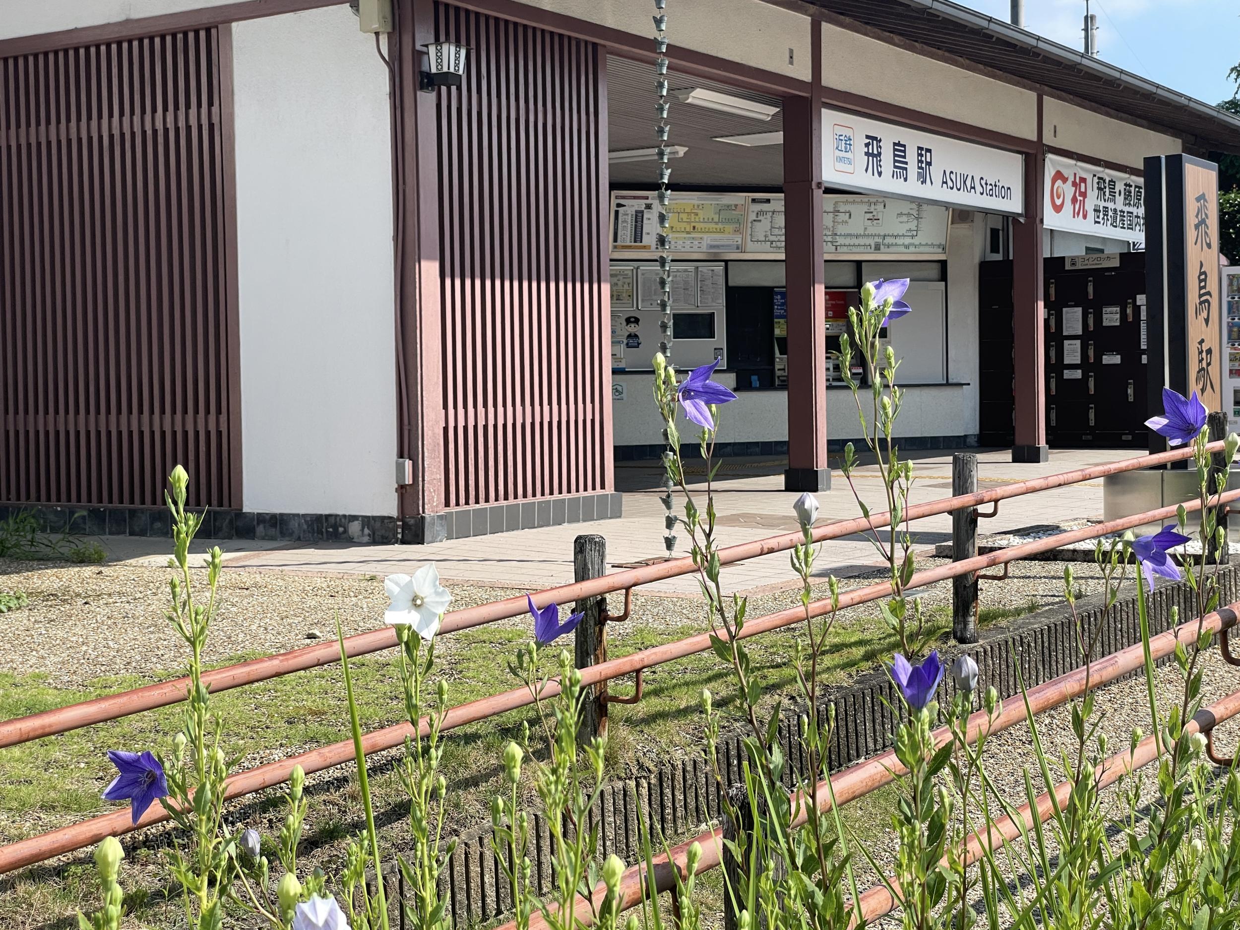 飛鳥駅に到着、この駅に降り立つだけでワクワクします。駅前の花壇にキキョウがいっぱい。