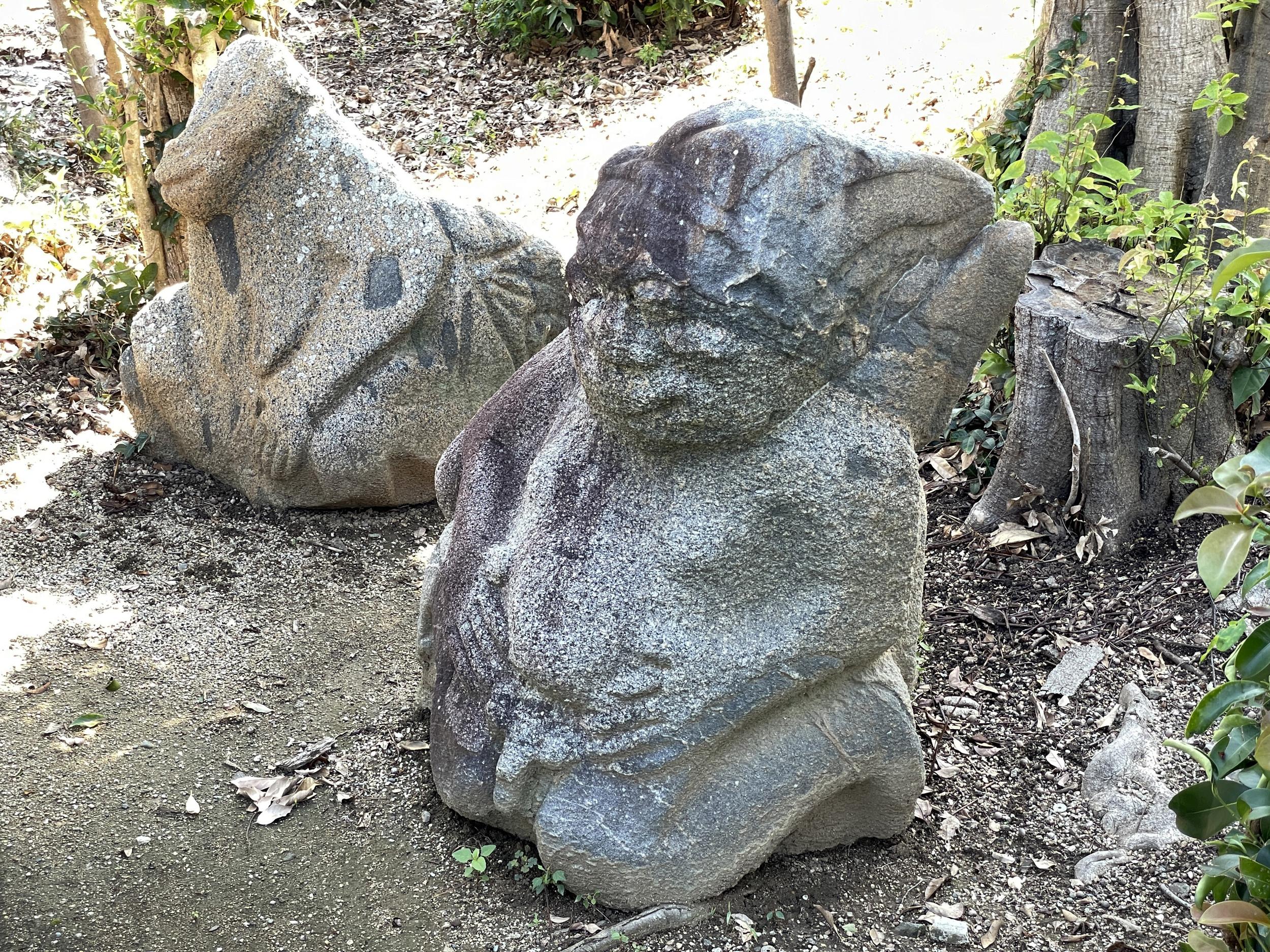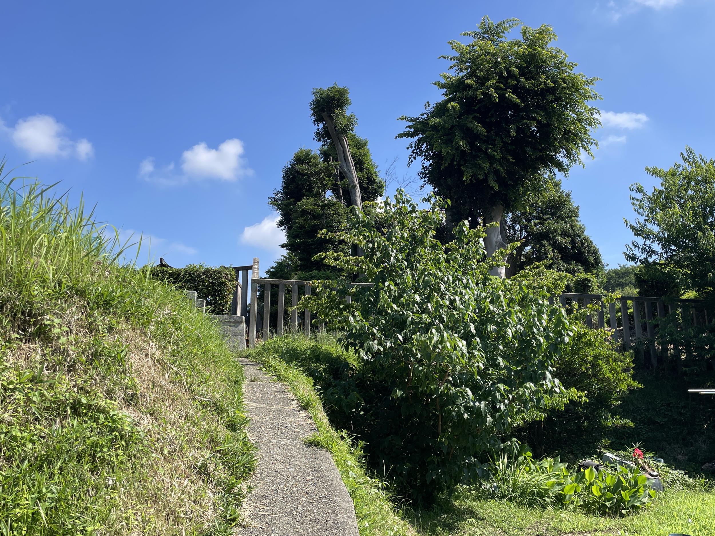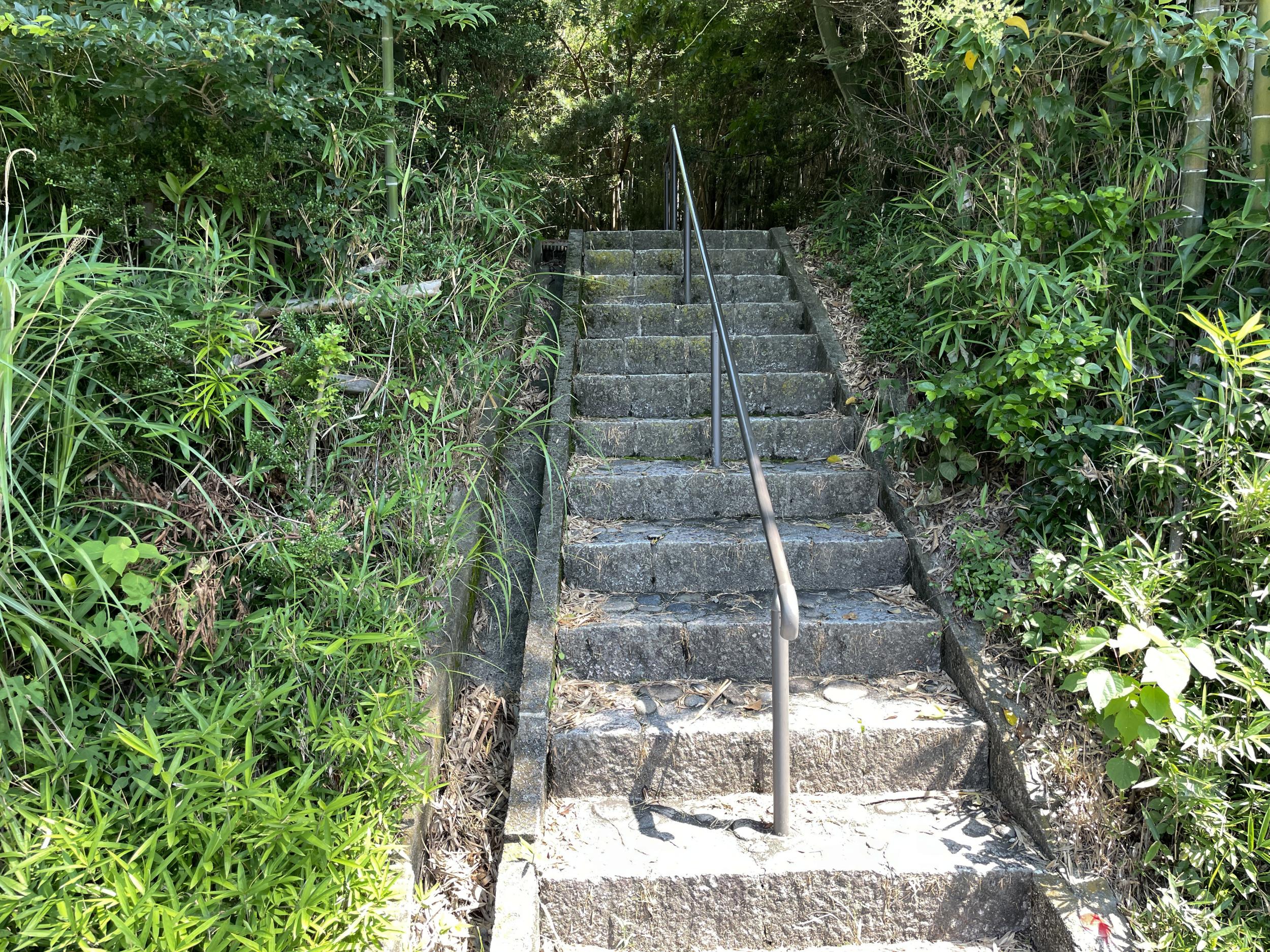 石段を上りきると眺めが広がりました。益田岩船から牽牛子塚古墳へ遠回りして歩いた橿原市白橿町付近です。シュロの木右手は住宅が密集している橿原市、シュロの木左手は緑の谷が広がる明日香村とくっきり分かれています。山並みの右端当たりが益田岩船、画面左奥に顔をのぞかせているのは大和葛城山です。