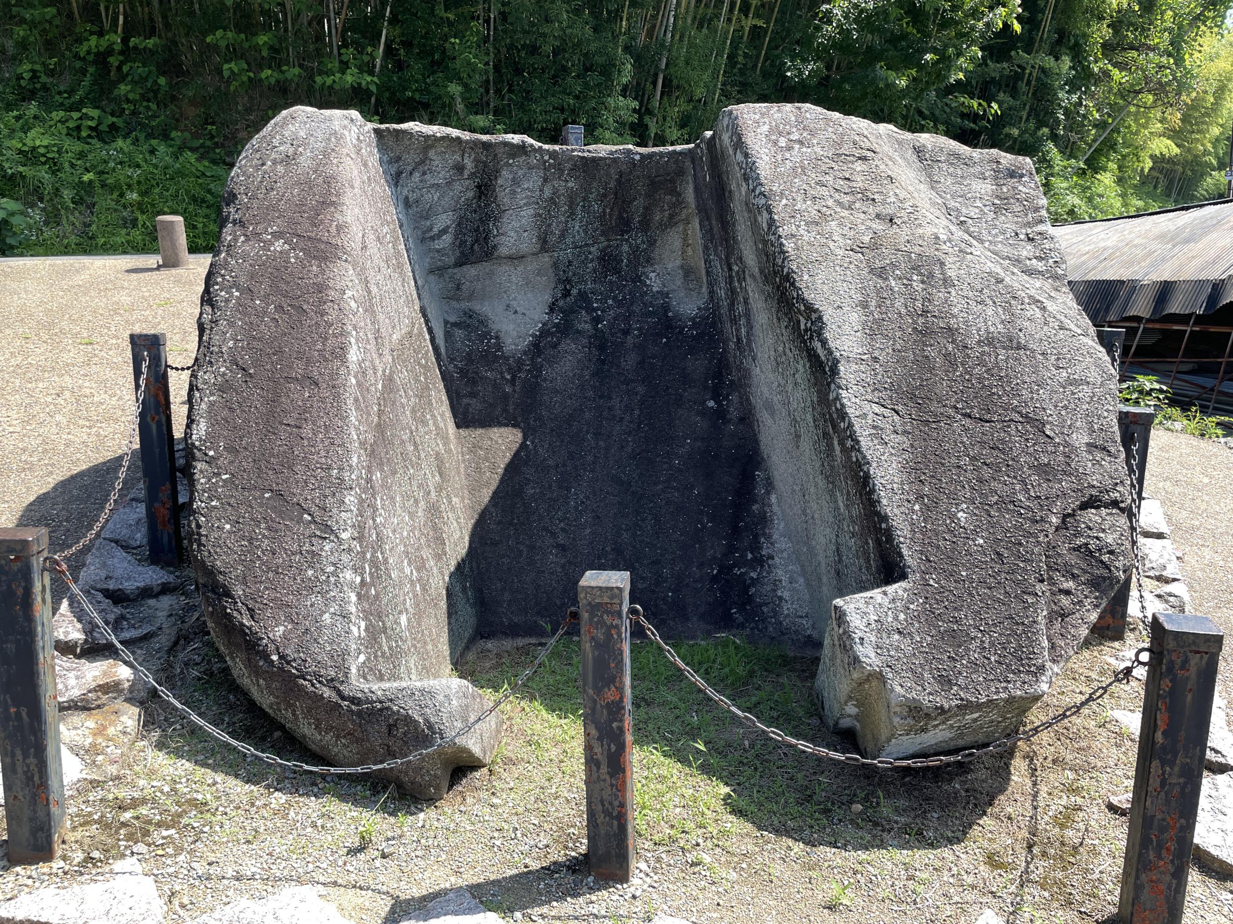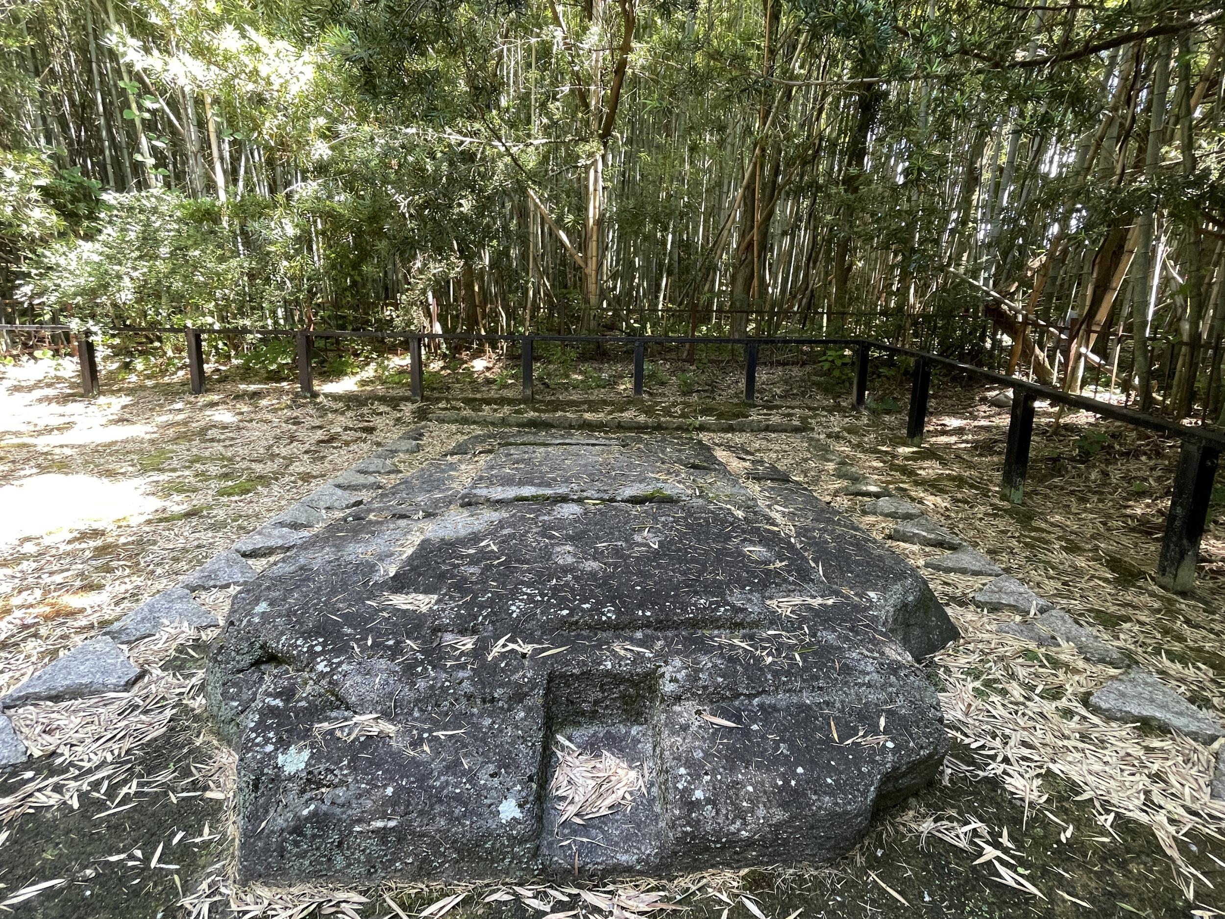 歩いてきた道の左手に石段があって上ってみると鬼の俎。鬼の雪隠と同じ石室の底石で、雪隠の方はこの場所から転がったものらしい。雪隠脇のQRコードから河瀨直美さんの解説で鬼の雪隠、鬼の俎と呼ばれる理由が分かります。