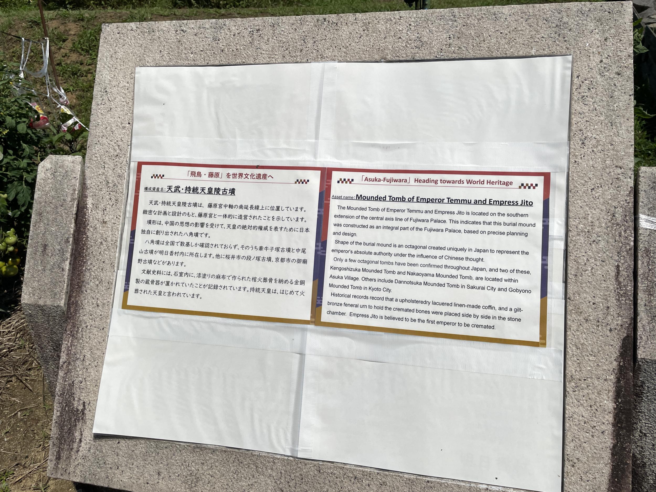 これを設計した人はエライと感じさせる緩やかに弧を描いた石段を下りてくると説明板に貼り紙。Google Mapにアップされた去年2月の写真では貼り紙の下には墳丘復元図と横口式石槨図が描かれており、ピラミッド状の5段築成で周囲に石段が張り巡らされていたこと、石槨には天武天皇の夾紵棺と持統天皇の金銅製骨壺が並べられていたことが確認できます。なぜ貼り紙でこれを隠さなければならなかったのか、この1年で元の説明を訂正しなければならないような発見は無かったはずですが、貼り紙にある「飛鳥・藤原を世界文化遺産へ」の絡みでより正確を帰そうしているのかもしれません。