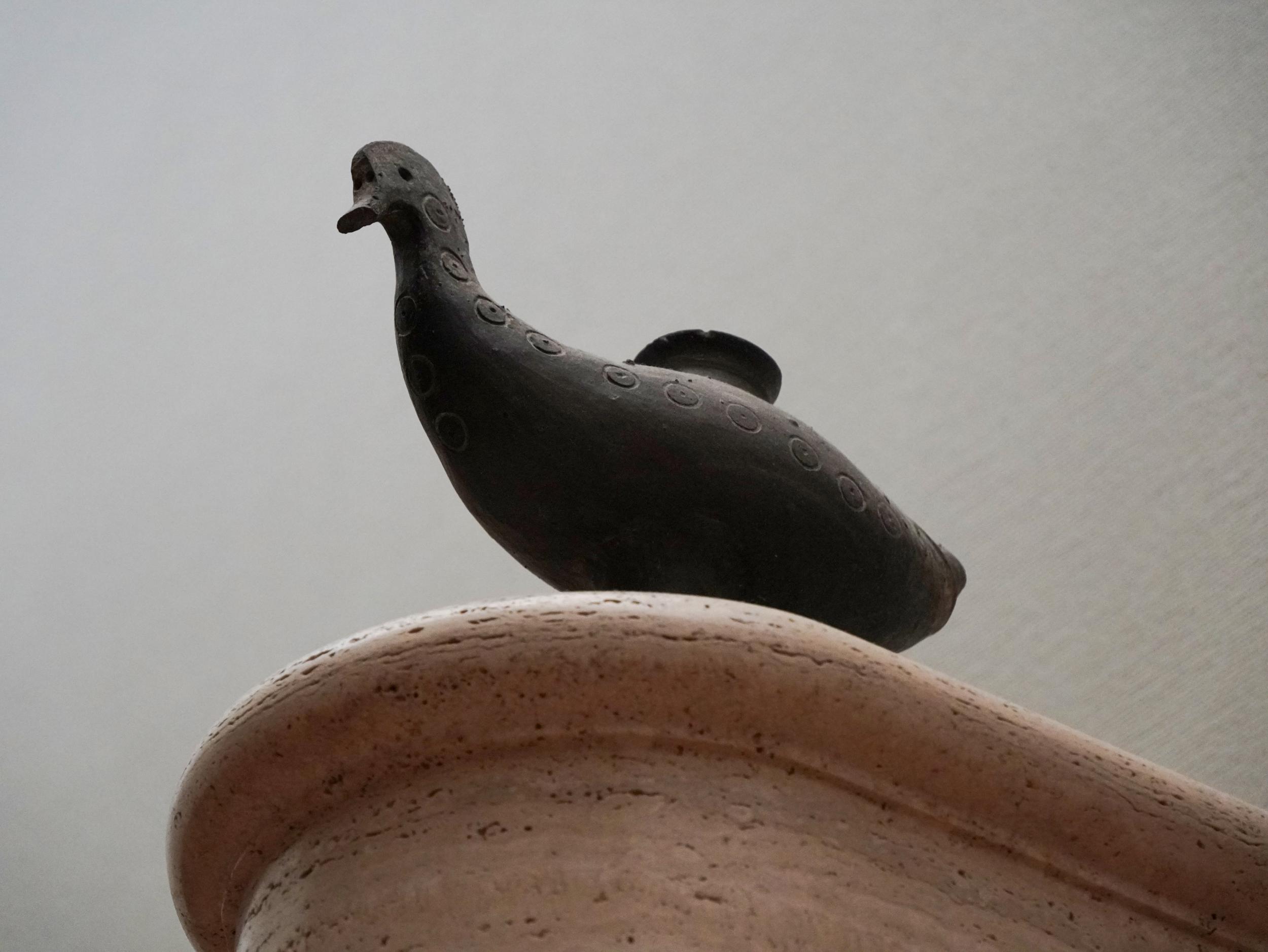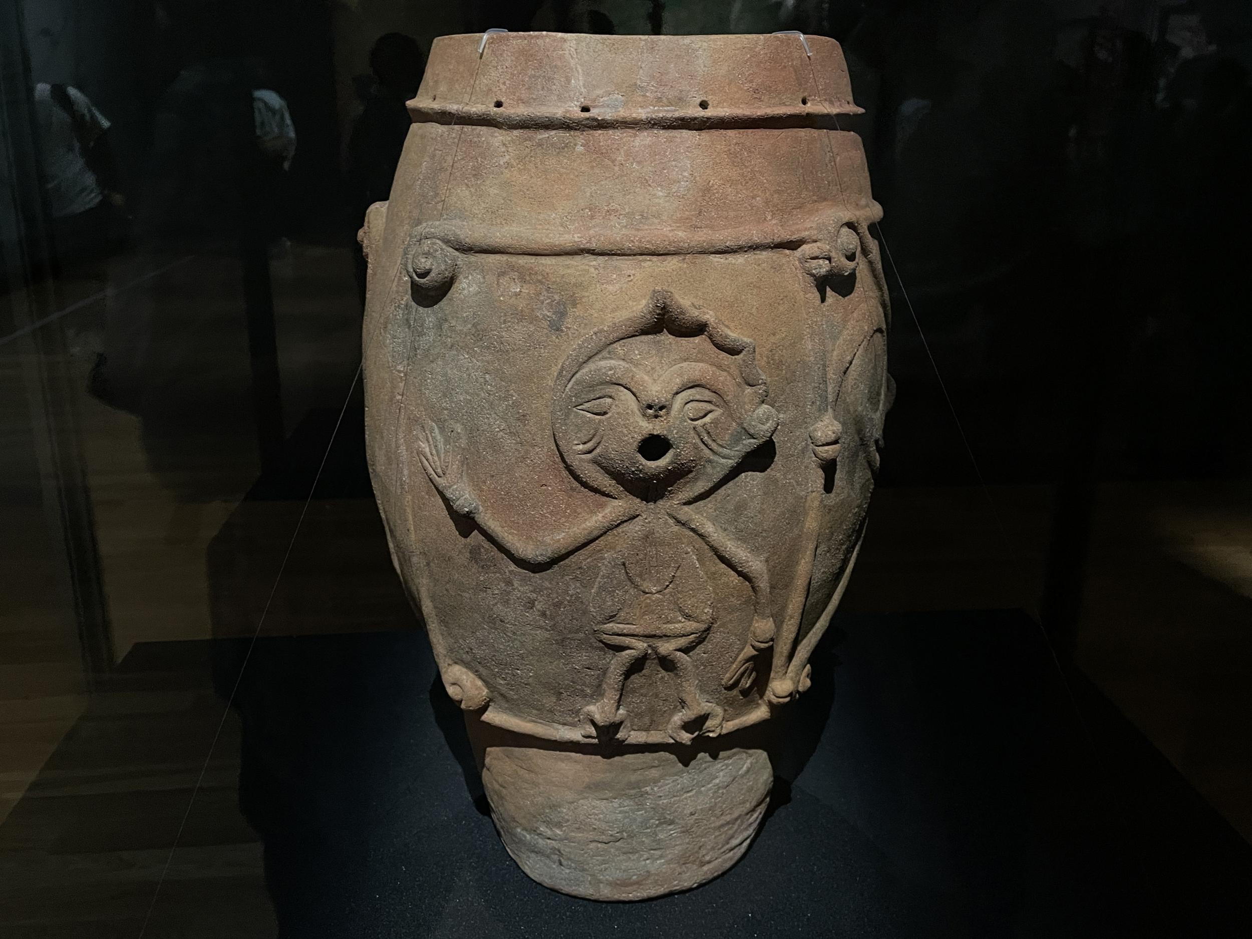 これが見たくてやってきた今日の展覧会、重要文化財「人体文様付有孔鍔付土器」(南アルプス市鋳物師屋遺跡出土、縄文時代中期中葉)、三本指の土偶レリーフがYeah。側面は縄模様だけ。