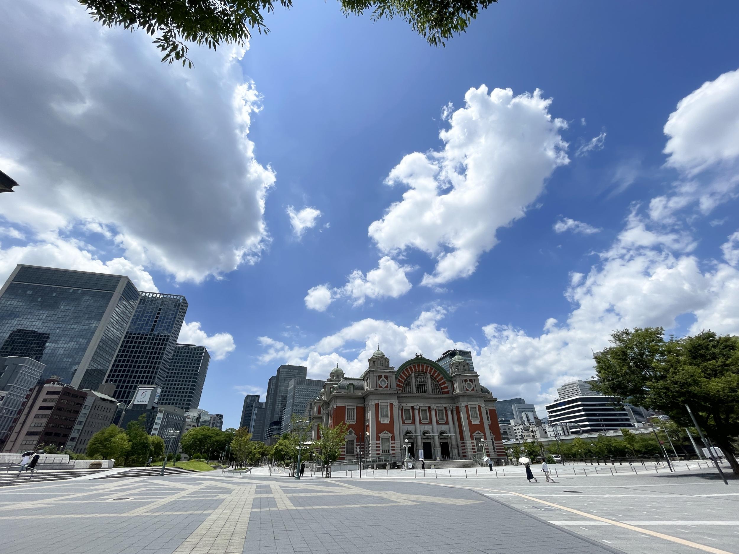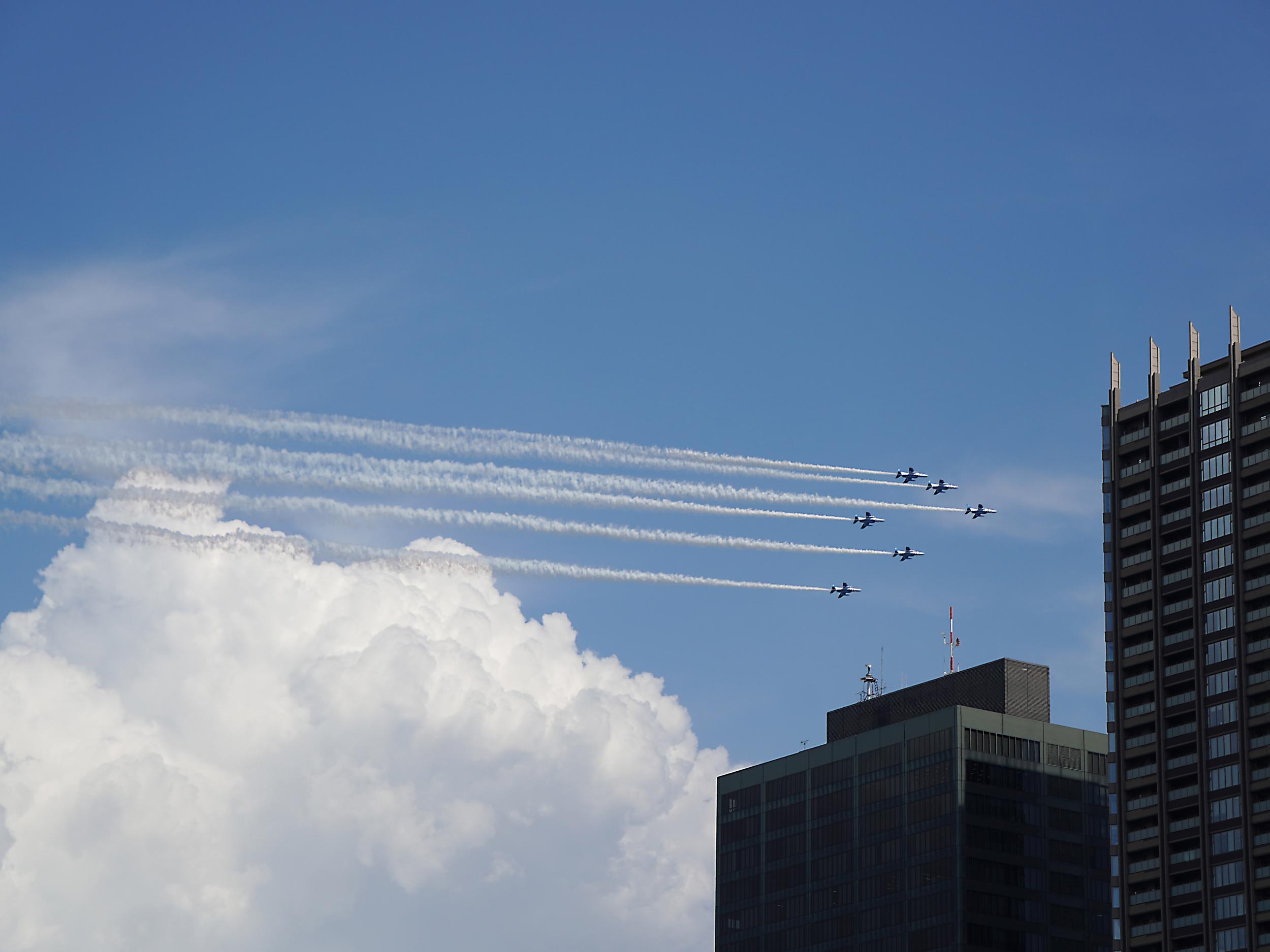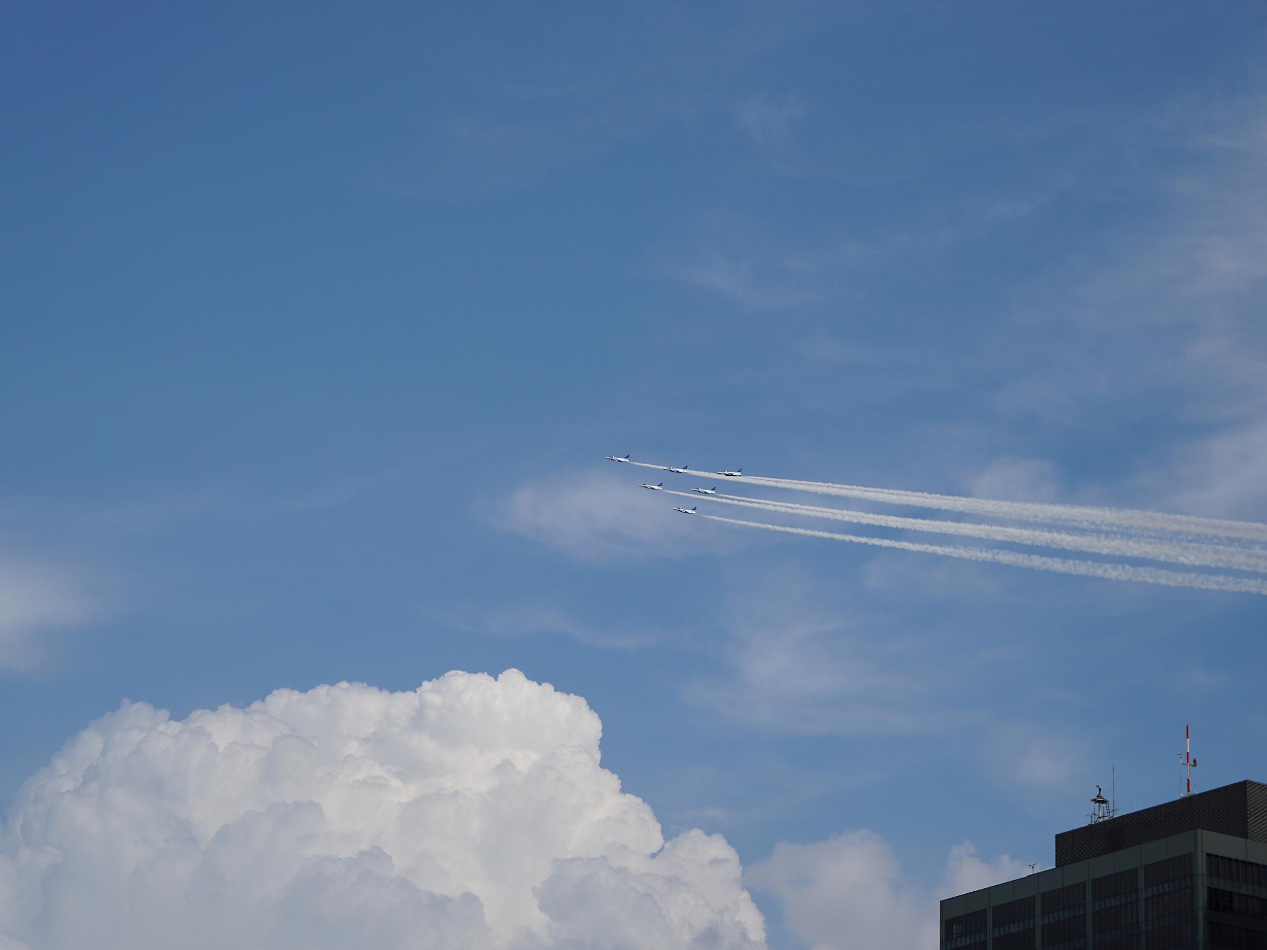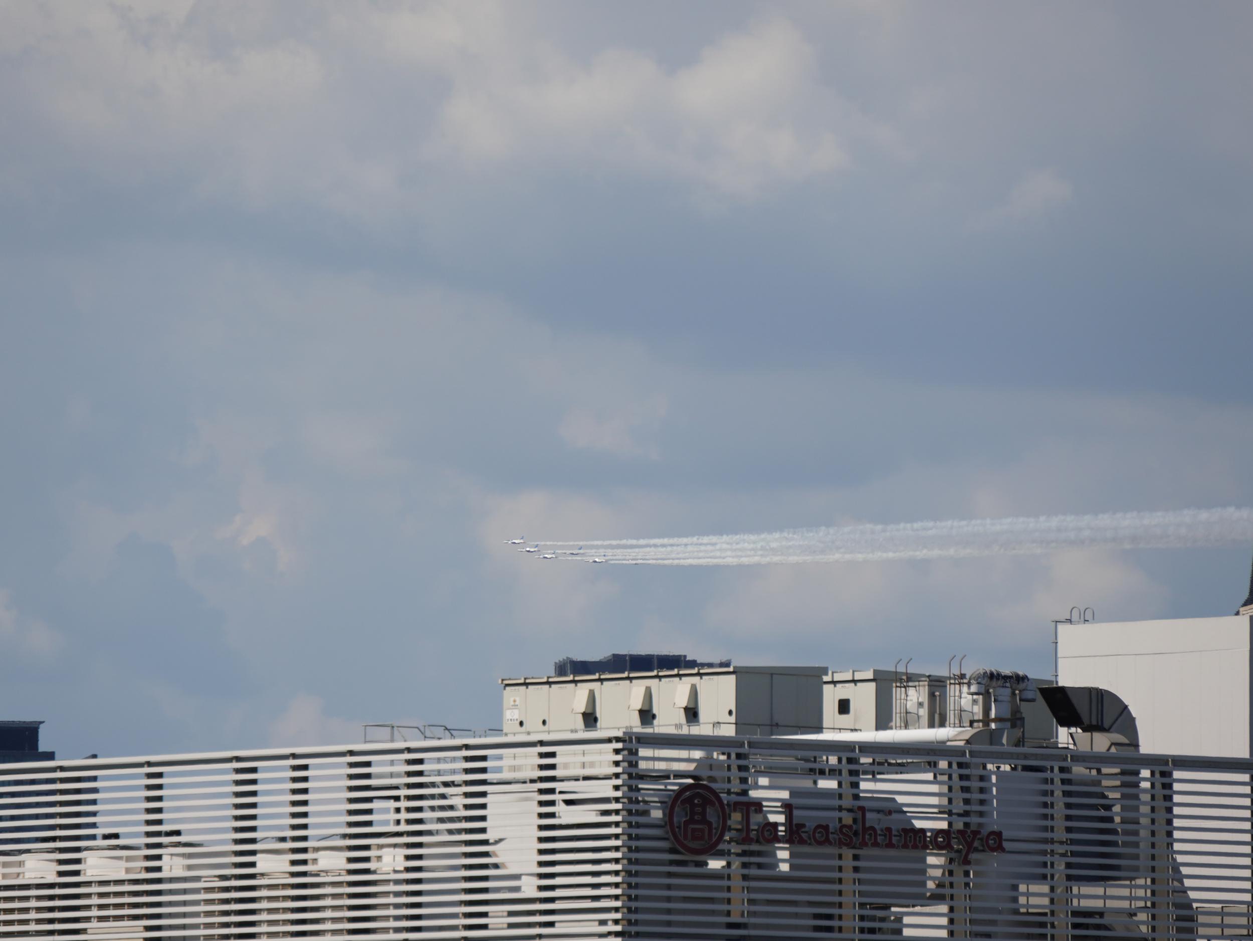 なんばパークス3F喫煙所からの眺めです。いつもの難波駅ビルとブルーインパルスで撮れたかも。でも飛行コースはもう少し東だったような。