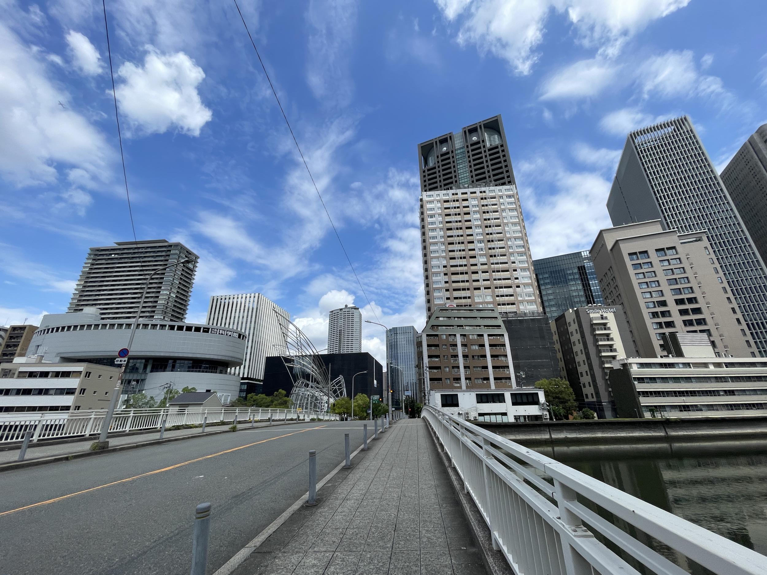 さて2時15分、そろそろブルーインパルスの時間です。中央公会堂との構図は絵になりそうですが、引き気味の角度を狙って天満橋方へ歩いてみると、難波橋の欄干に20人くらいが集まっています。ブルーインパルス待ちの人たちで間違いなさそう、みな東を向いていて中央公会堂とは逆です。