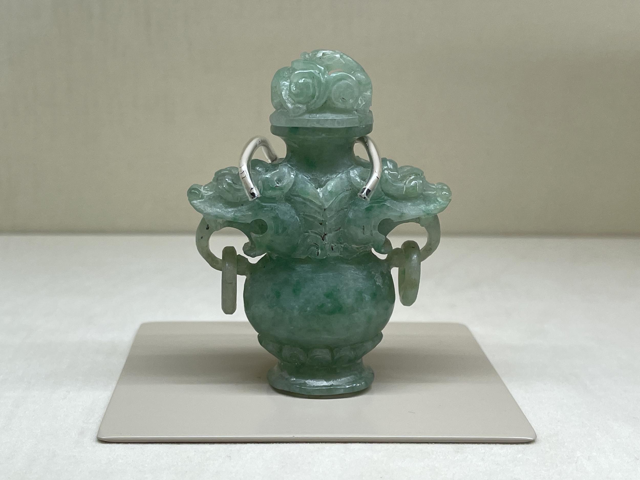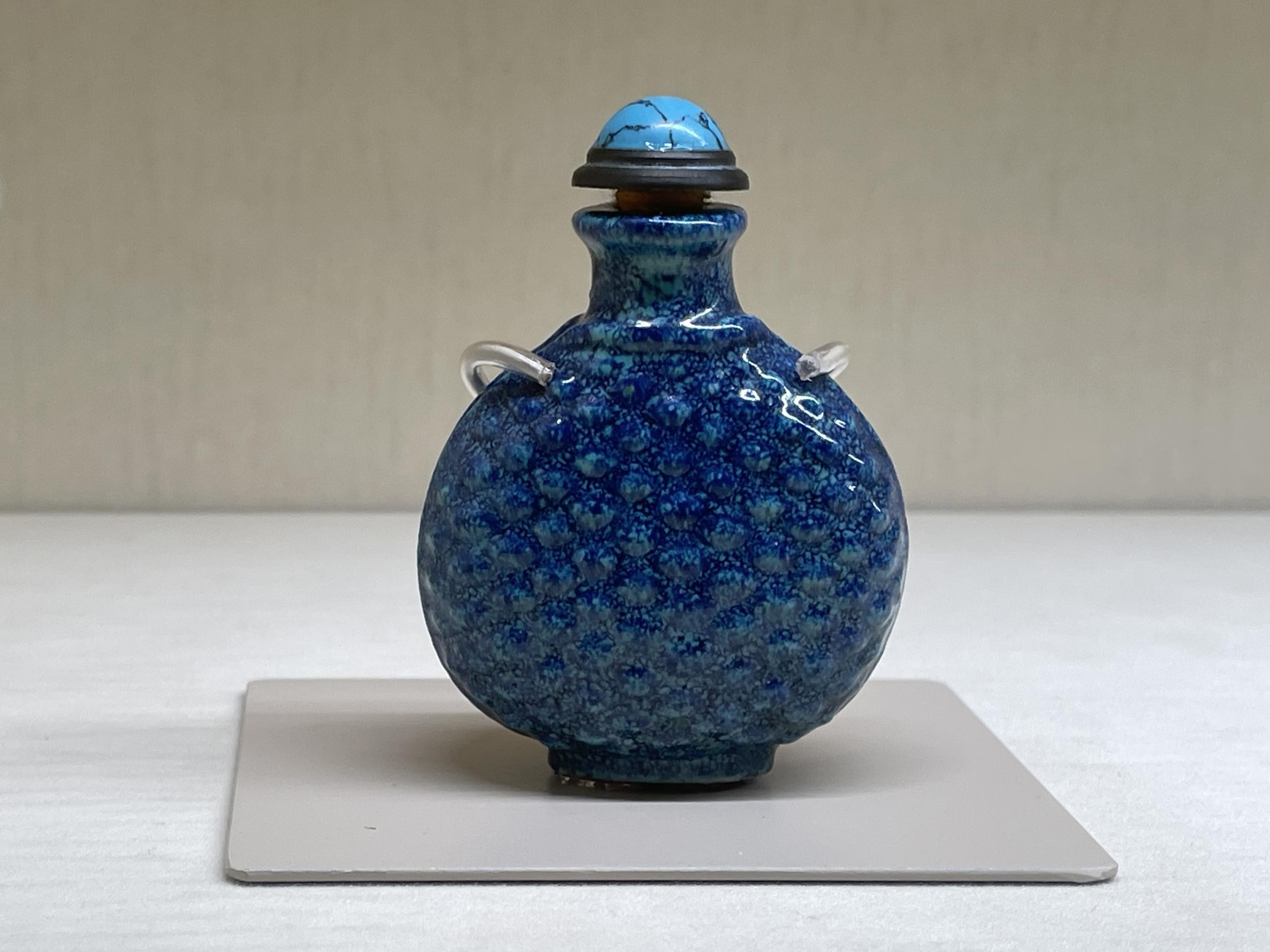 まずは明代の鼻煙壺(かぎたばこ)のコーナー。前回アップと被らないよう順に玉龍耳遊環鼻煙壺、ラピスラズリ蝙蝠文鼻煙壺、海鼠釉印花網目文鼻煙壺。