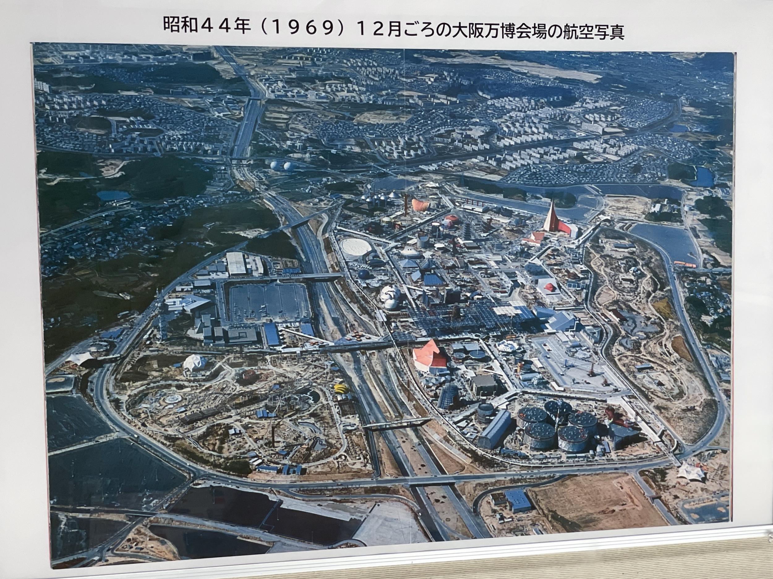 昭和44年12月の大阪万博会場航空写真、お祭り広場の屋根から建築途中の太陽の塔の黒い胴体だけが伸びています。
