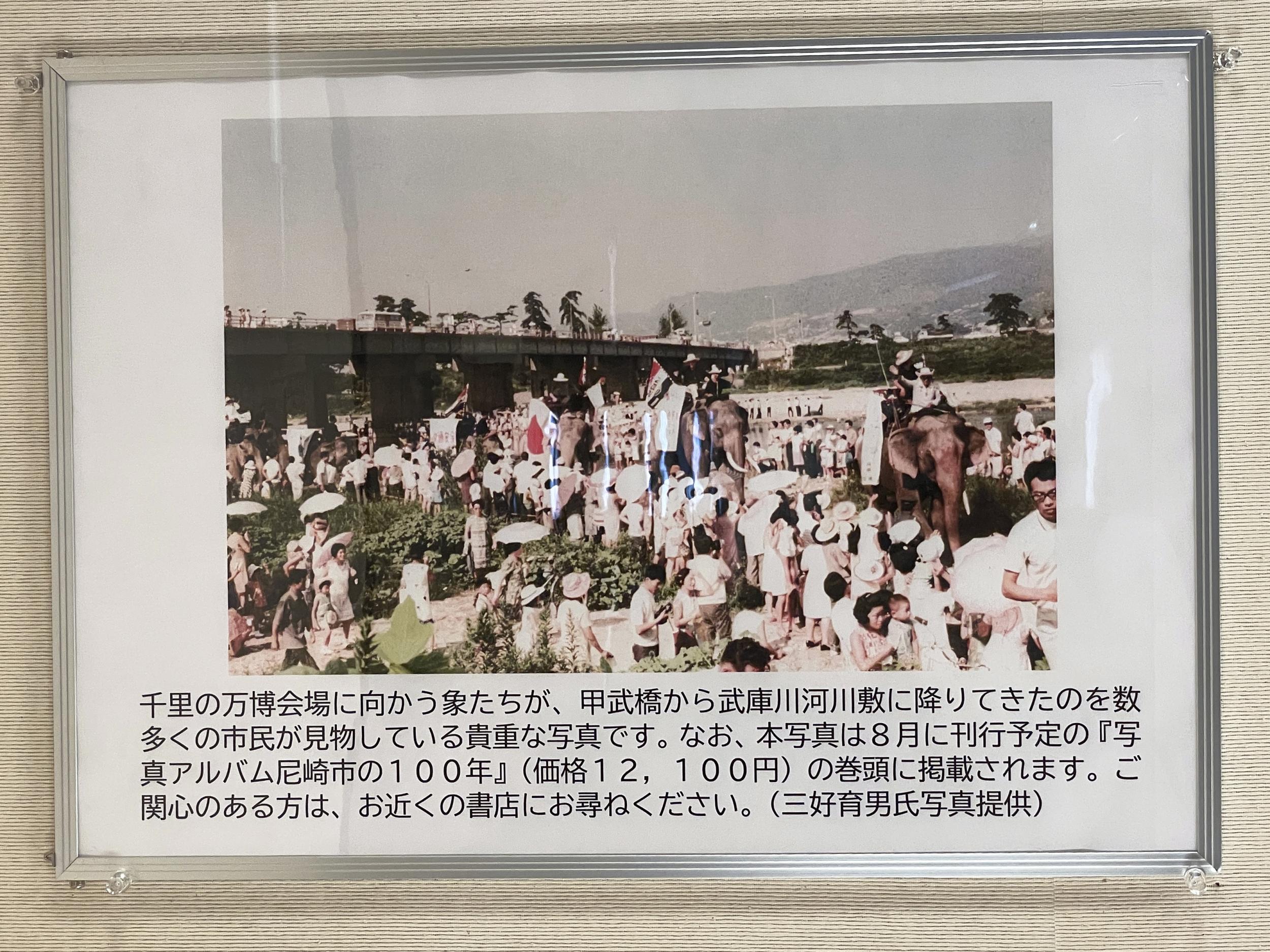 タイからやってきた象たちが神戸港から万博会場へ向かって171号線を更新する途中、武庫川の甲武橋付近の河川敷で休憩しているところの写真です。伊丹空港北側の食堂のおばちゃんが聞かせてくれたお話そのものです。対岸に六甲が見えるので尼崎側の武庫川左岸と分かります。今年もこんな素敵なイベントがあるものと期待していたのですが特に無いようです。