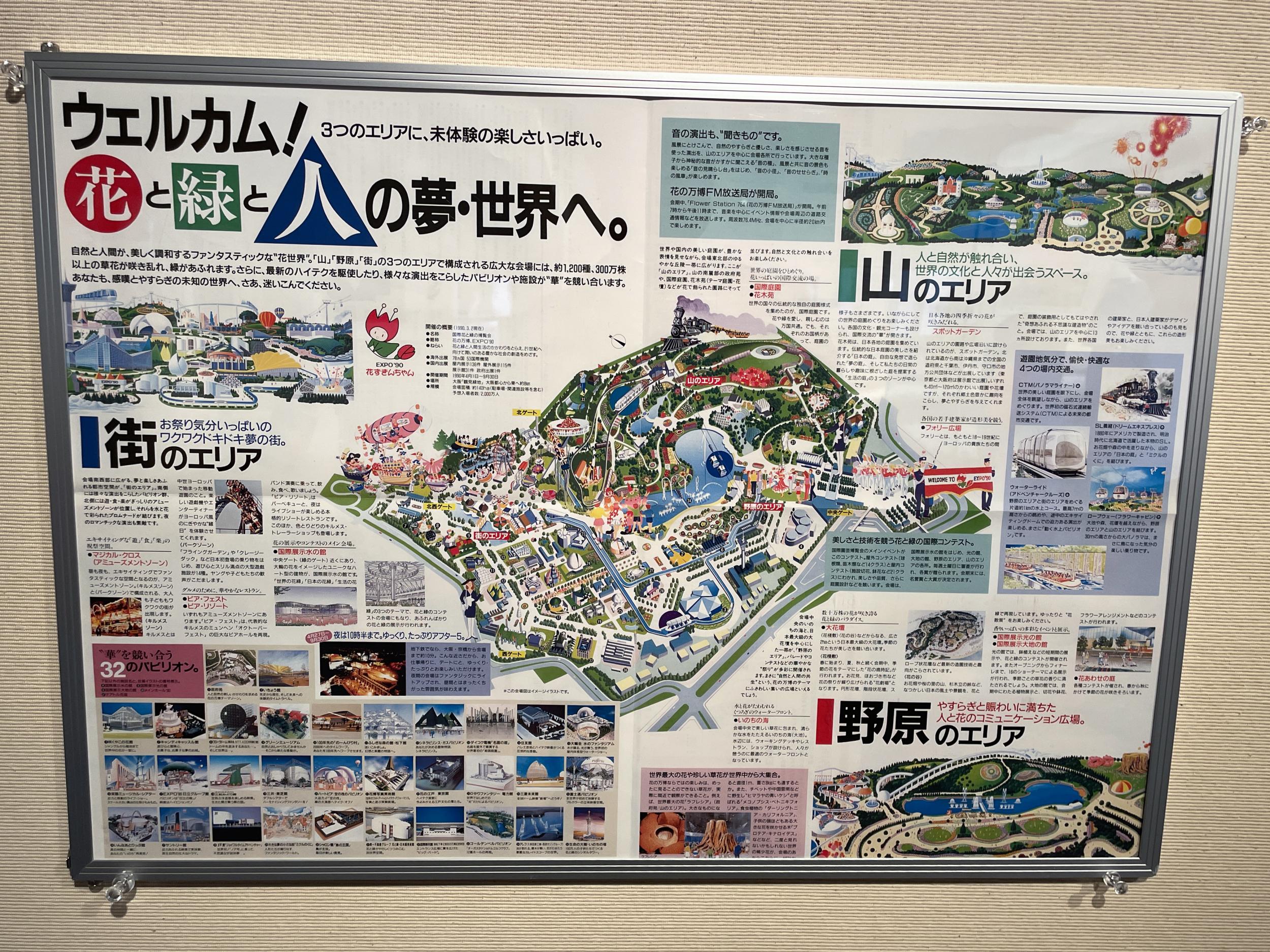 平成2年の花博。咲くやこの花館付近を1kmも周遊するウォーターライド、日本庭園や国際庭園周辺を周るパノラマライナー、大池をまたぐロープウェイ、さらにSL義経号と4つもの魅力的な会場内交通があったことは驚きです。
