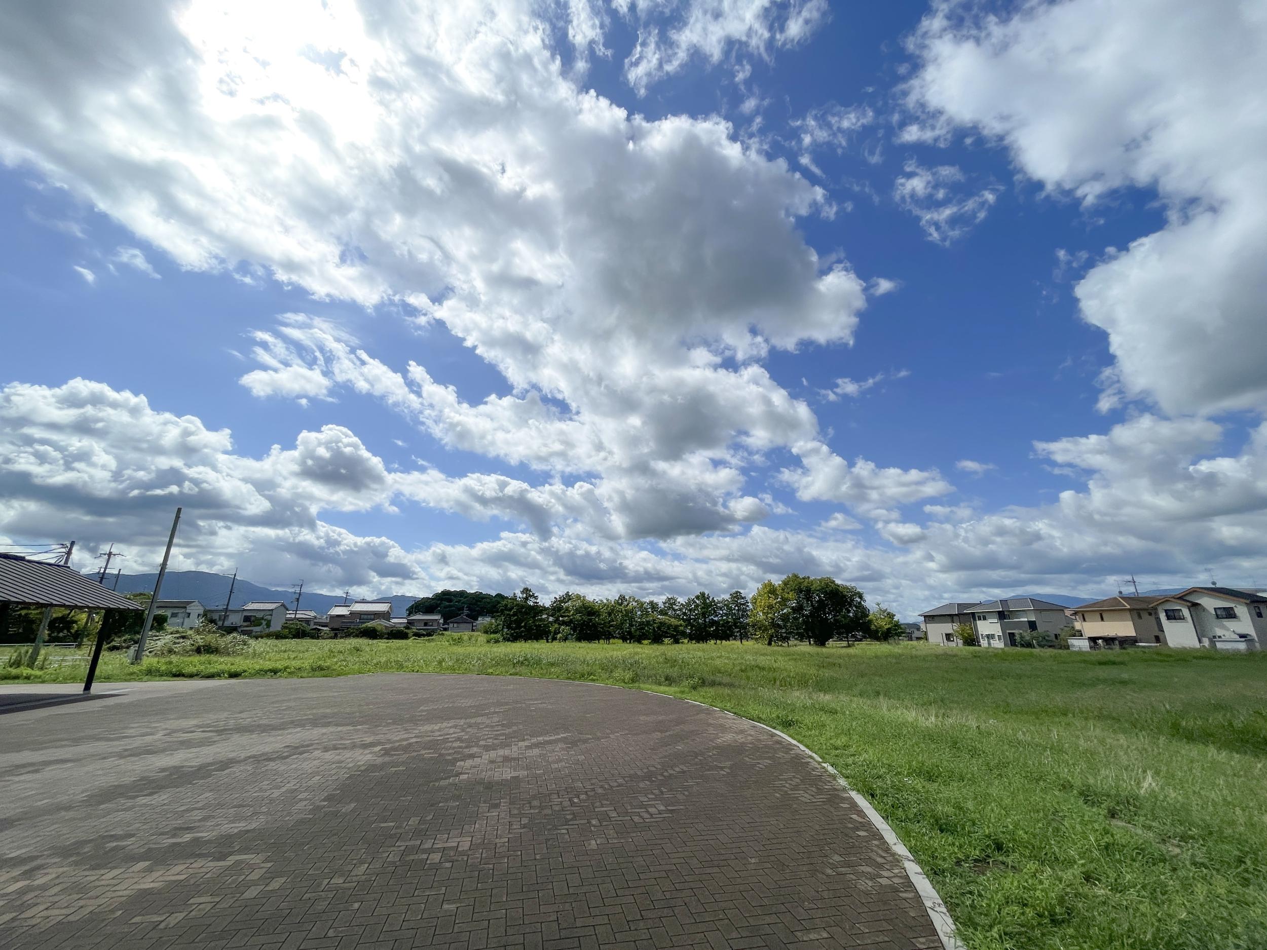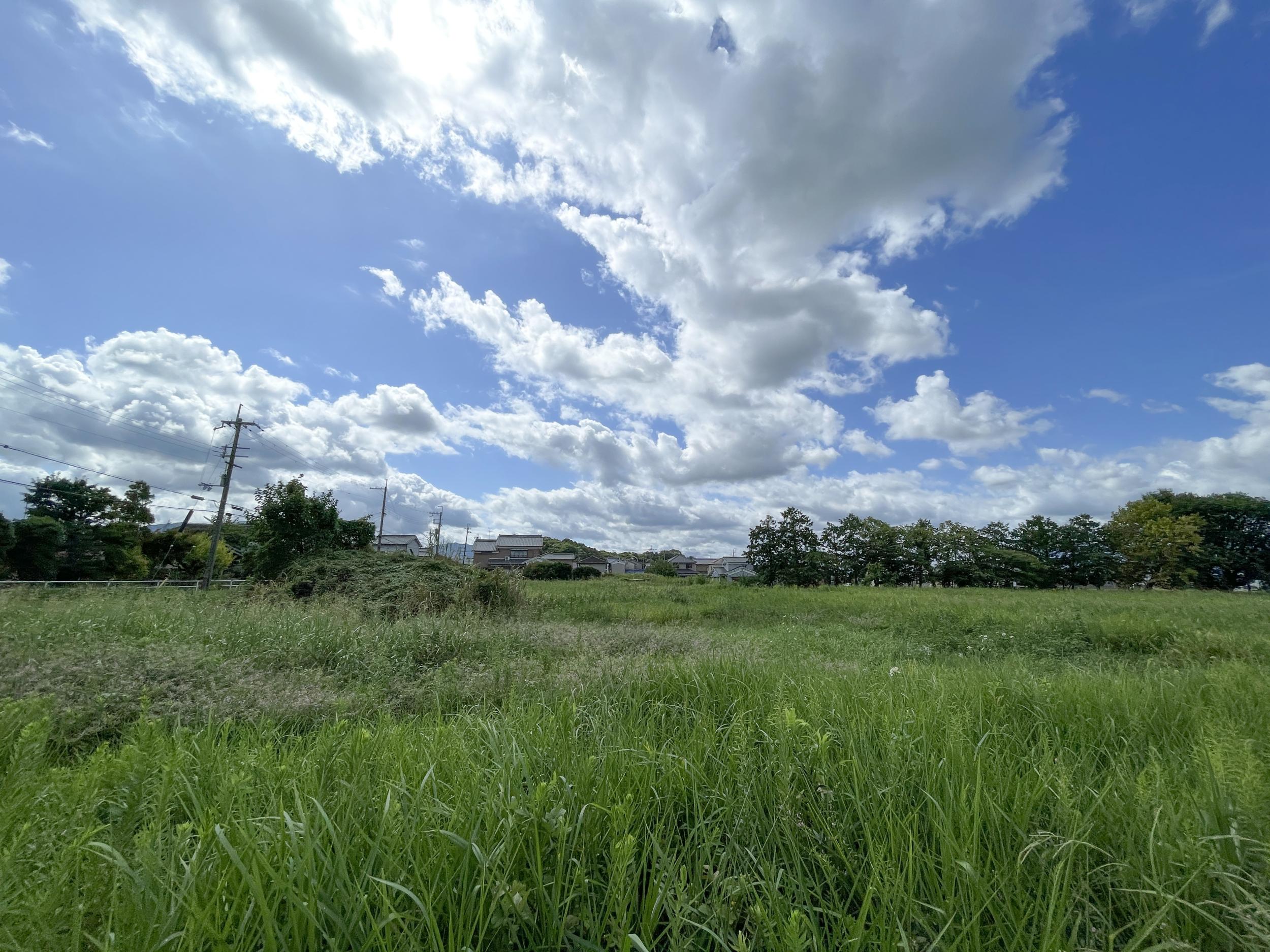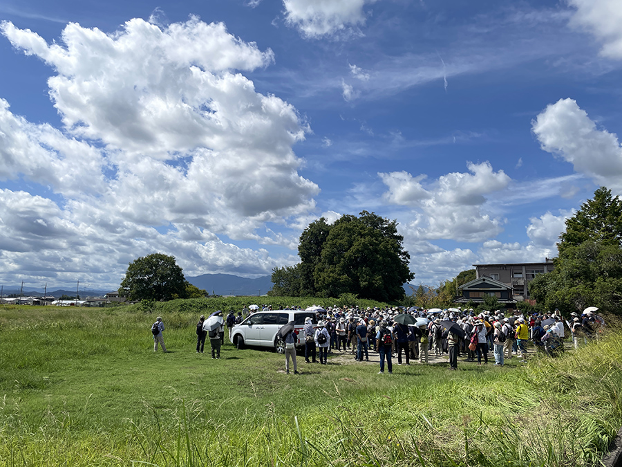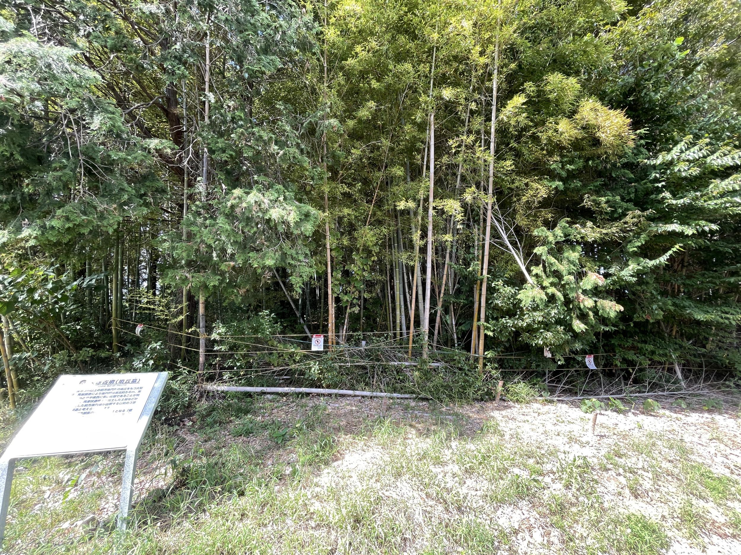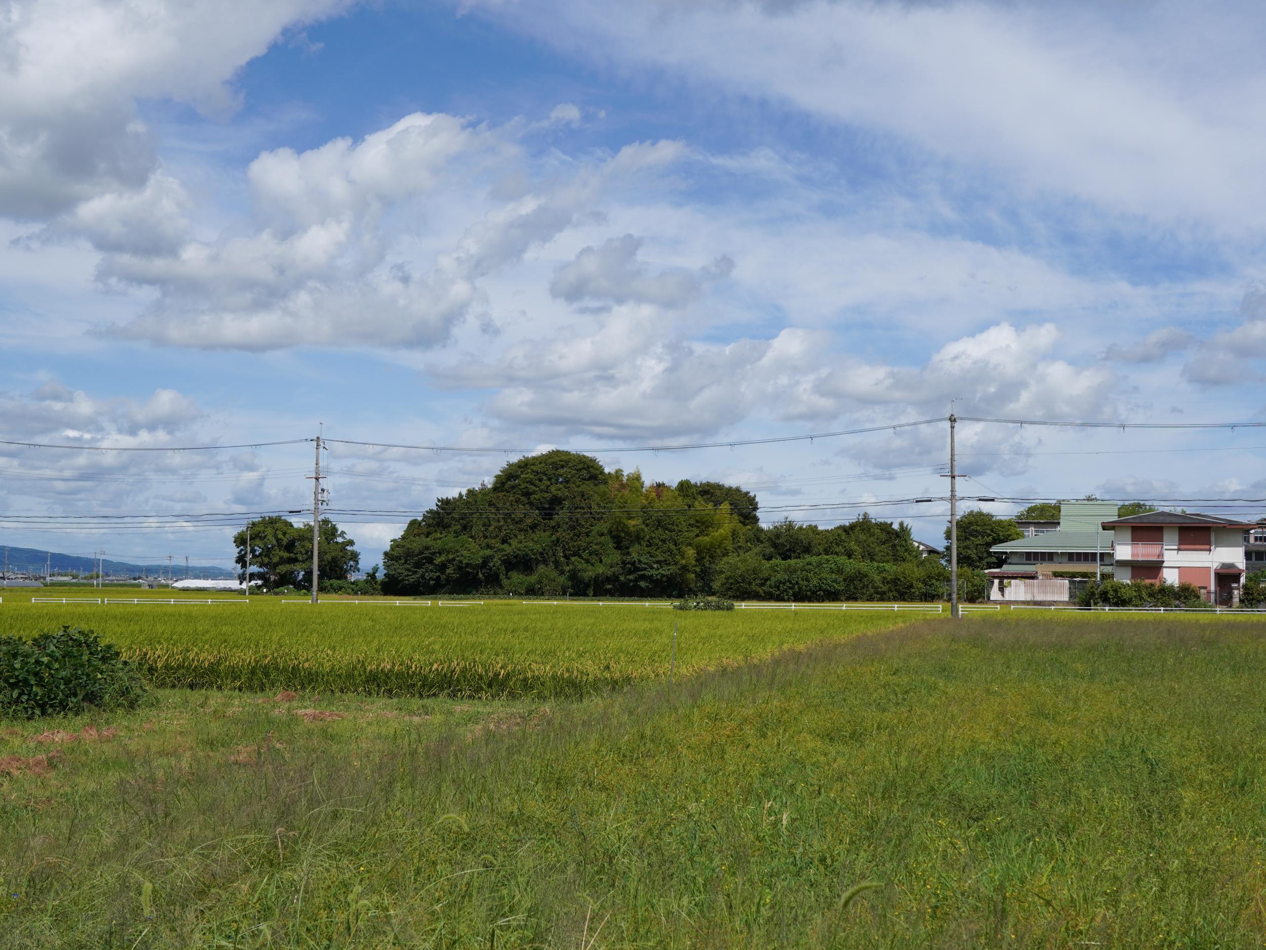 見学会の人たちは皆大型公衆トイレ西側を向いて講師の先生の説明を聞いていました。やはり南側の塚じゃなくて西側の広い空間のどこかがメクリ1号墳のようです。見学会の人たちが去ったあと、大型公衆トイレ前から空地を撮影。纒向遺跡の物資集積・管理の拠点だったらしい太田地区ですが、遺跡としての説明板も何もありません。立入禁止の看板が立つだけで引き続き発掘調査が行われているものと思われます。