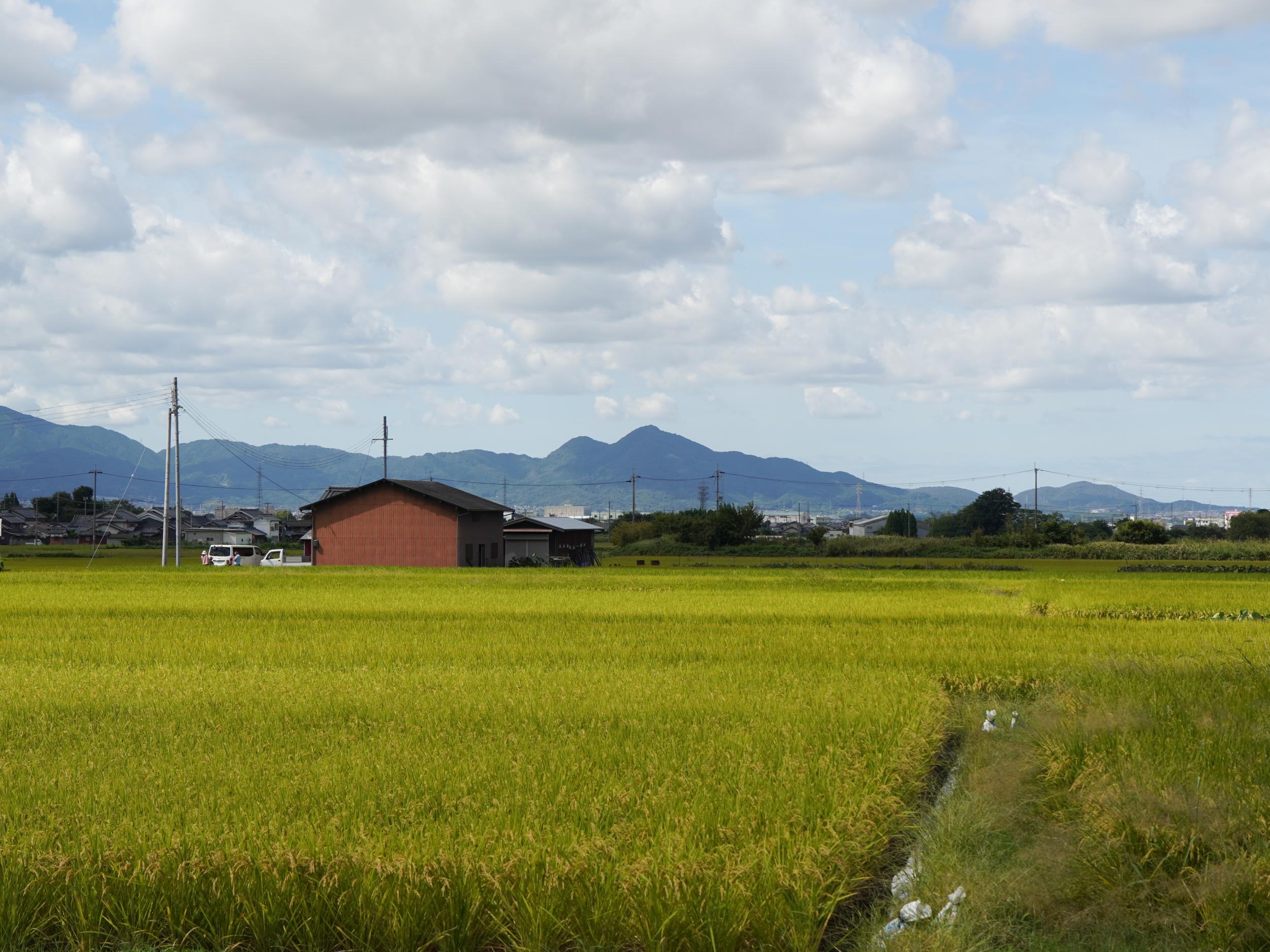 満腹してホケノ山古墳へ向います。黄金色の田んぼの向こうに見えてきたのは巻野内石塚古墳。真後ろは箸墓古墳、右手に耳成山、遠景は金剛山と大和葛城山。実に美しい。