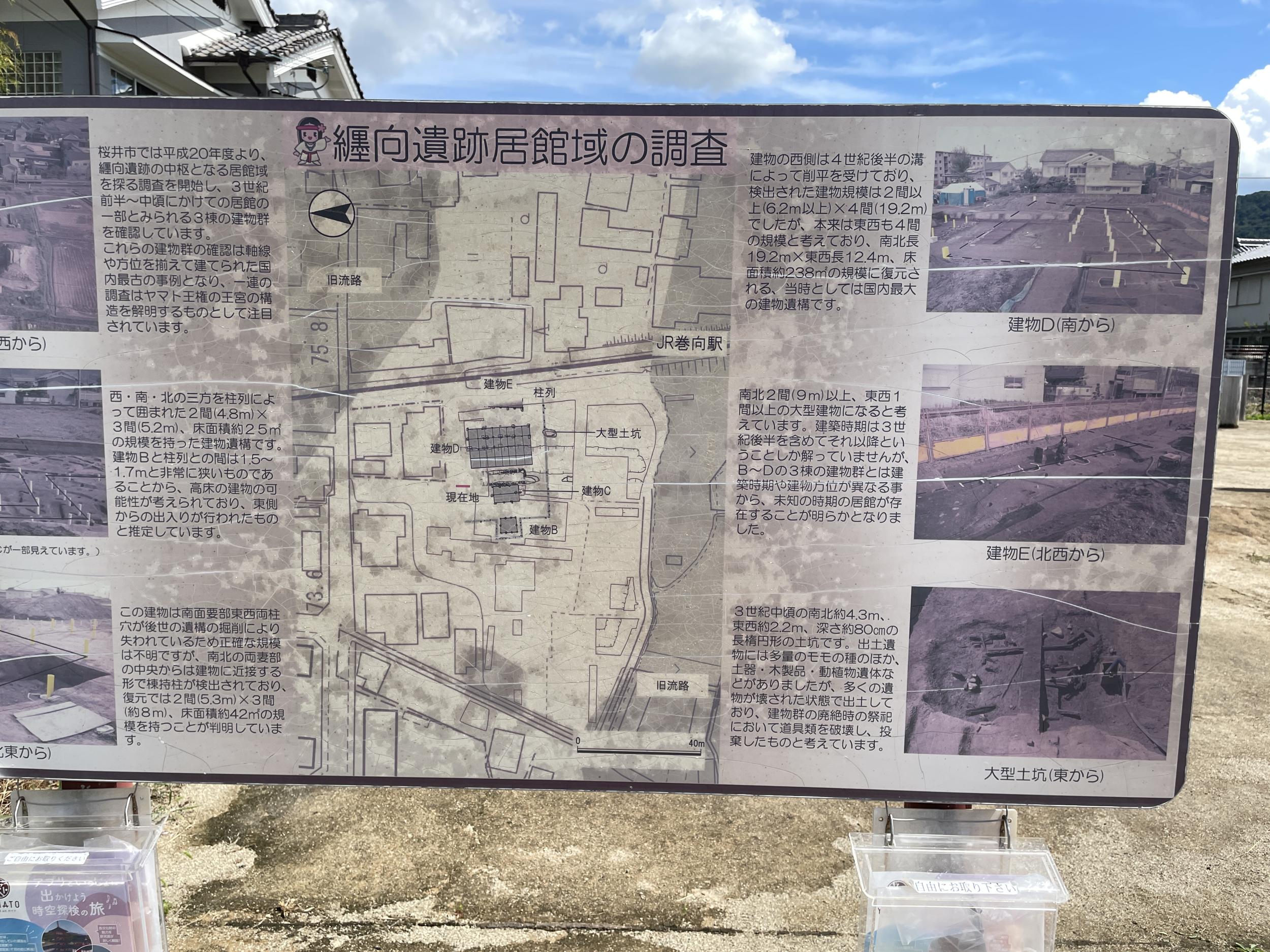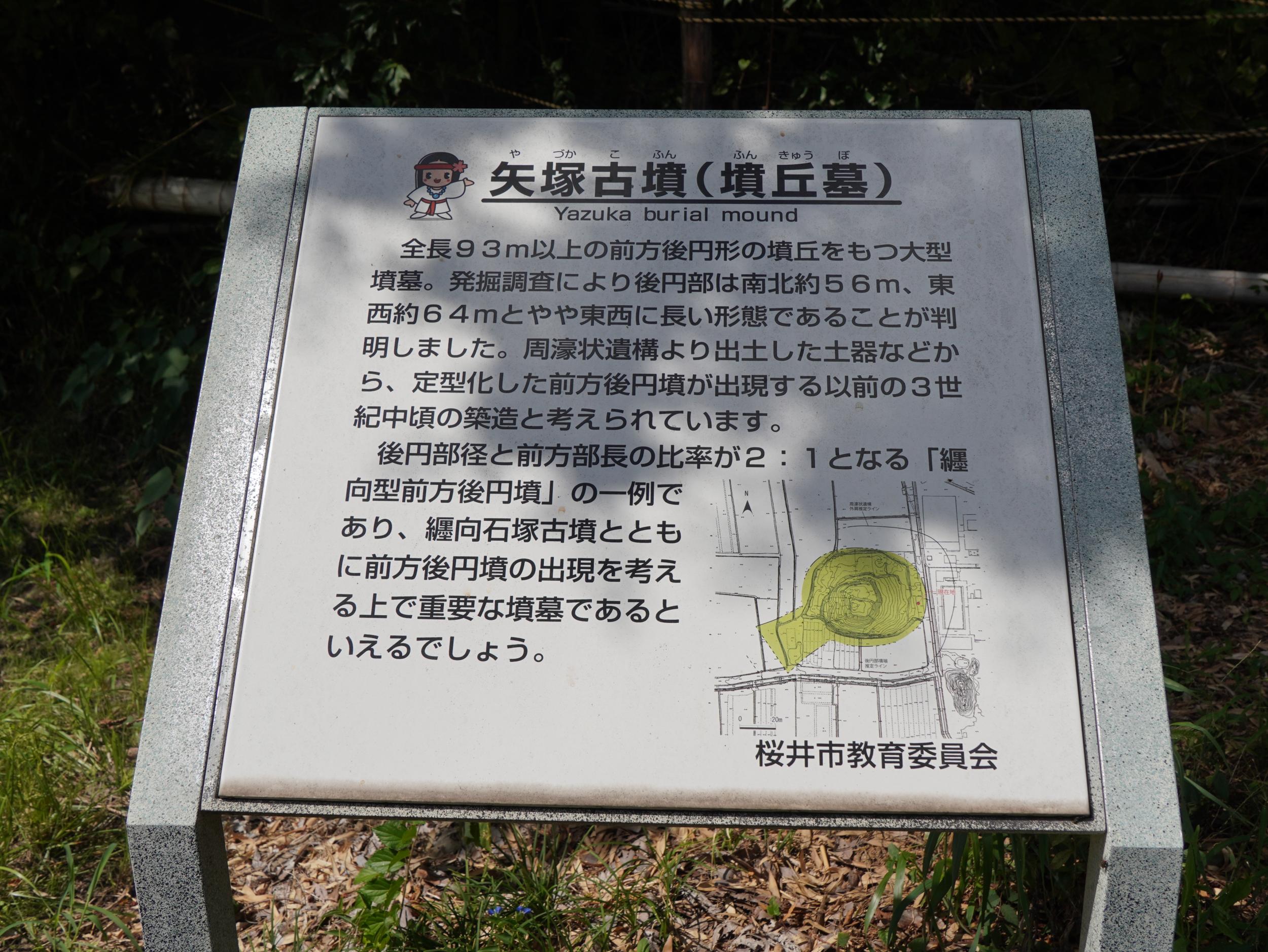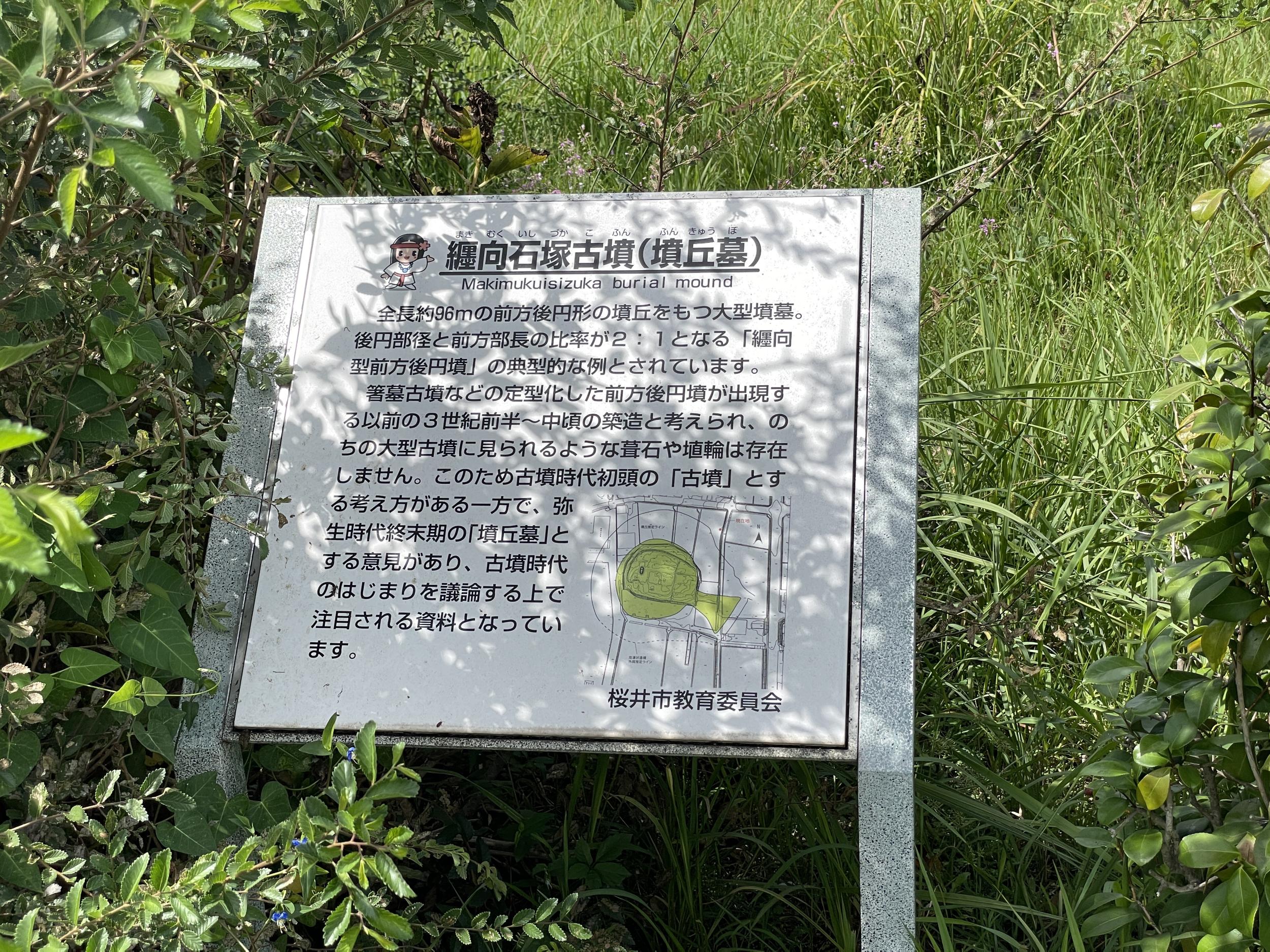 かなり見えにくい場所に立てられた巻野内石塚古墳の説明板をズームで撮ってみると、詳細不明も前方後円墳らしいとあるまでですが、大和の古墳探索さんによると、位置や規模からホケノ山古墳に続く同時代の重要な古墳かも知れないとのこと。