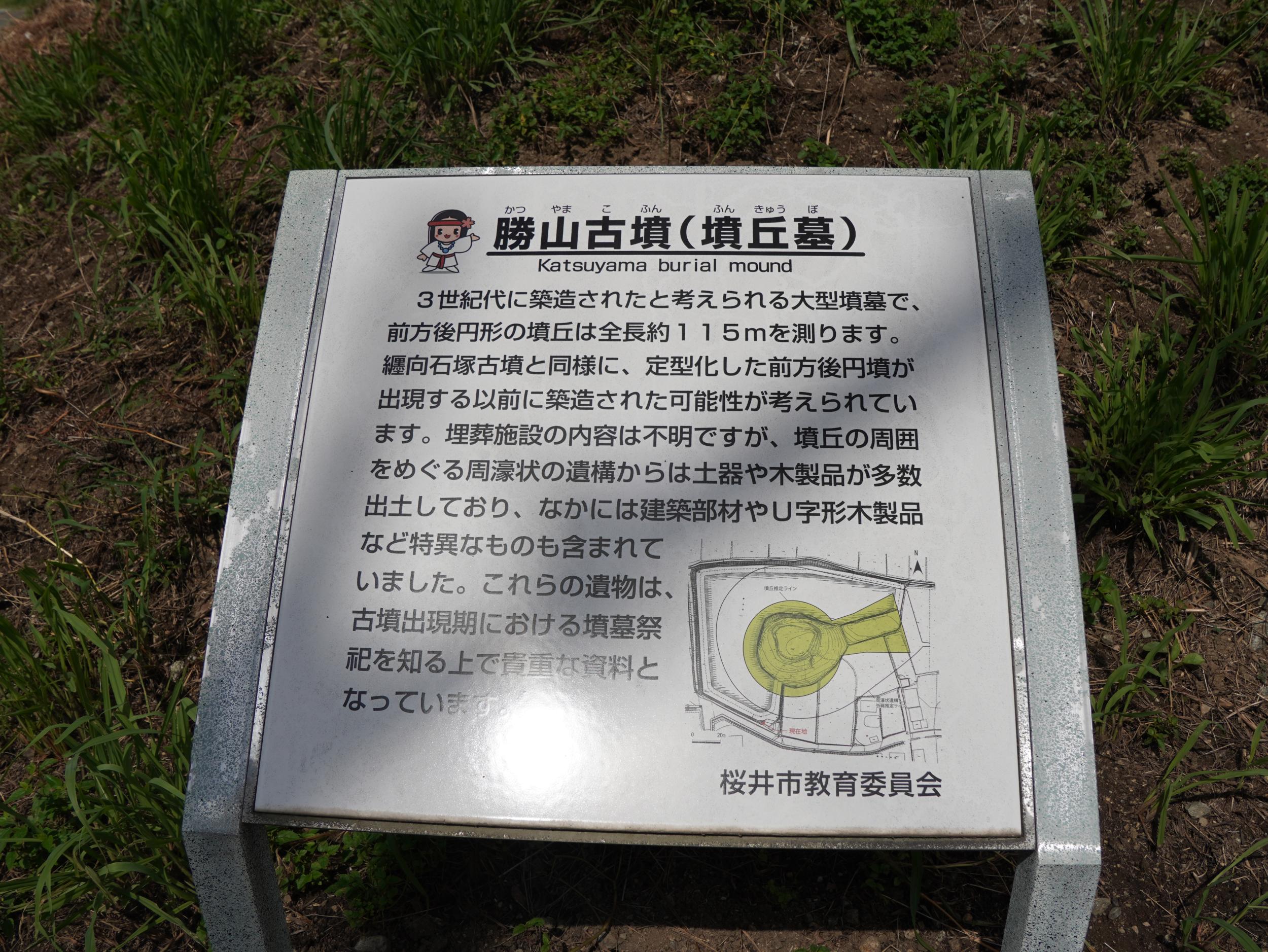 説明板では「勝山古墳(墳丘墓)」とカッコ書きで墳丘墓とあります。矢塚古墳にもカッコ書きで墳丘墓、東田大塚古墳にはありません。墳丘墓とは弥生時代末期、古墳時代前段階の形式が統一されていない地域有力者の墓。一方、古墳はヤマト王権を頂点とした広域的支配者層の定型化した墳墓と定義されるようです。