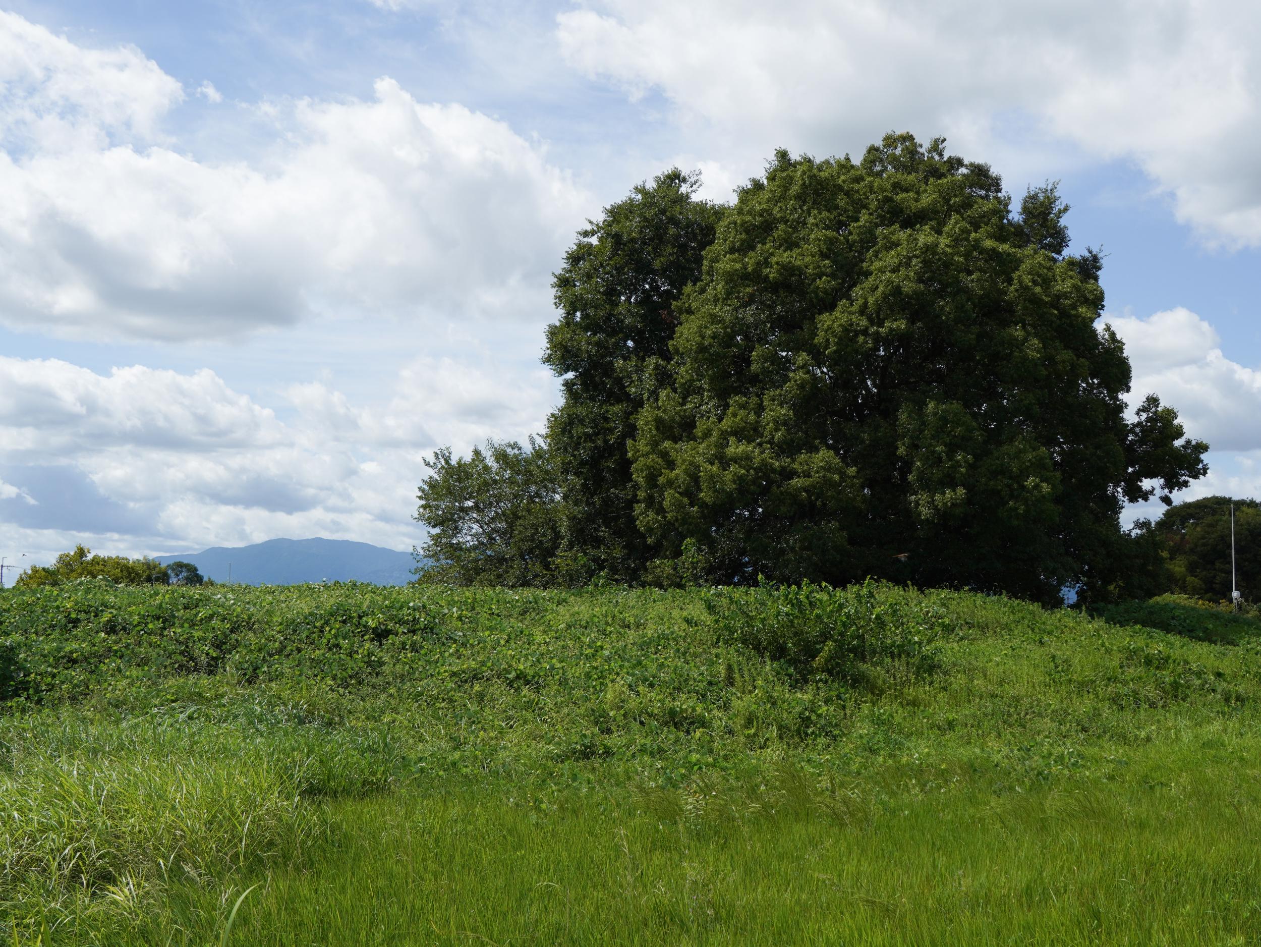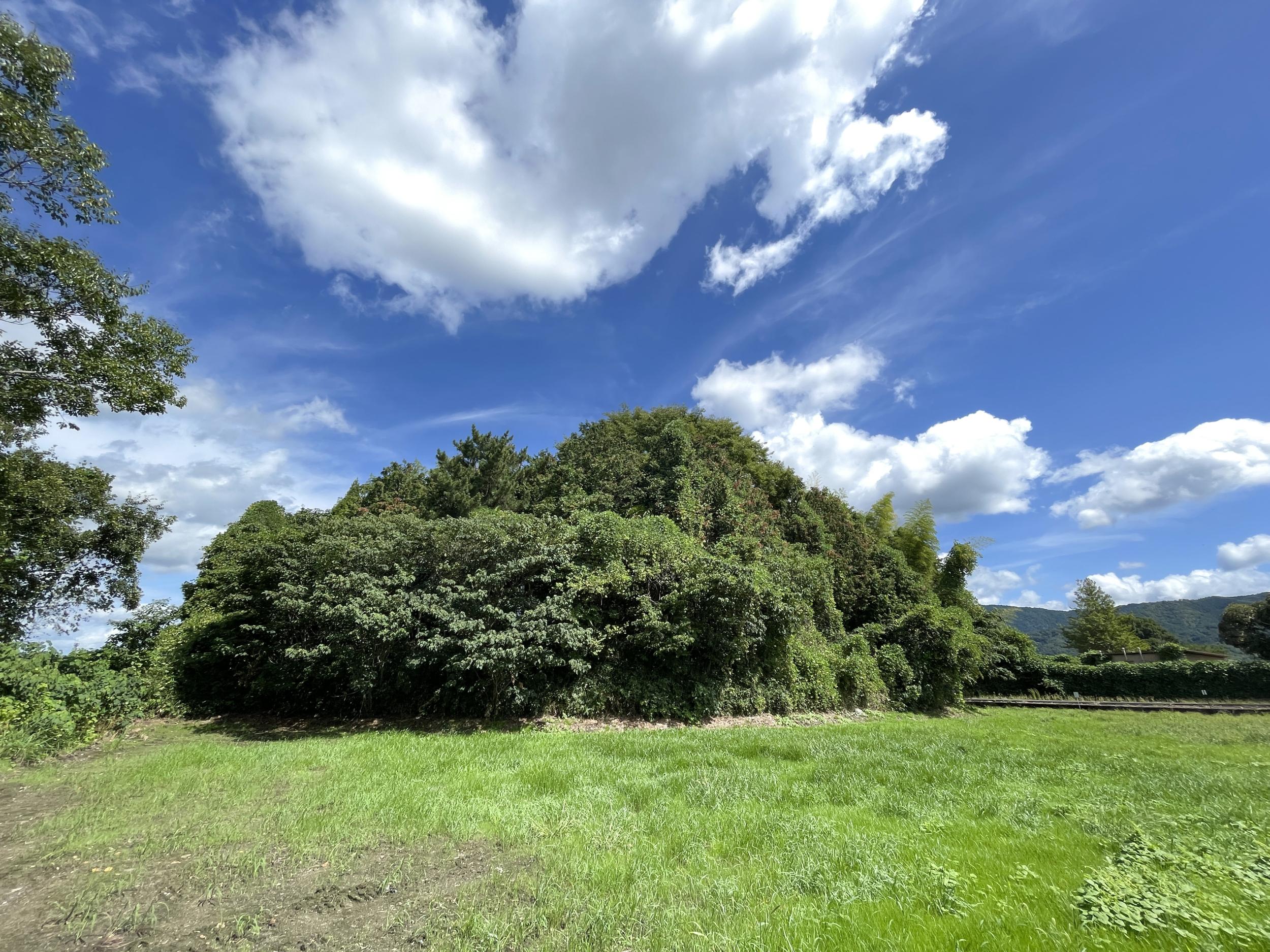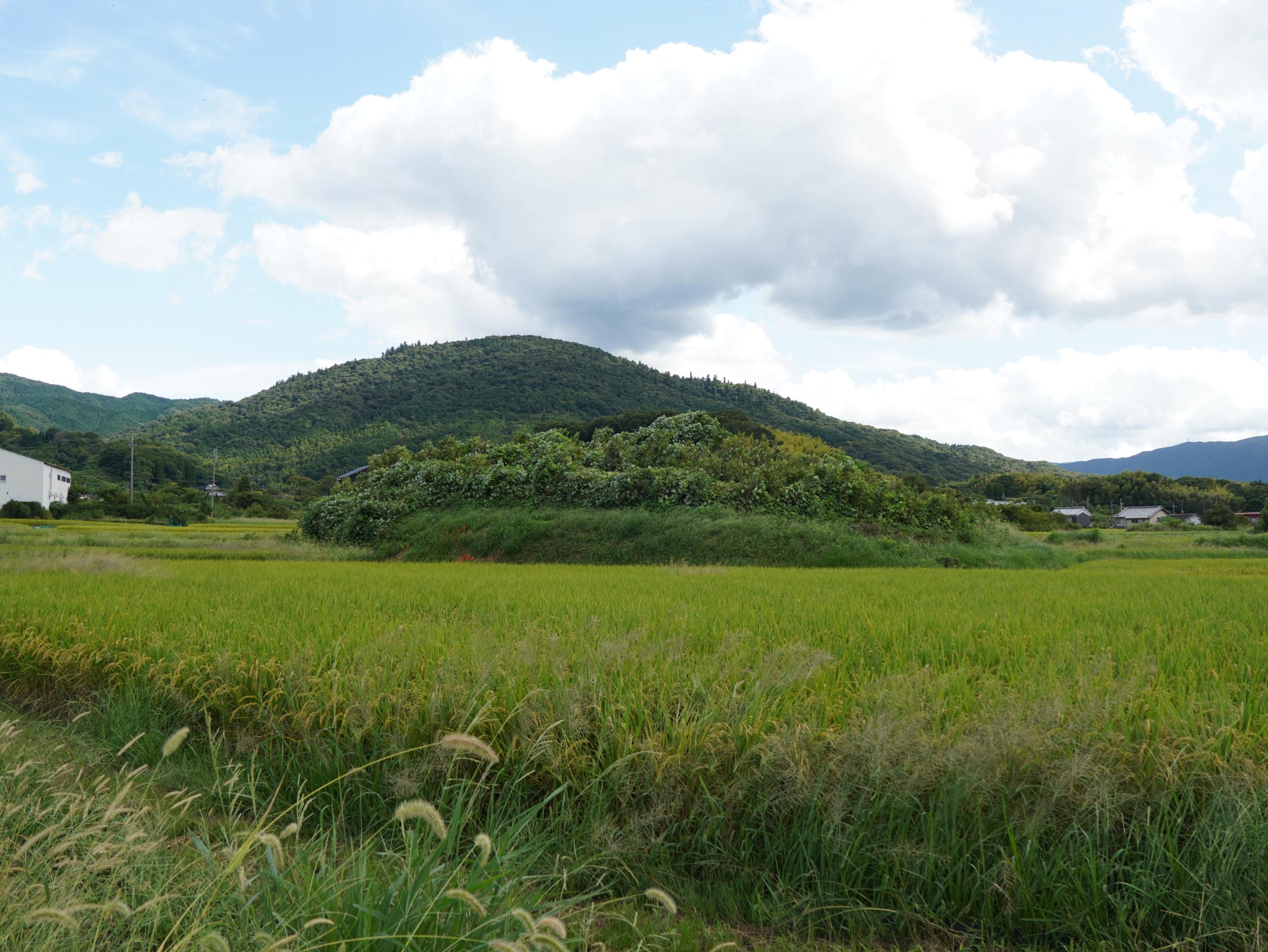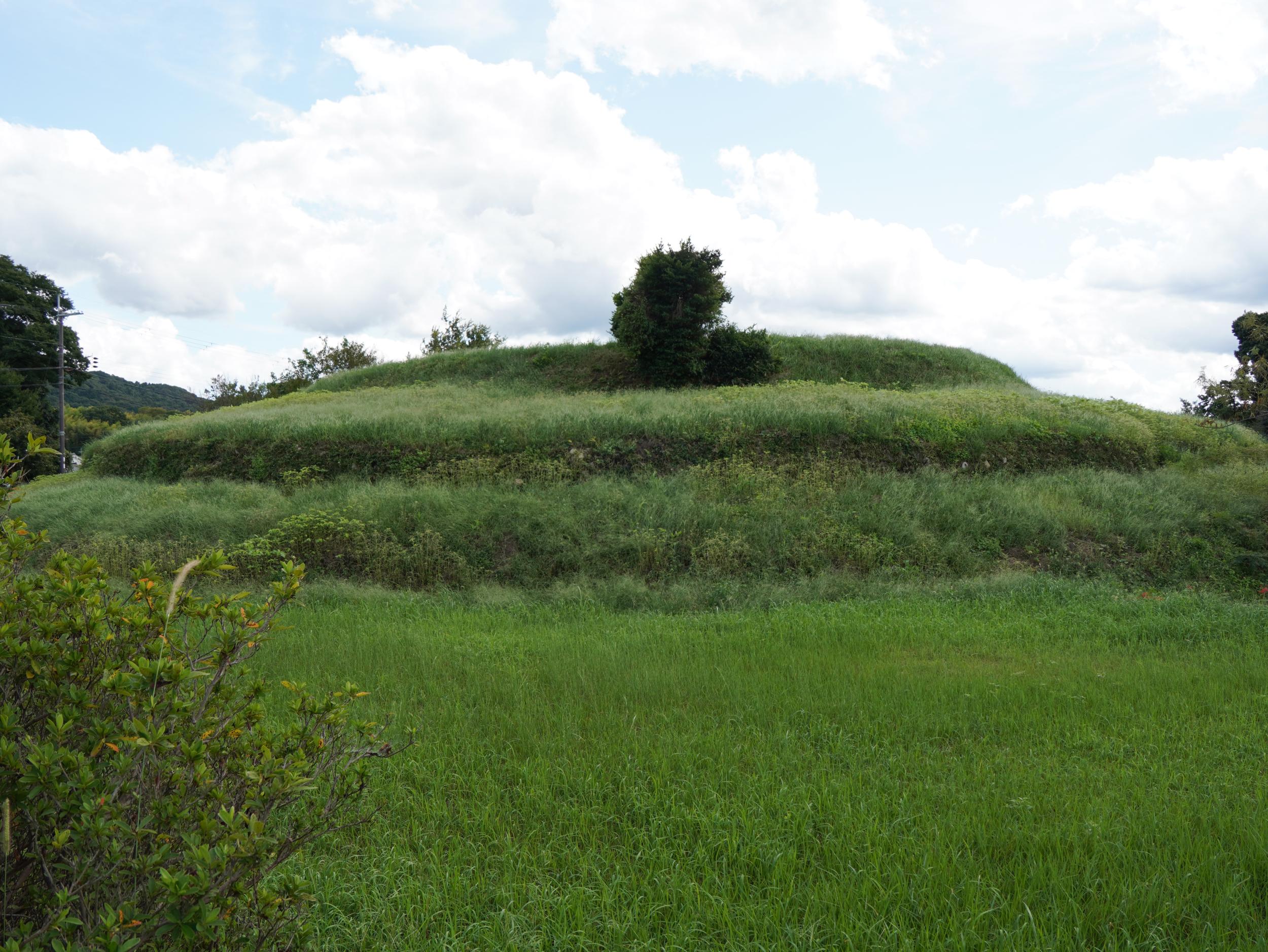 3月のブログでは纒向型前方後円墳のひとつと書いていてしまったものの、後円部と前方部の比率が2:1という纒向型の定義からすると当てはまらないので訂正しておきました。墳丘長115mの勝山古墳、右手に2:1以上に長く伸びる削平された前方部が見えます。