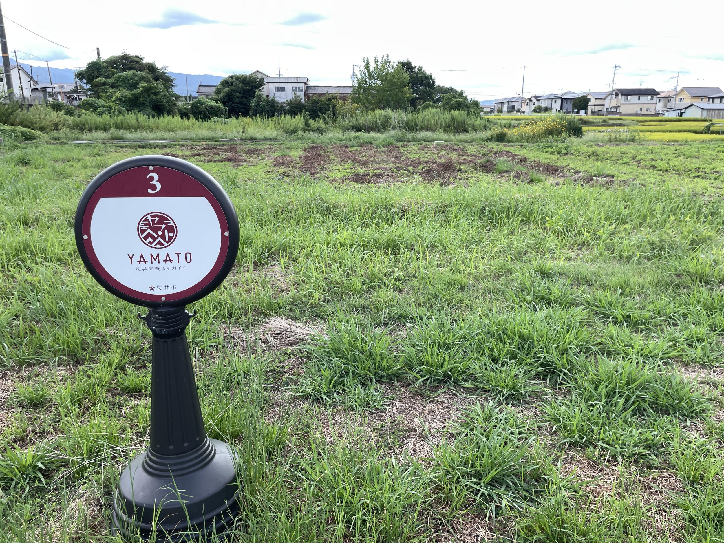 建物群の南側に草原、このARの標識は大量の桃の種やベニバナの花粉が発見された場所を示すもののはず。(参考: 史跡纒向遺跡・史跡纒向古墳群保存活用計画書纒向遺跡第168次調査の項、及び、纒向遺跡発掘調査概要報告書7ページの地図)、SK-3011と記されたピンク色背景の位置です。