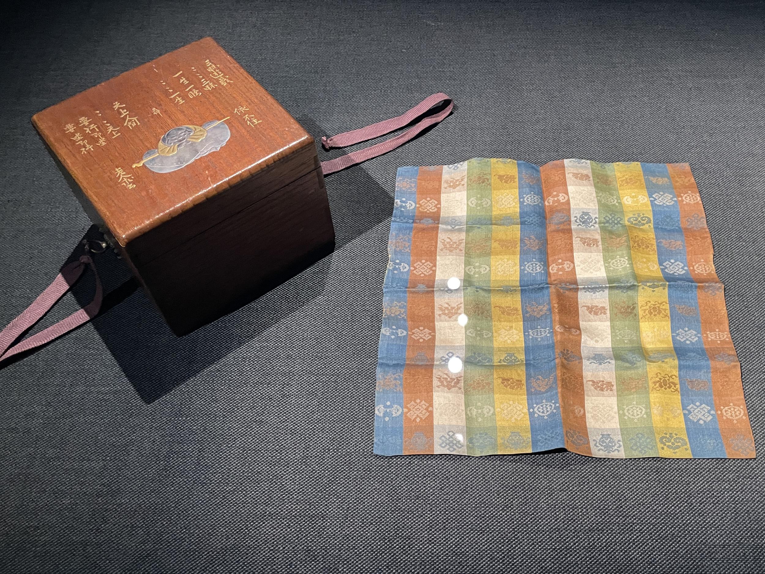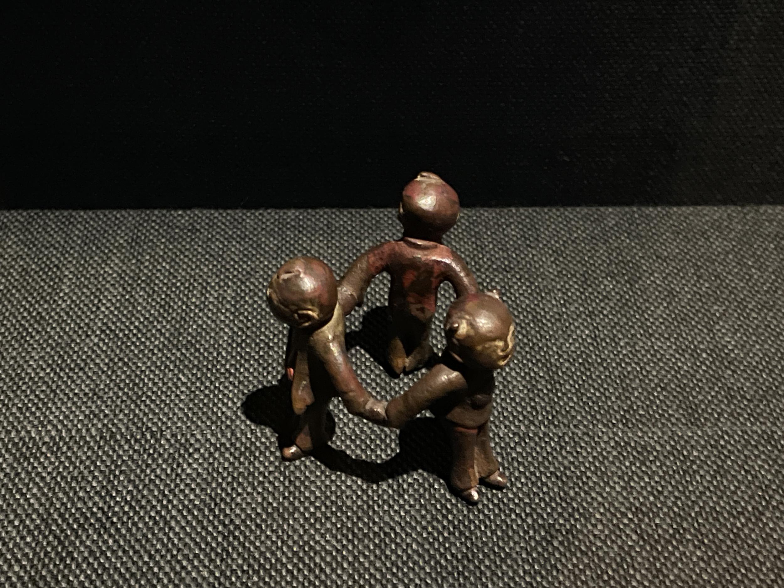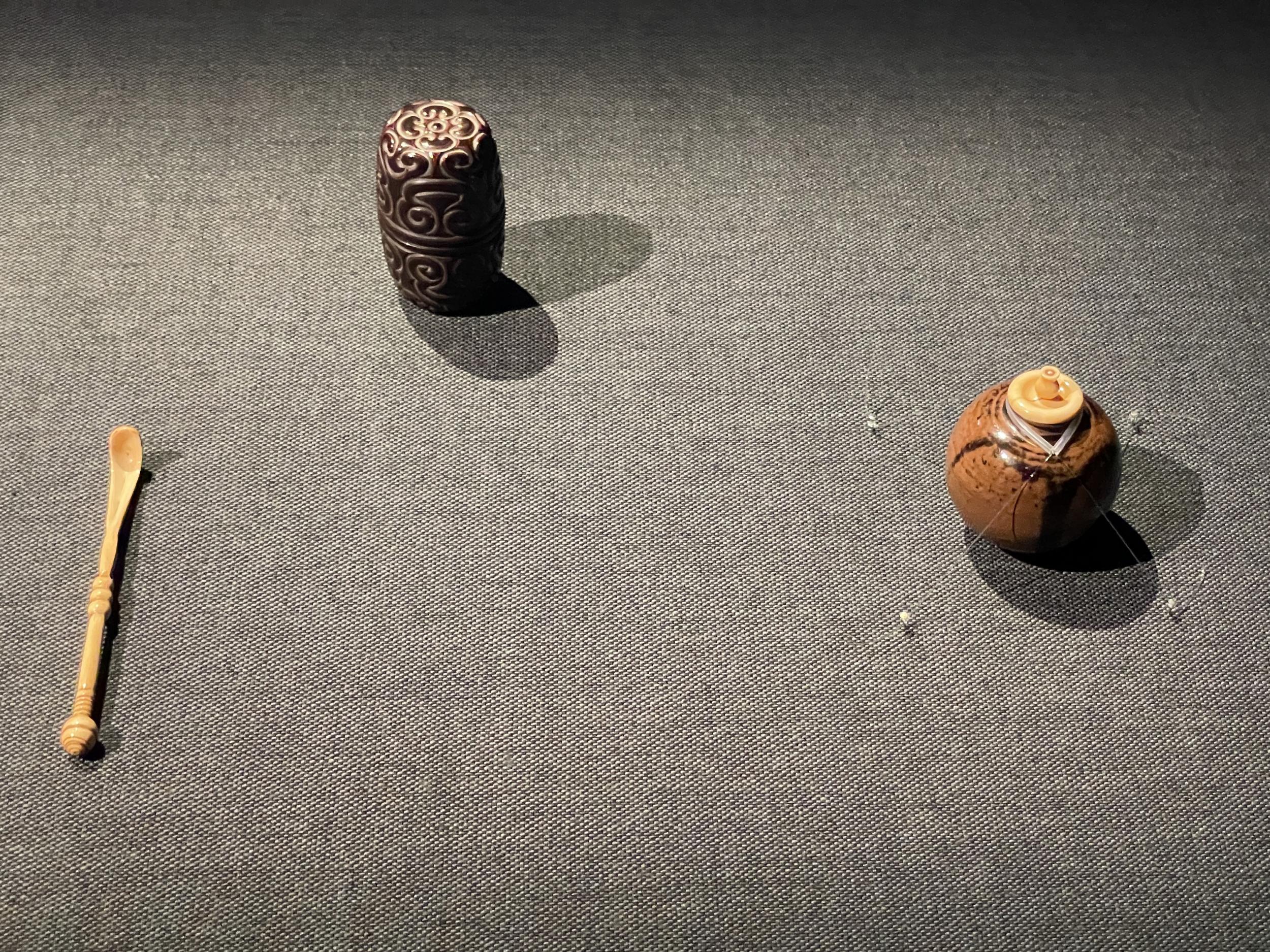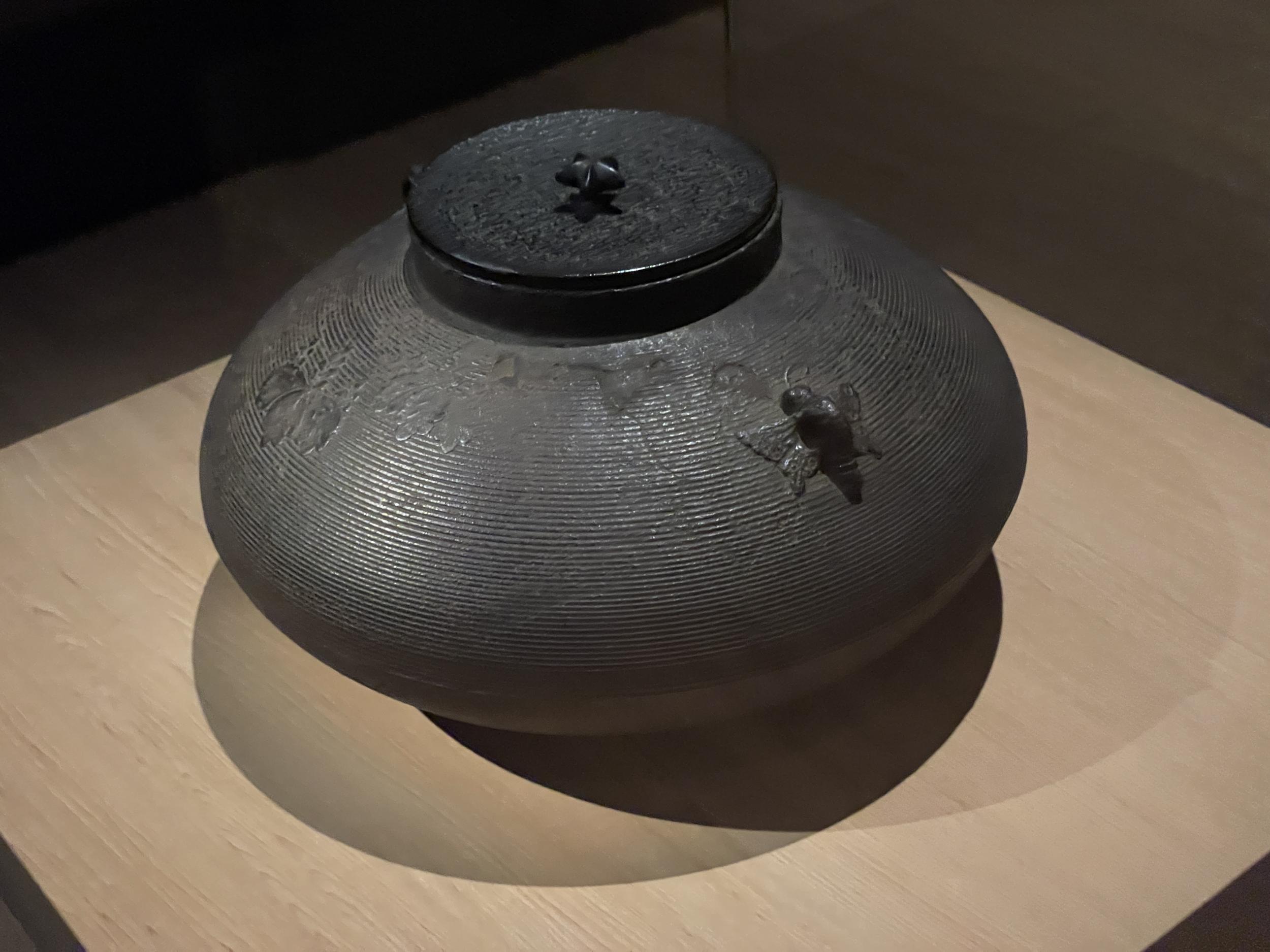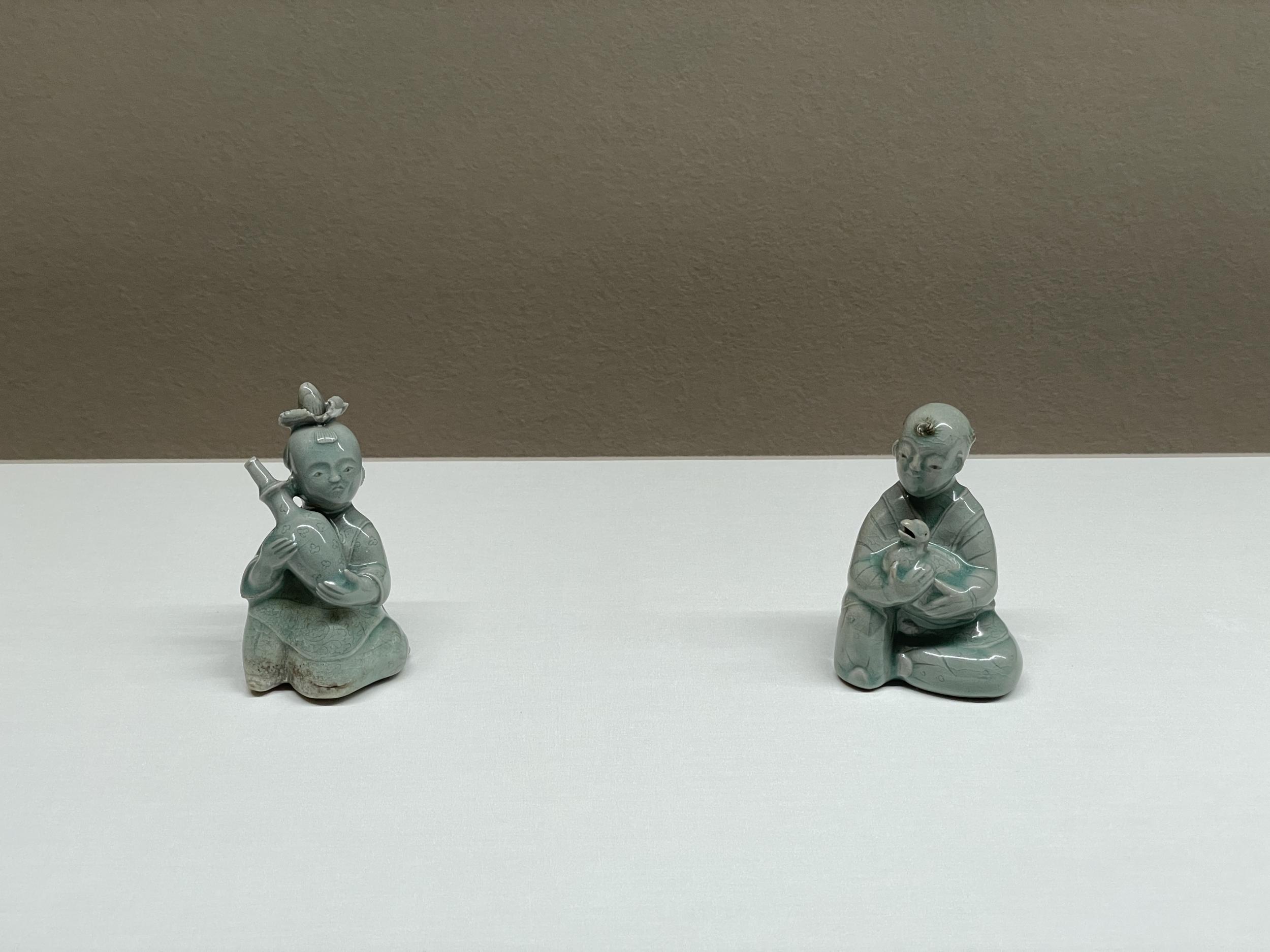 同じ展示ケースの左下に17世紀明代の「色絵古銅三ツ人形蓋置」。元々墨を置く台だったものを、茶釜の蓋や柄杓を置くための蓋置に茶人たちが転用したそうな。表情があるかのような「日々是好日」の書と、明代の子どもたちが挨拶を交わしているかのような空間を演出。