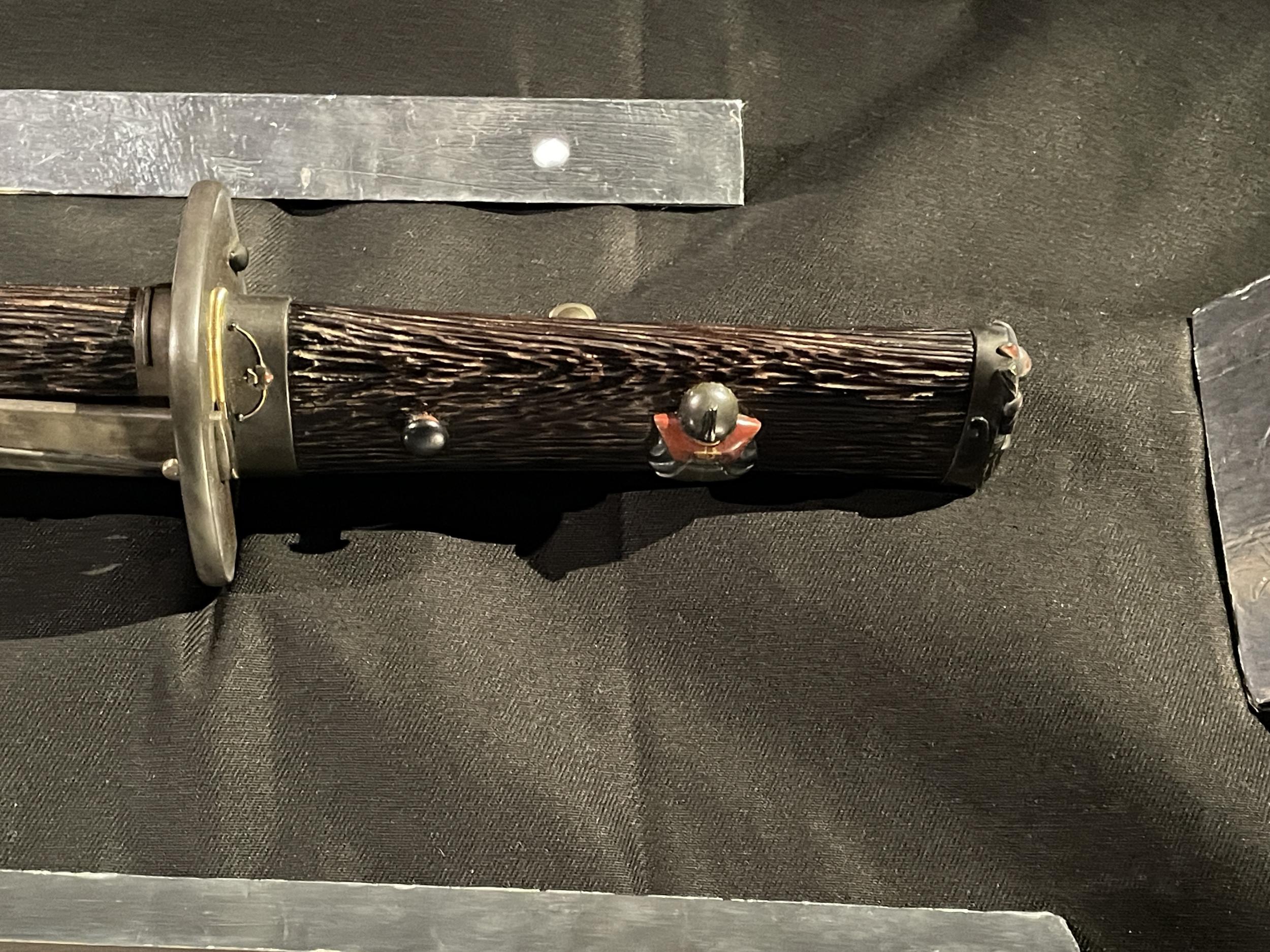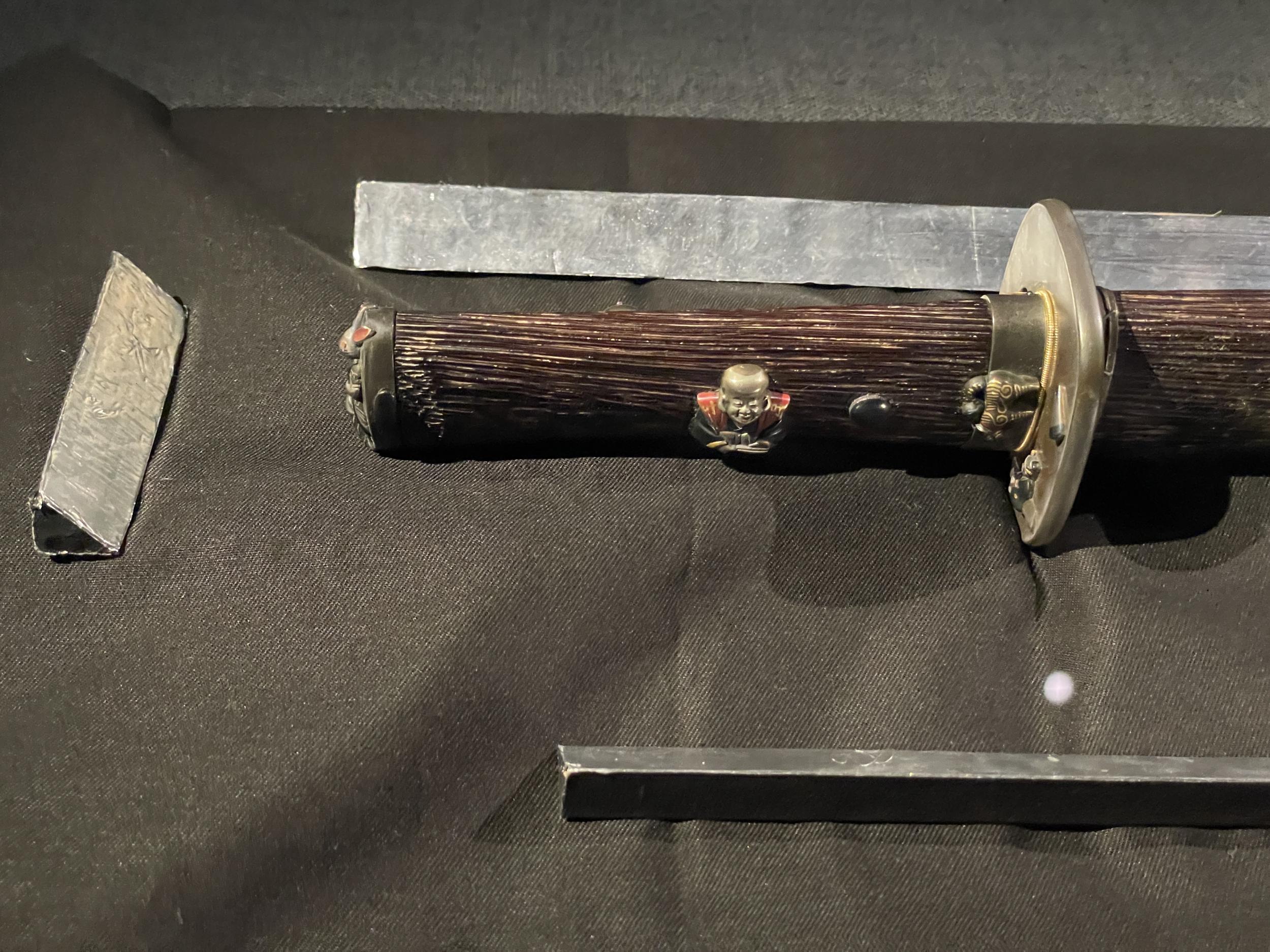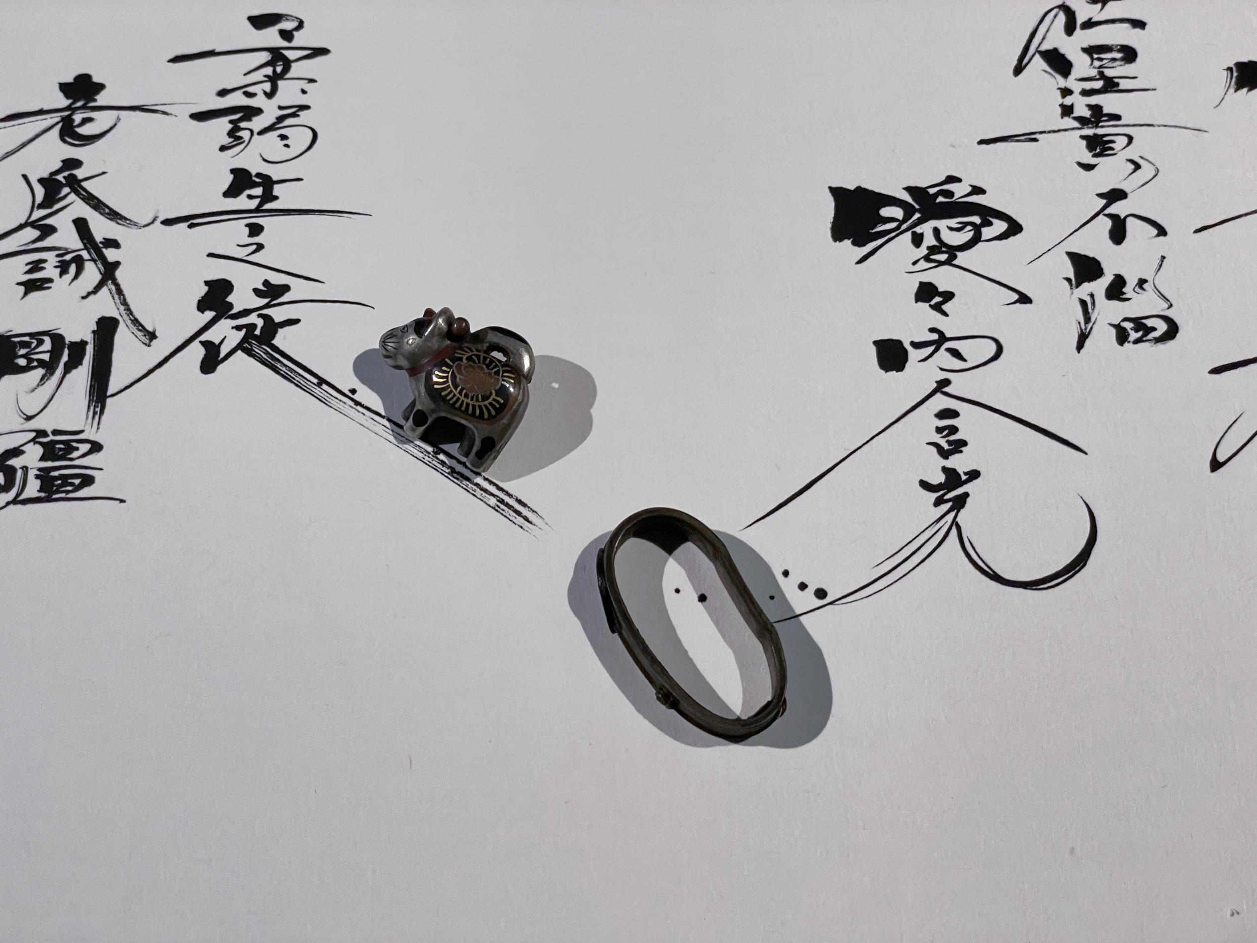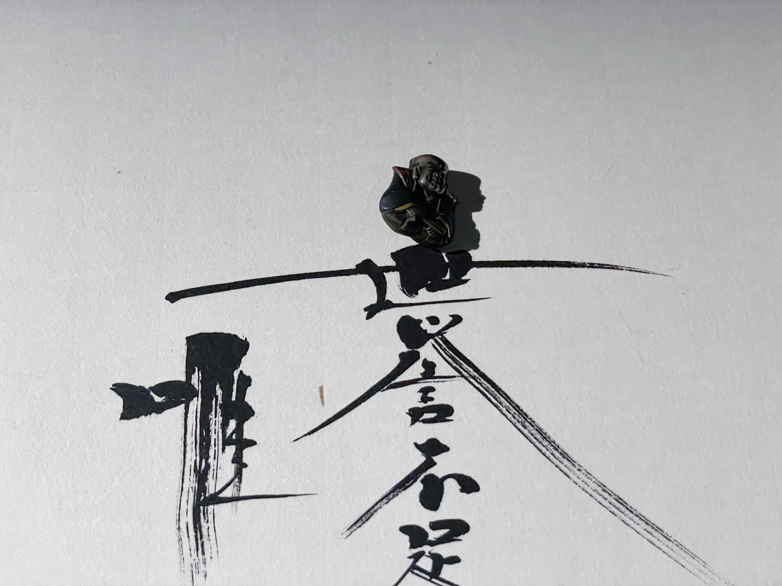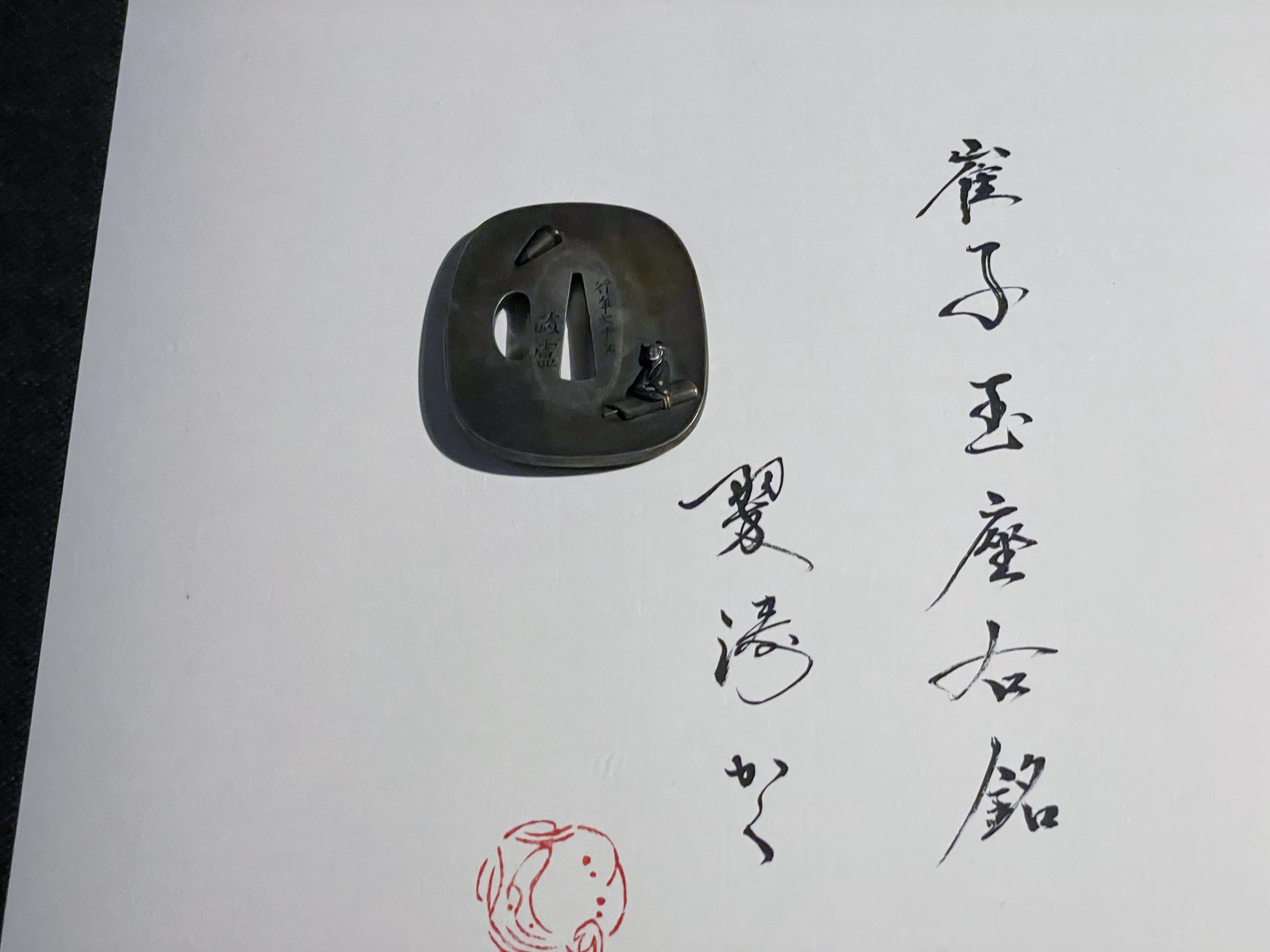 「蔵王の銘」の末尾に置かれていた鍔に刻まれている江戸時代後期の装剣金工師・岩間政盧の作で、書のところどころに置かれたいるフィギュアもこの脇差しとセットになった打刀に取り付けられていたものと思われます。「行年七十」は通常故人に対しての表現のはずですが、ここではまだピンピンしている岩間政盧が自身のことを洒落ているようです。