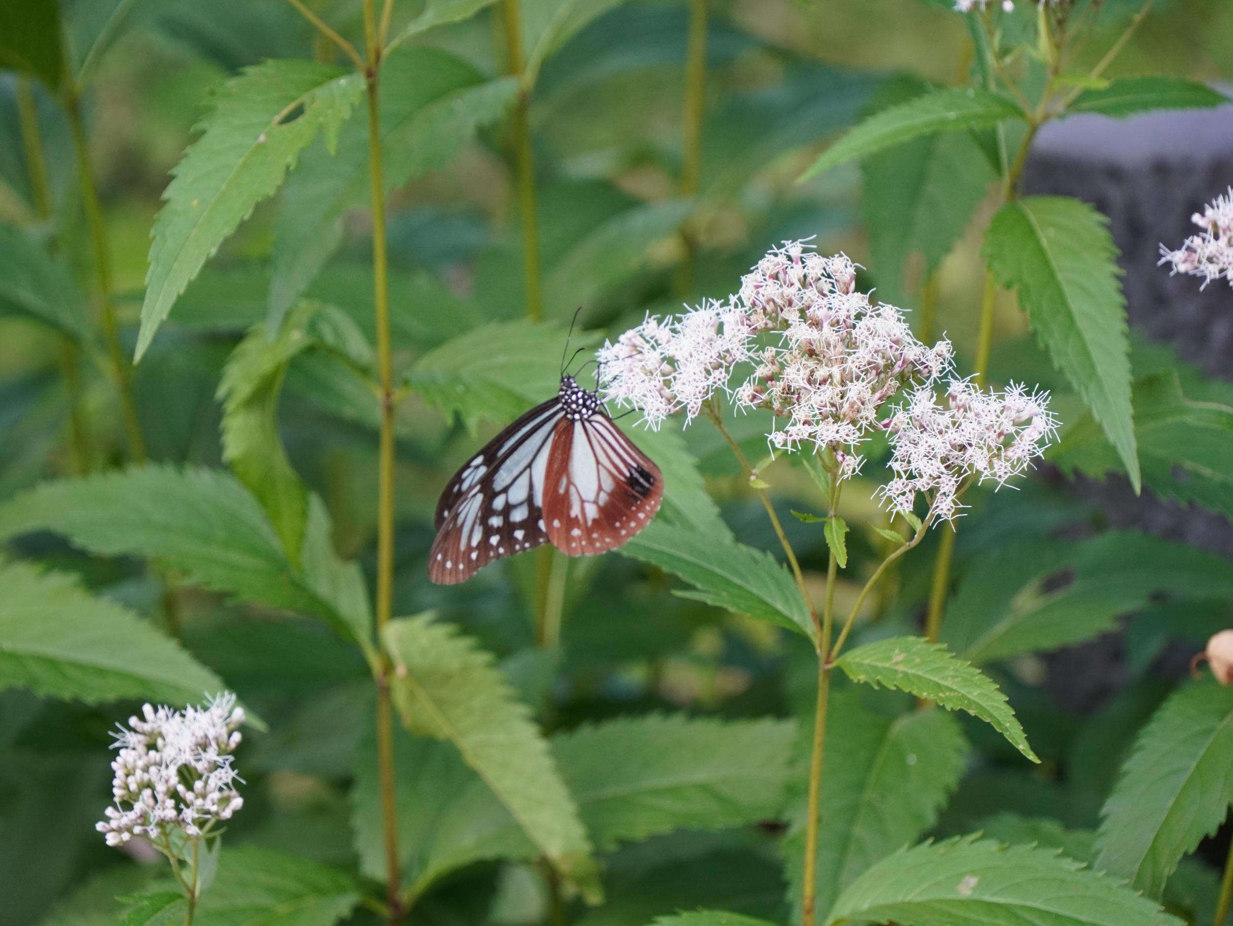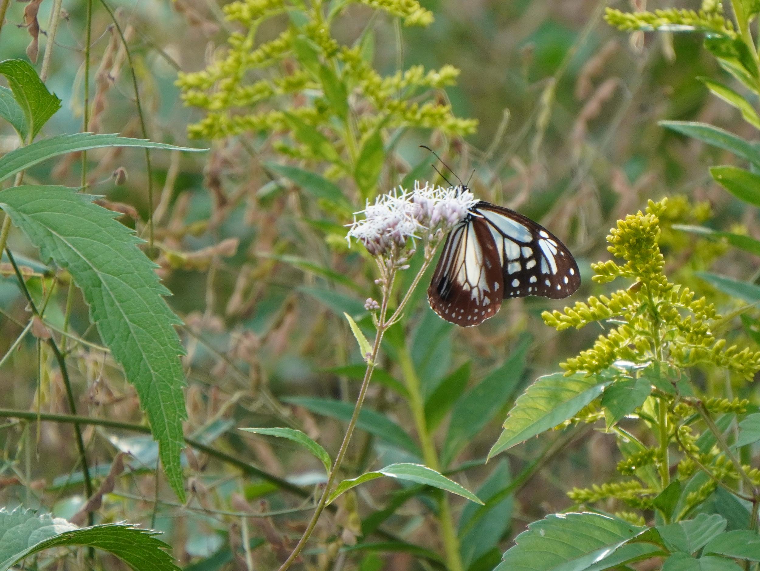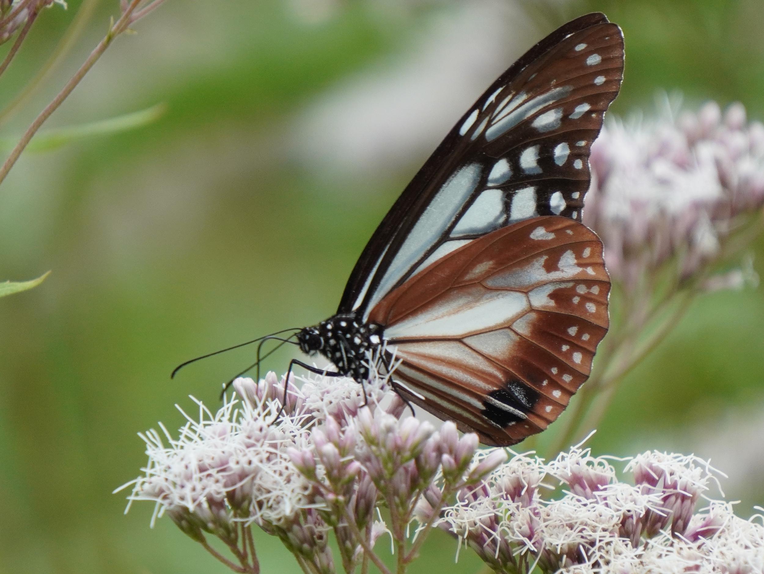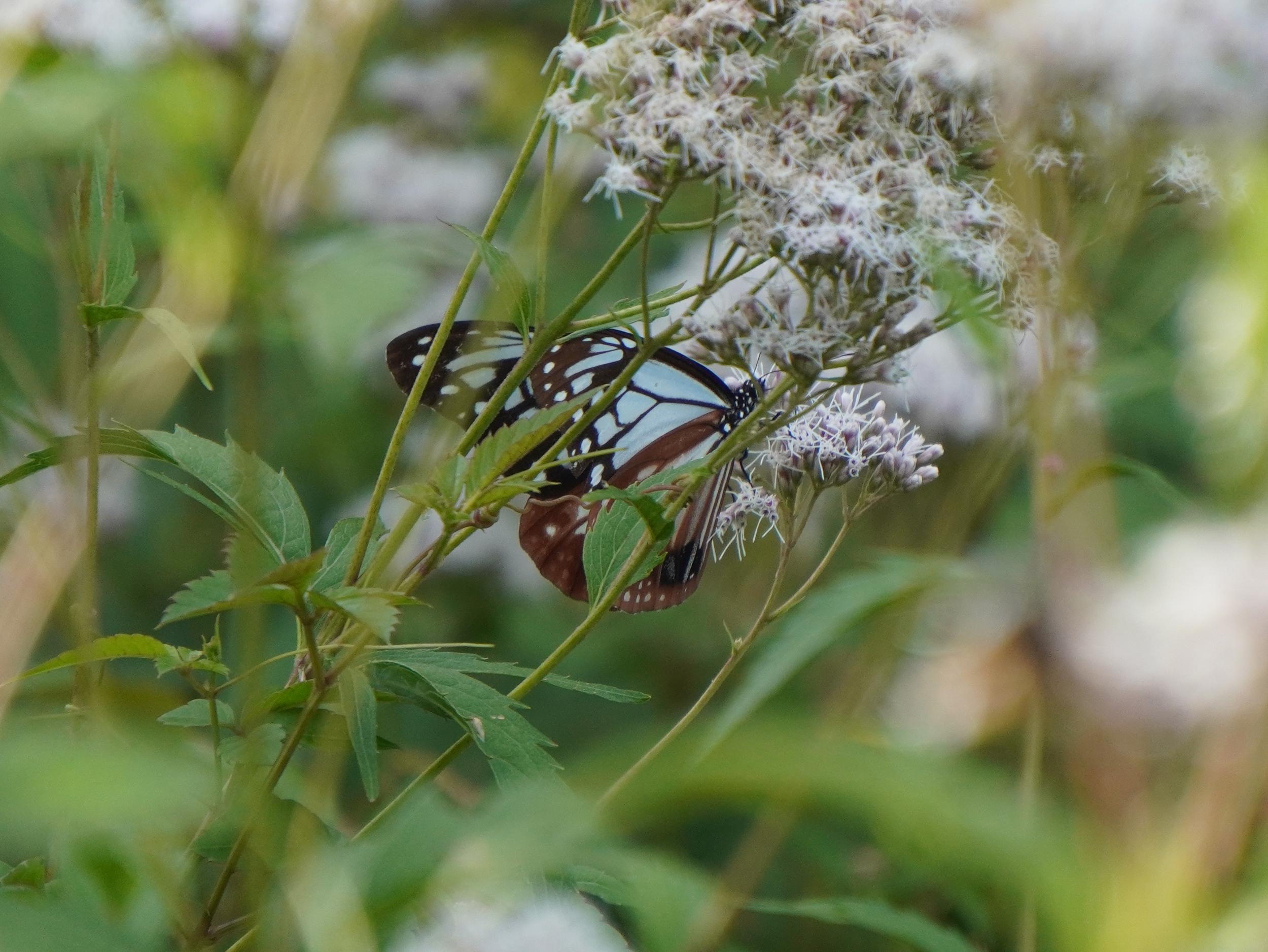 アサギマダラはフジバカマの陰にいました。1時間前に見たコと同じかと思いきや、よぉく見ると翅の模様が微妙に違っていて別のコです。左後翅外側の比較、左が1時間前のコ、右が上のコです。意外と個体差が大きくてビックリです。