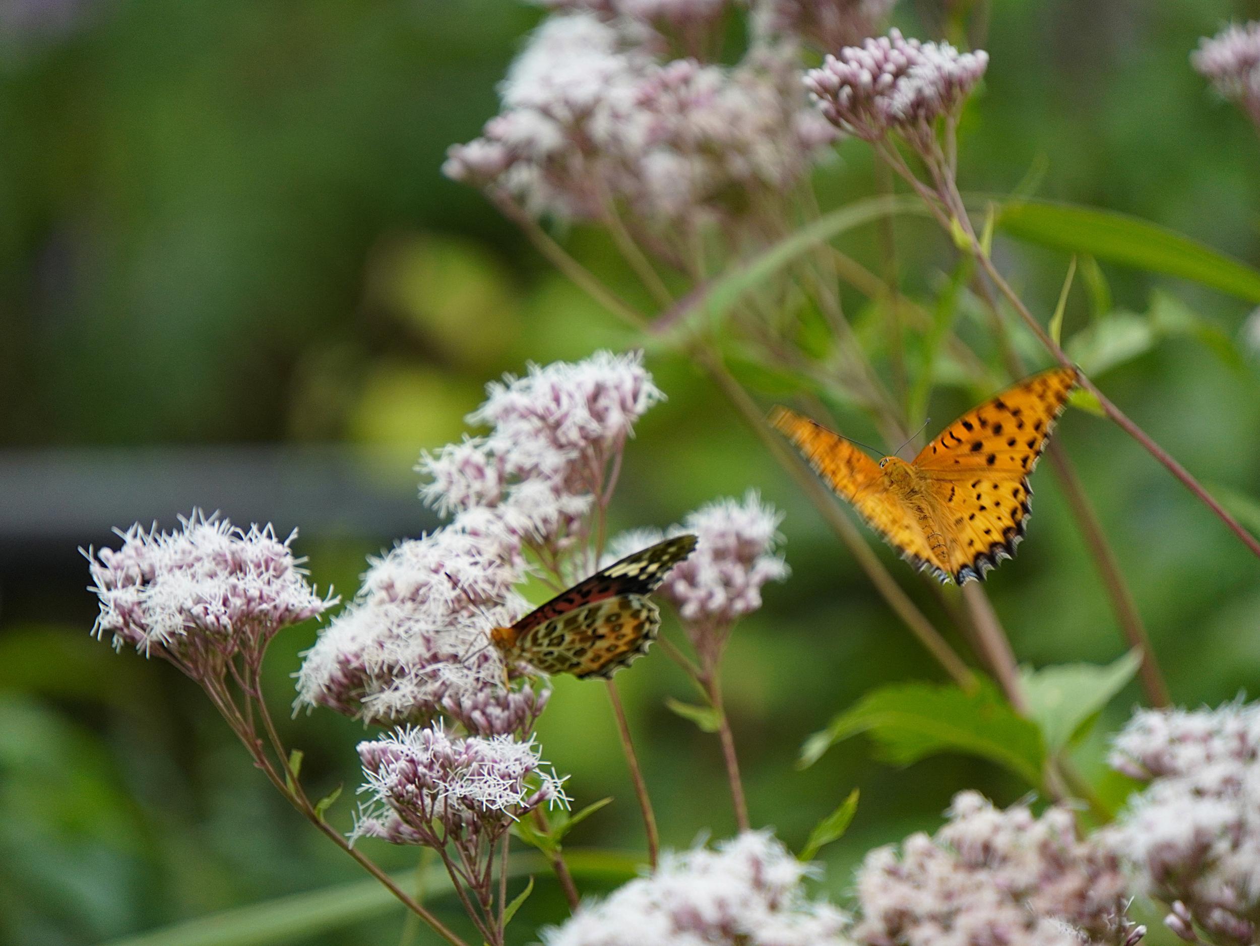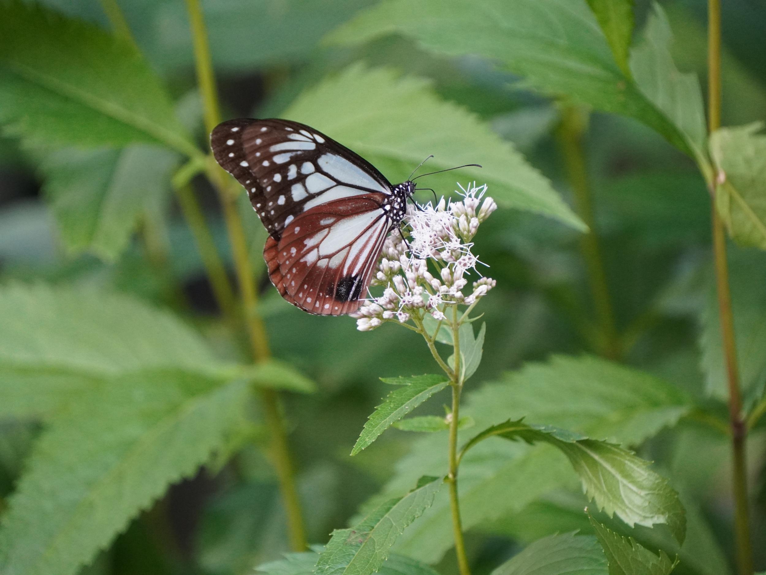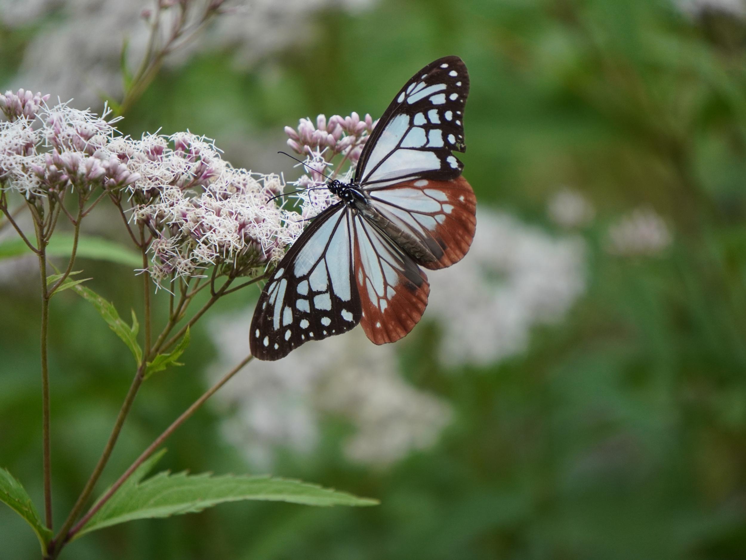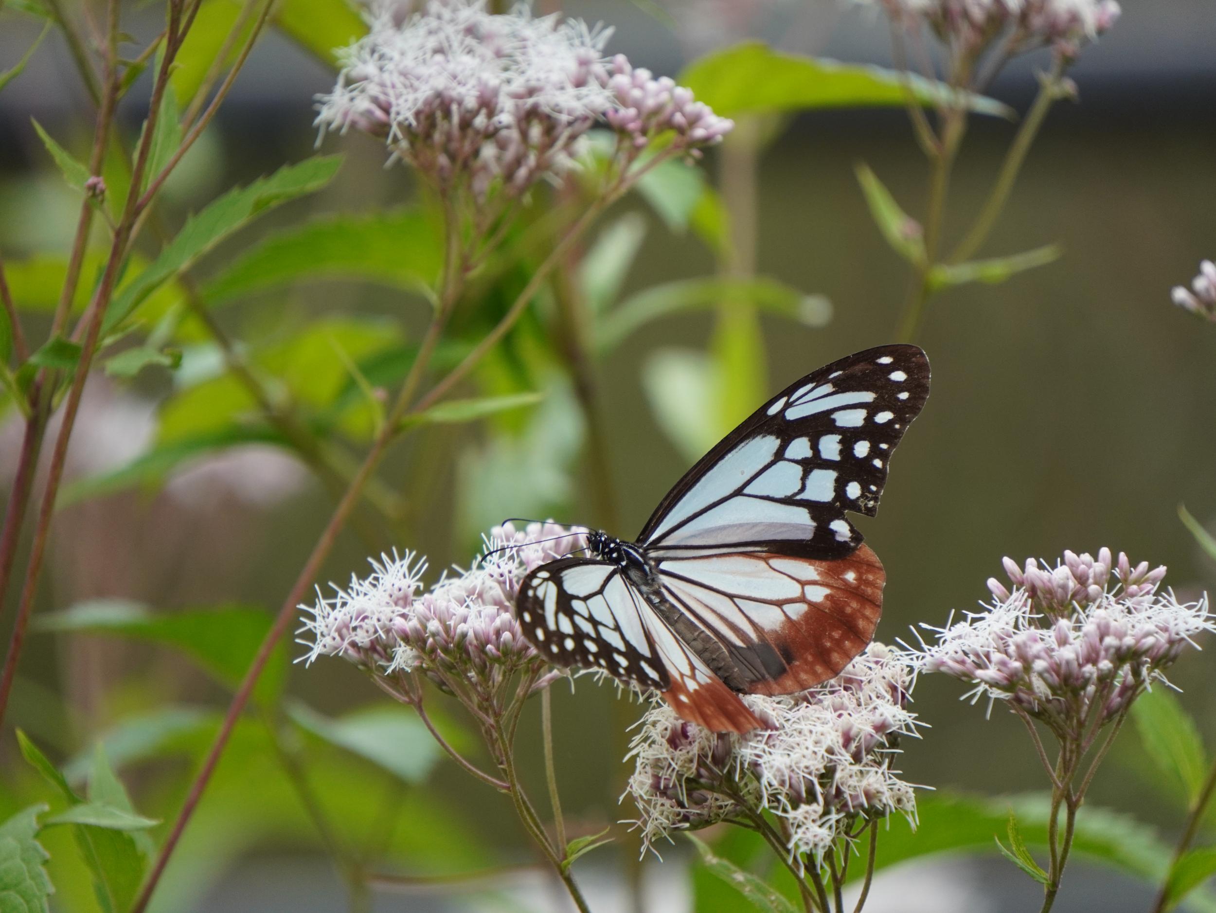アサギマダラはフジバカマの陰にいました。1時間前に見たコと同じかと思いきや、よぉく見ると翅の模様が微妙に違っていて別のコです。左後翅外側の比較、左が1時間前のコ、右が上のコです。意外と個体差が大きくてビックリです。