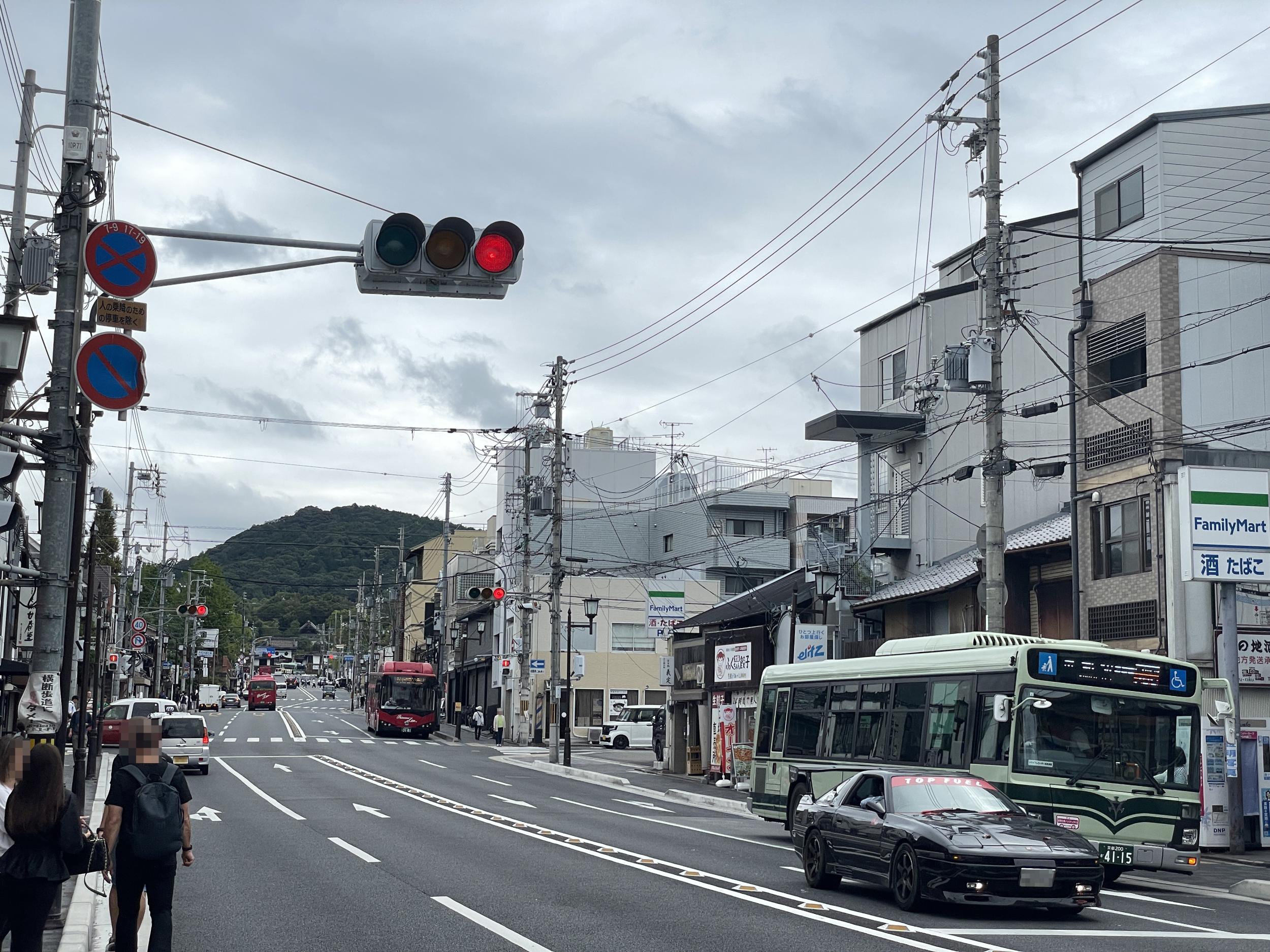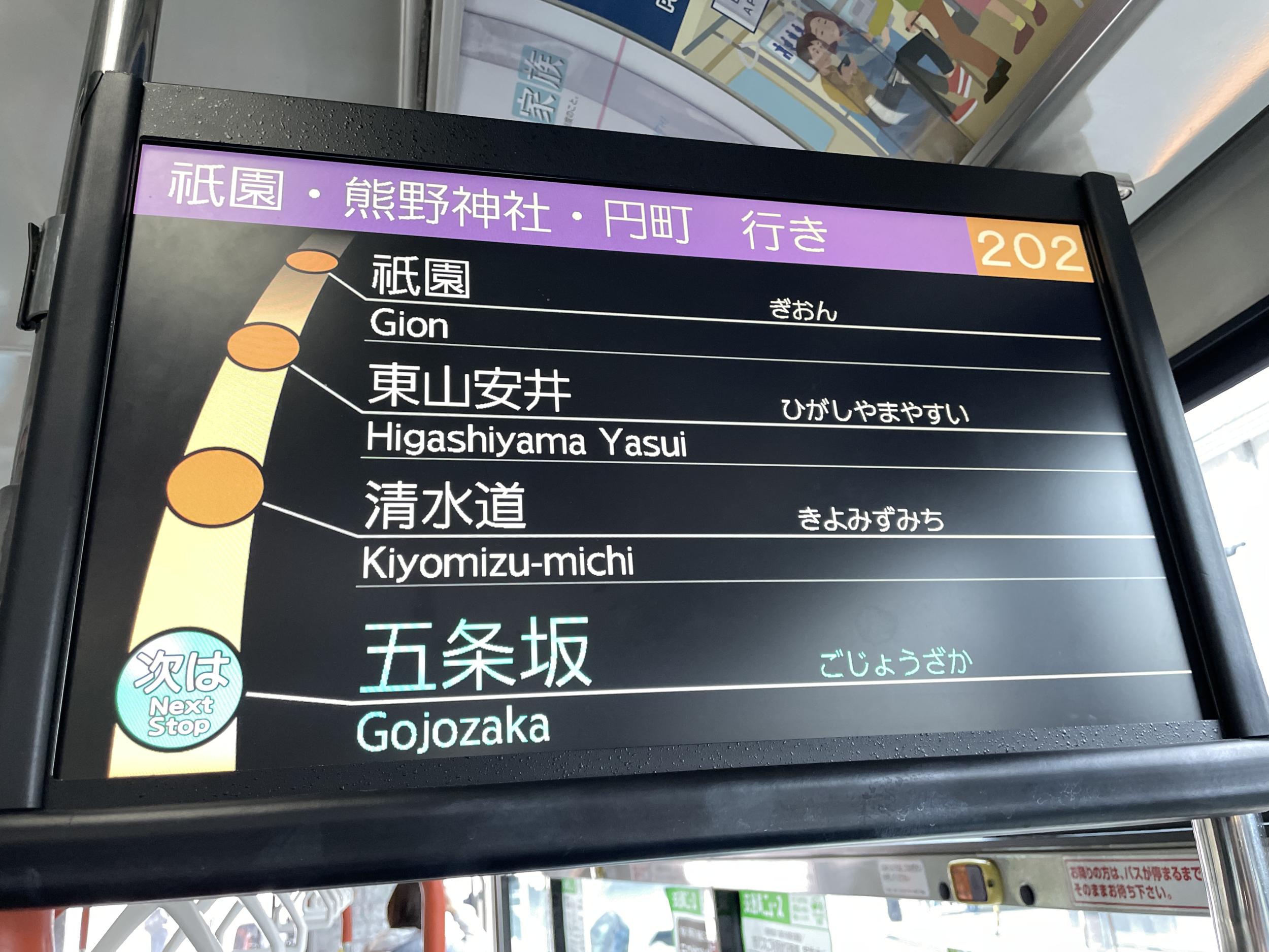 京阪特急3000系カブリツキで七条に到着、七条通を東へ。突き当りは智積院、向こうの山は阿弥陀ヶ峰、山頂に豊臣秀吉の廟所、豊国廟があります。2台の赤いバスは京都駅や四条河原町と京都女子大を高頻度で結んでいるプリンセスラインという路線バス。