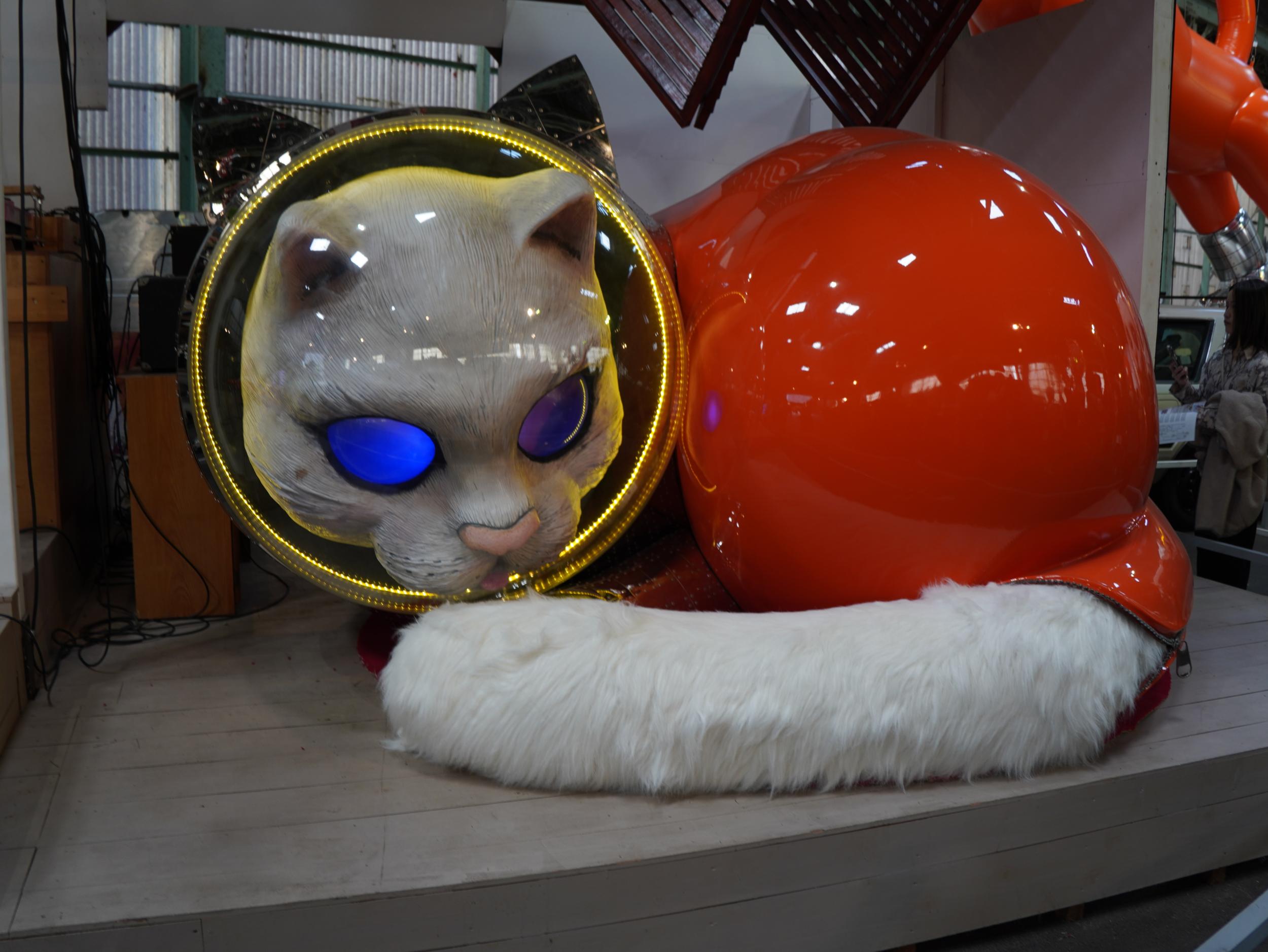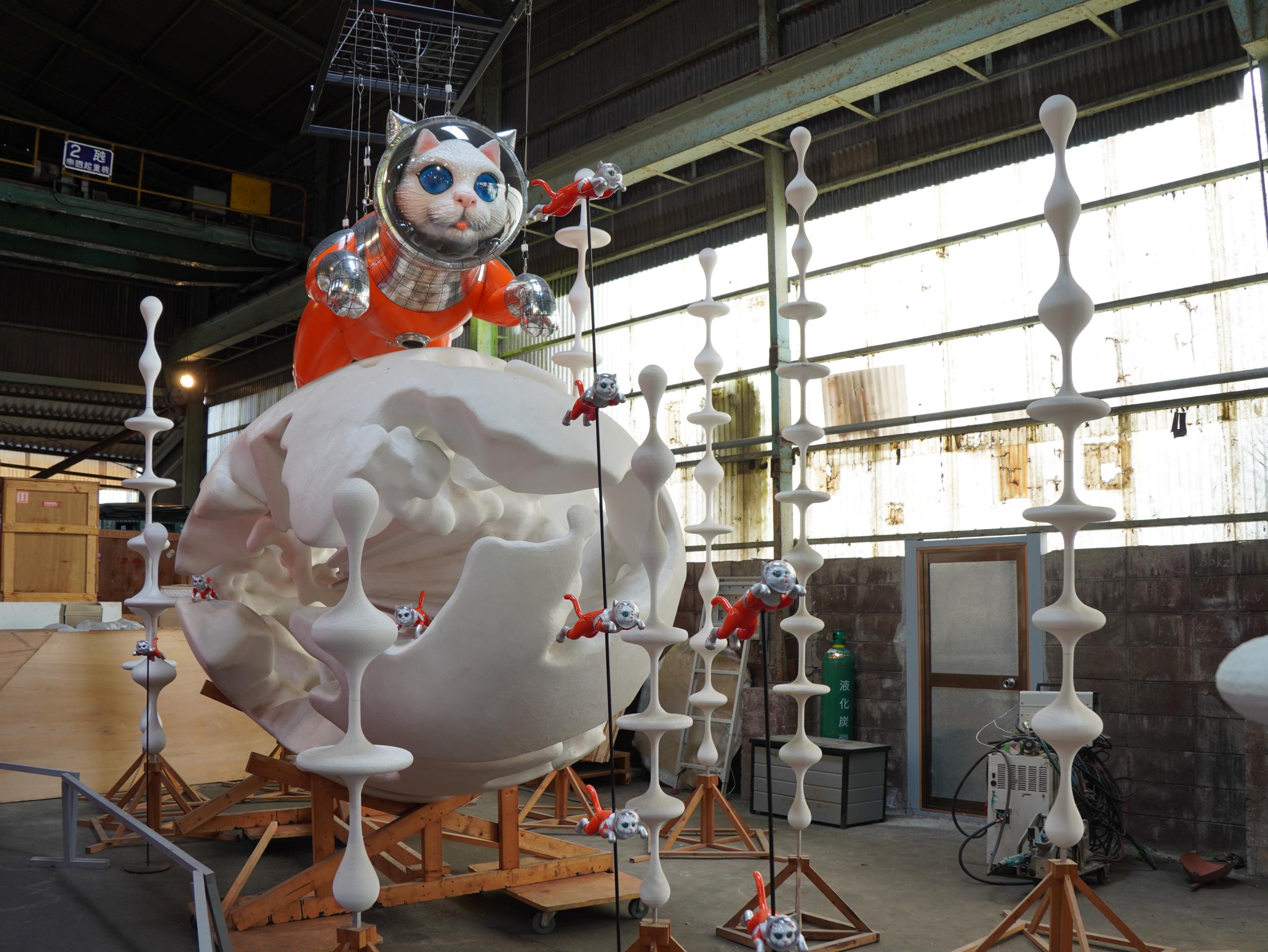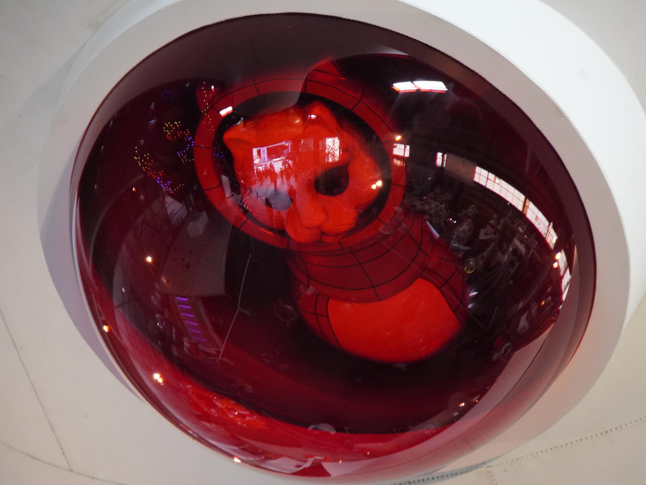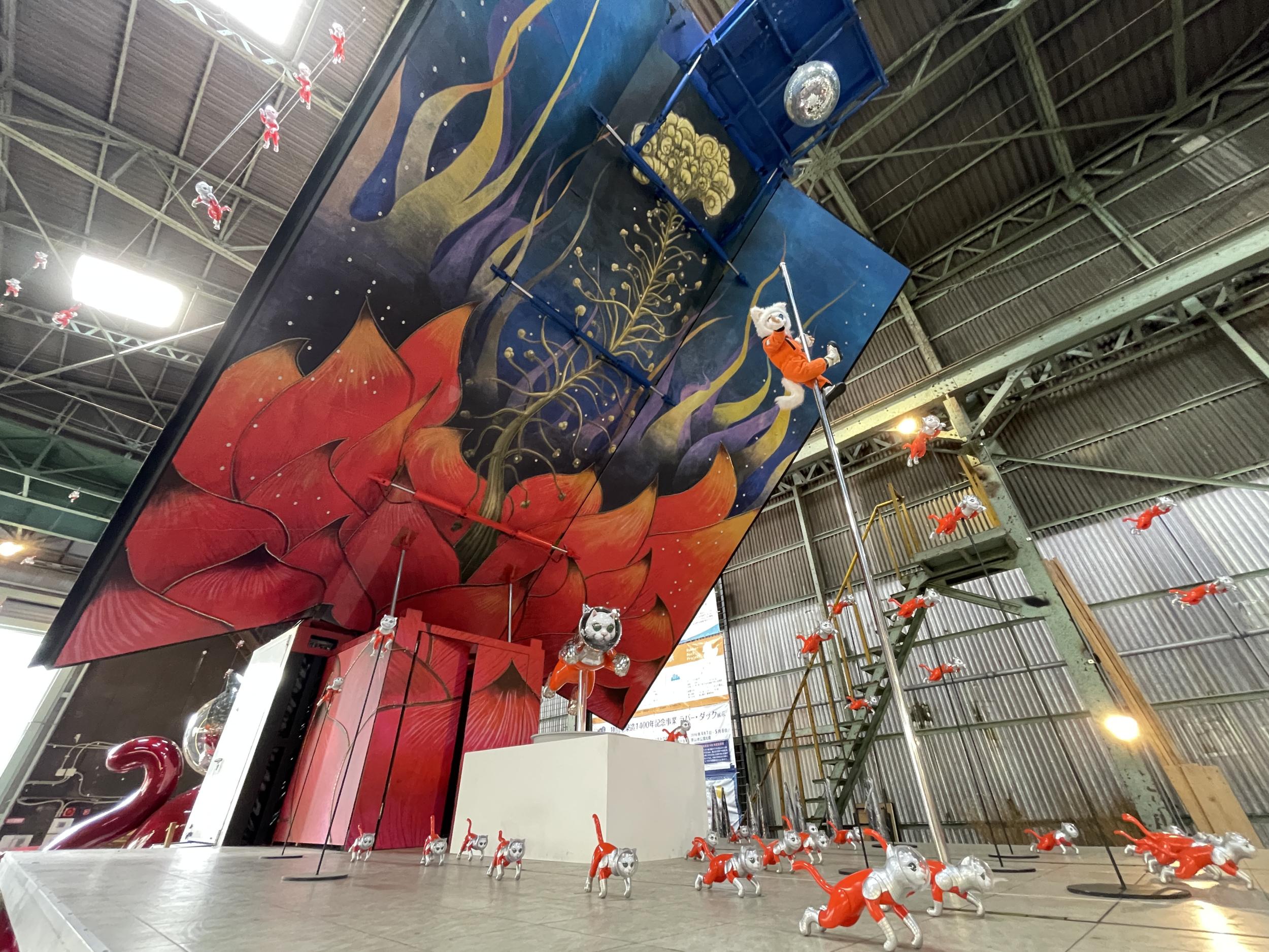 アルミ製の宇宙船ルカ号。バルーンのルカ号よりかっこいい。太陽の塔好きの自分としては大いに気に入りました。太陽の塔内部の生命の樹と同様に芽が伸びていて根元には生命の素らしき金色の物体。赤い体内の肉襞が全部シップスキャットでできているのはちょっとキショい。左側に立てられているのはお腹の蓋です。