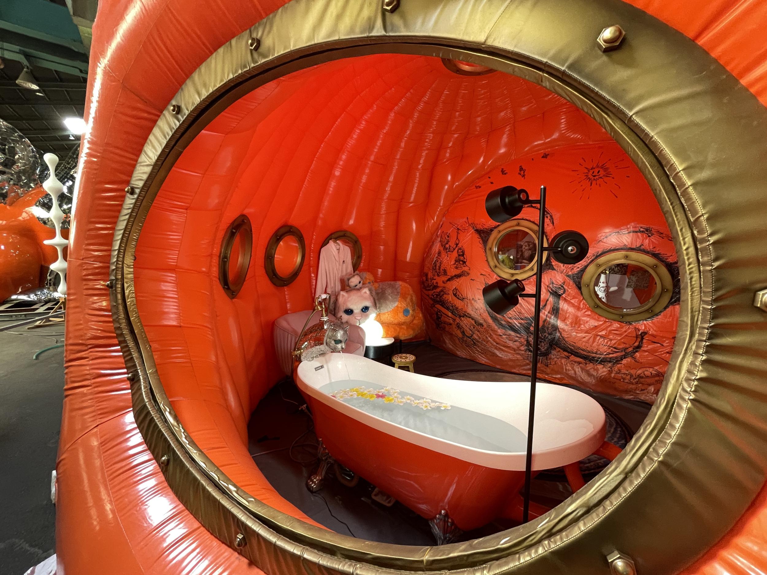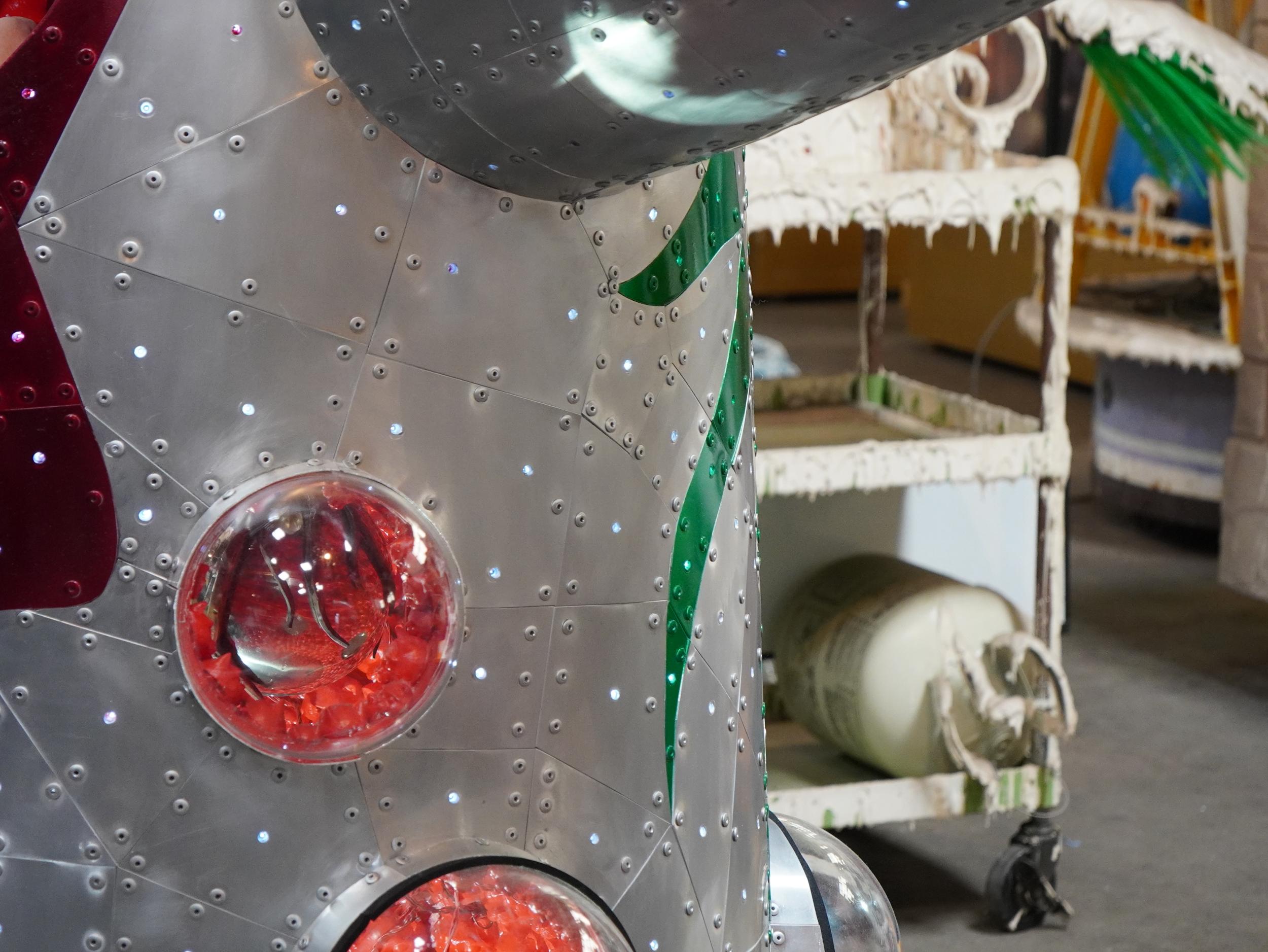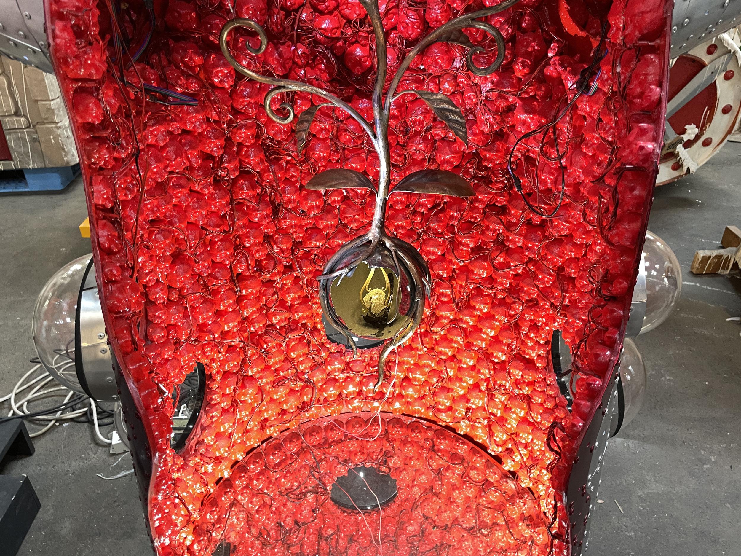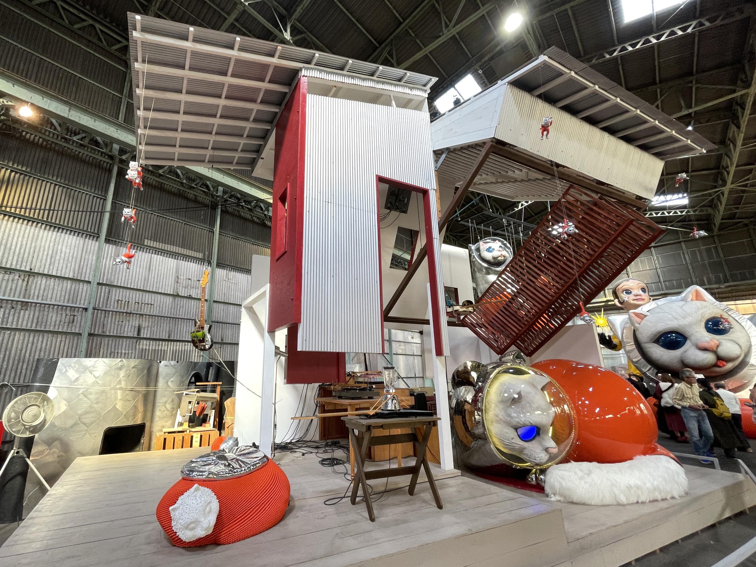 アルミ製の宇宙船ルカ号。バルーンのルカ号よりかっこいい。太陽の塔好きの自分としては大いに気に入りました。太陽の塔内部の生命の樹と同様に芽が伸びていて根元には生命の素らしき金色の物体。赤い体内の肉襞が全部シップスキャットでできているのはちょっとキショい。左側に立てられているのはお腹の蓋です。