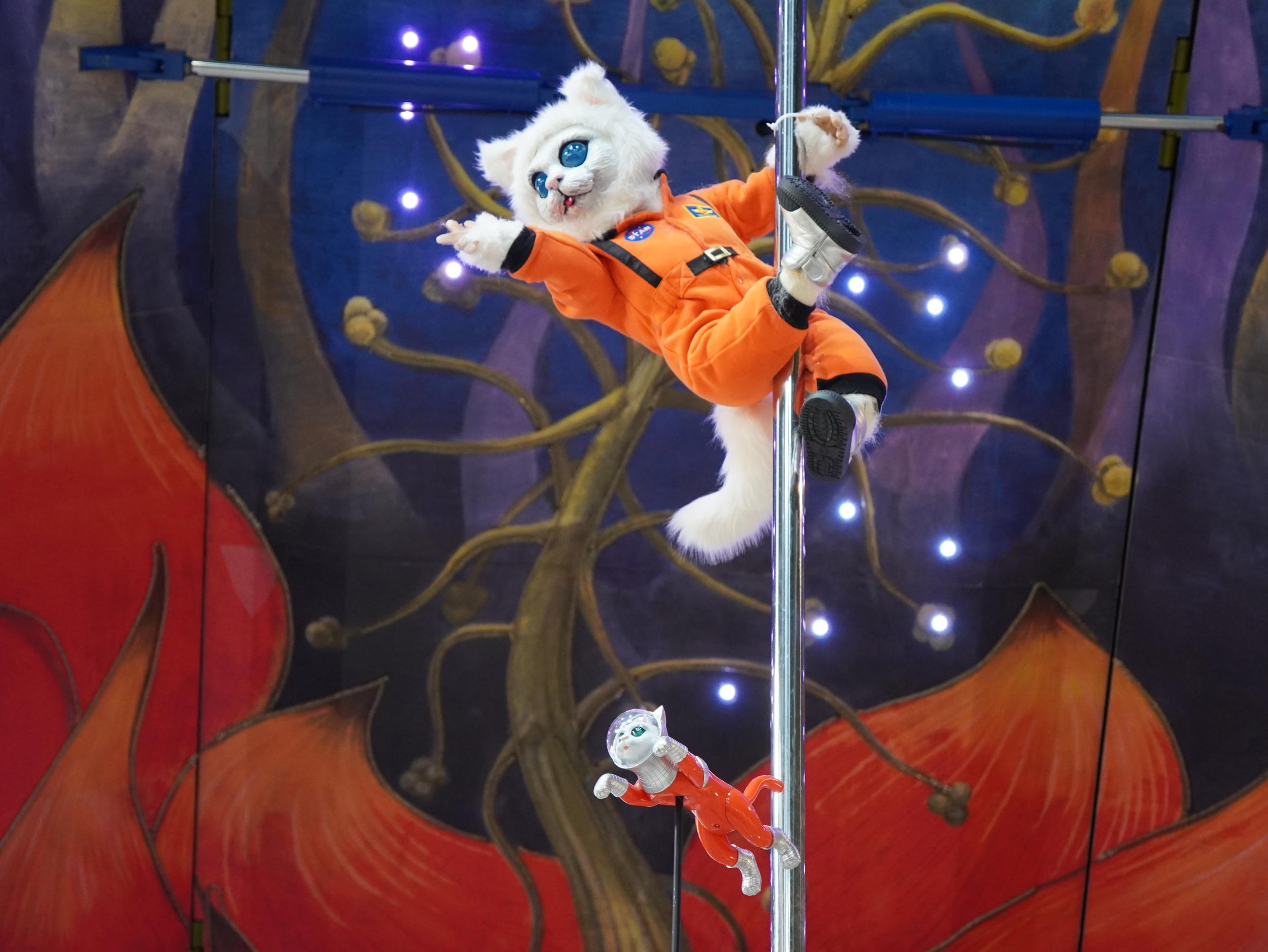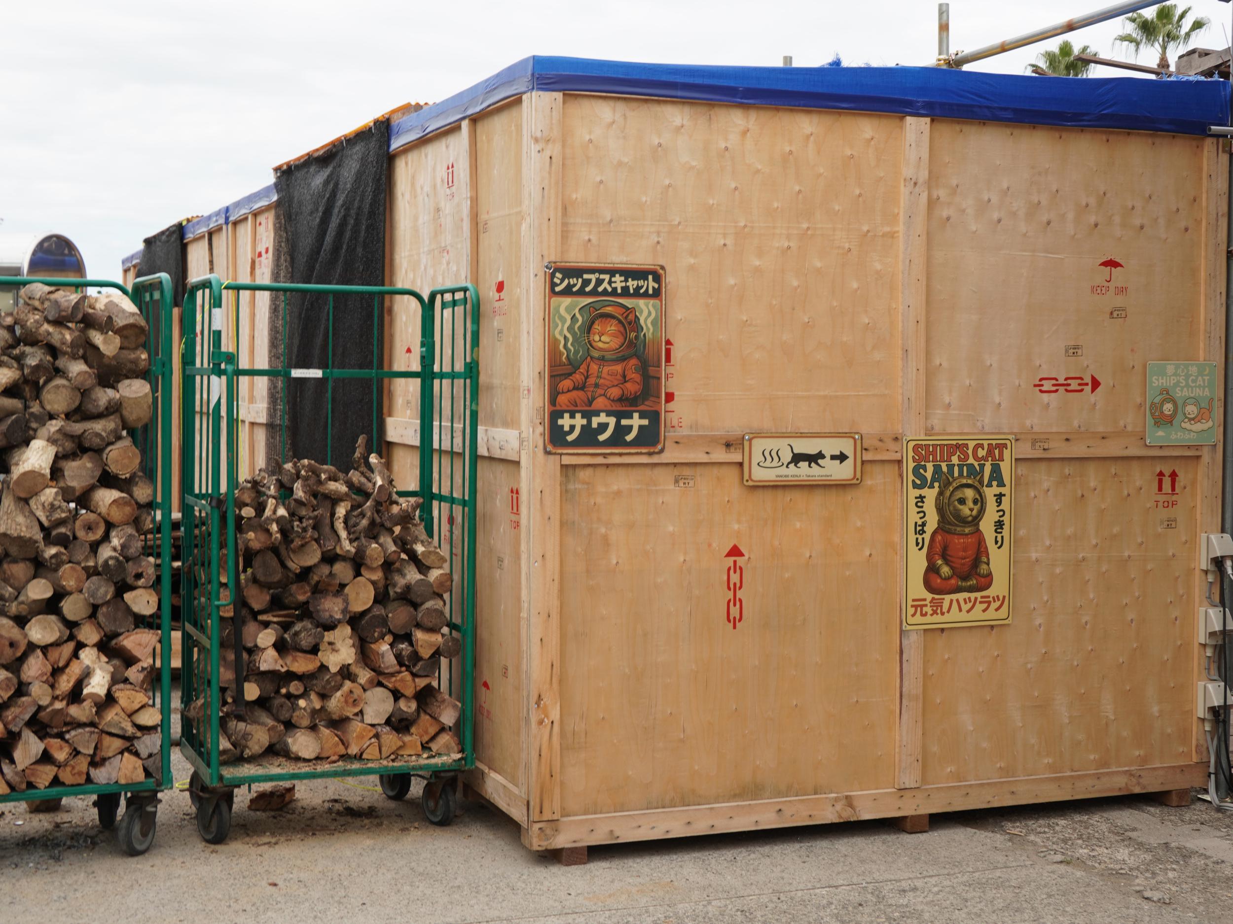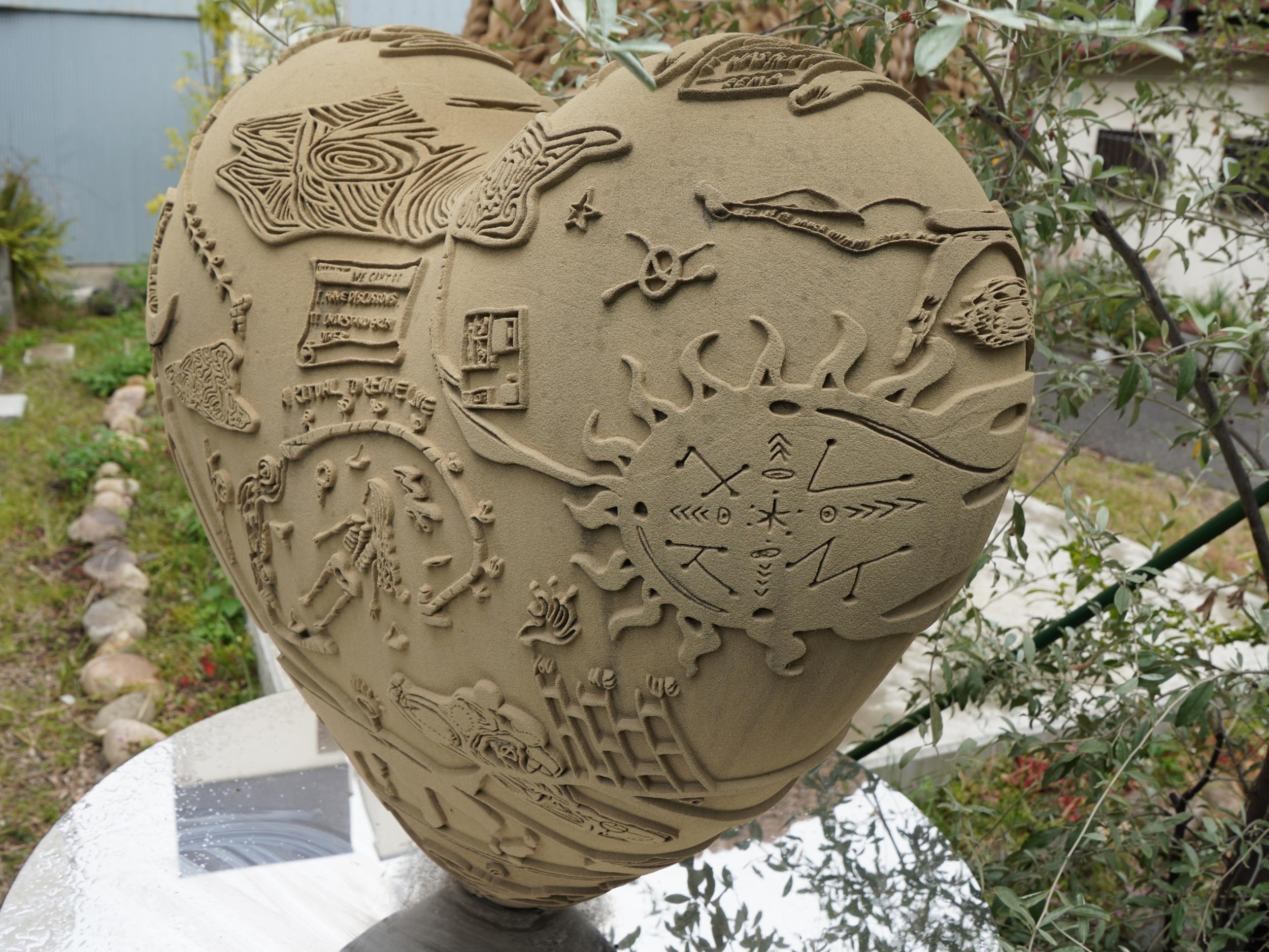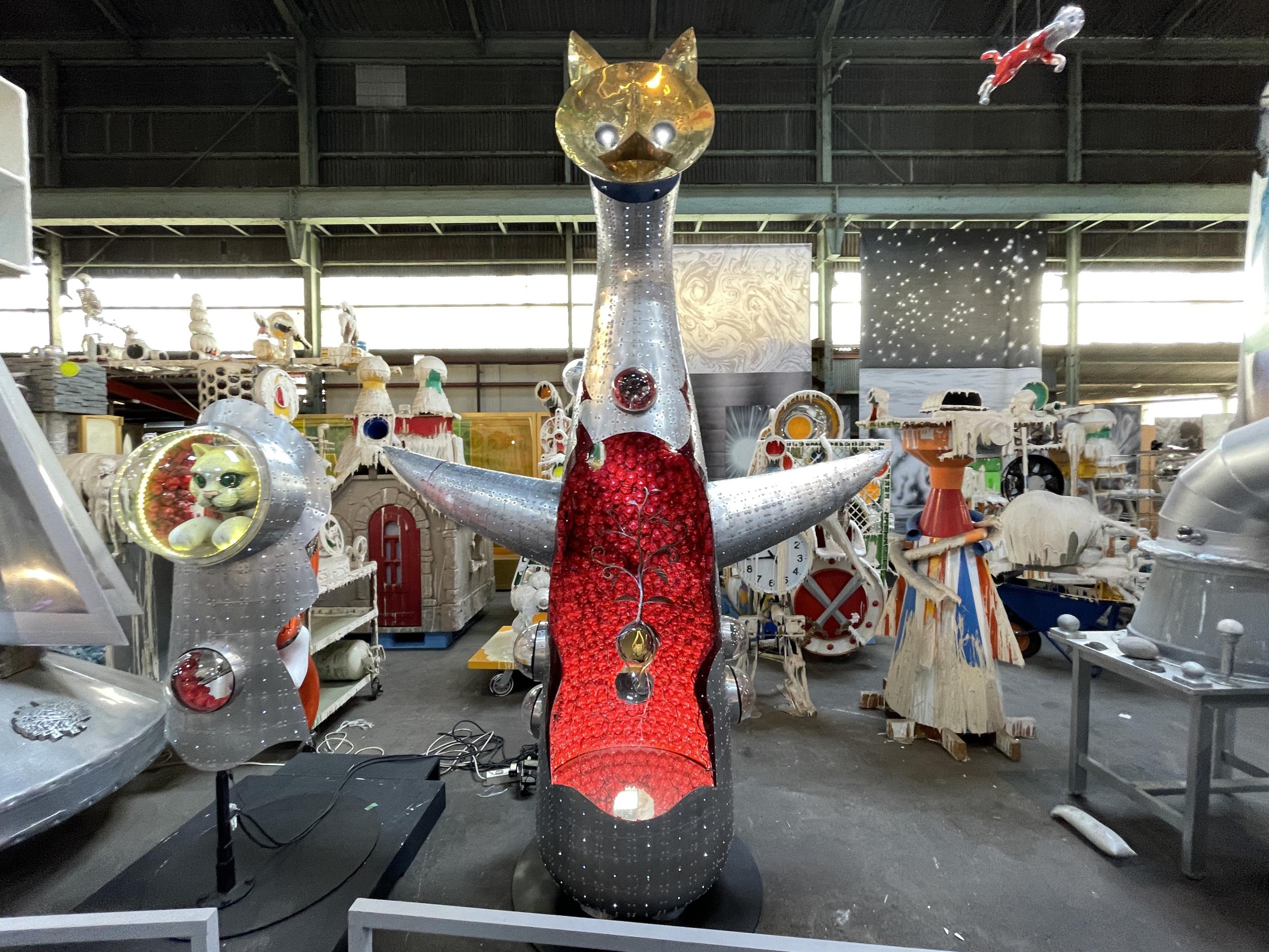 アルミ製の宇宙船ルカ号。バルーンのルカ号よりかっこいい。太陽の塔好きの自分としては大いに気に入りました。太陽の塔内部の生命の樹と同様に芽が伸びていて根元には生命の素らしき金色の物体。赤い体内の肉襞が全部シップスキャットでできているのはちょっとキショい。左側に立てられているのはお腹の蓋です。
