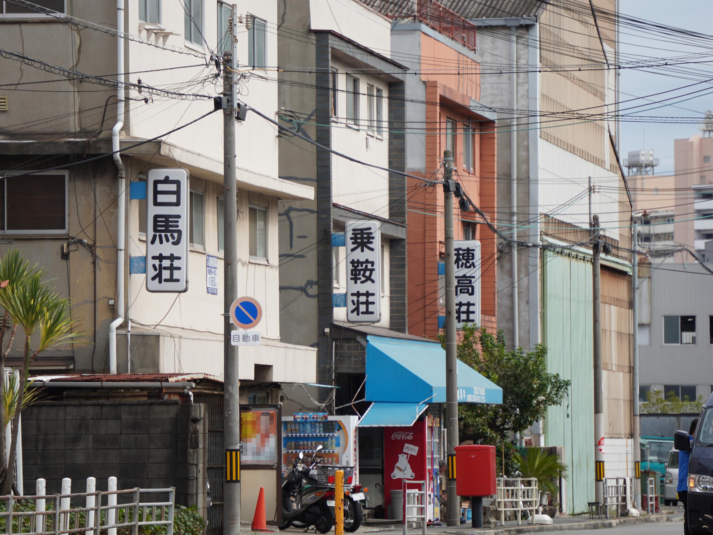 パラドールの隣には対極的な白馬荘・乗鞍荘・穂高荘、造船所で働く人たちのためのアパートで今も現役、家賃19,000円〜だそうです。素敵なホームページを見つけました。外観からはわからない清潔な関西間らしい広めの部屋も紹介されています。造船所の人たちのためなのに白馬・乗鞍・穂高。