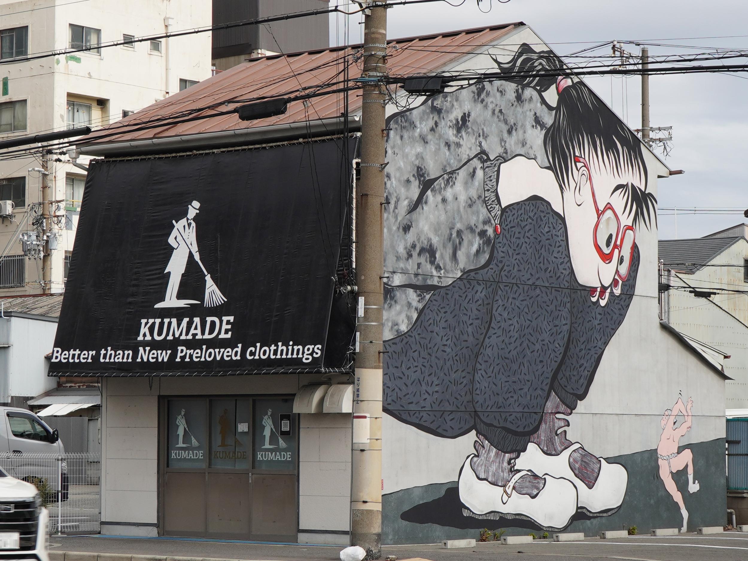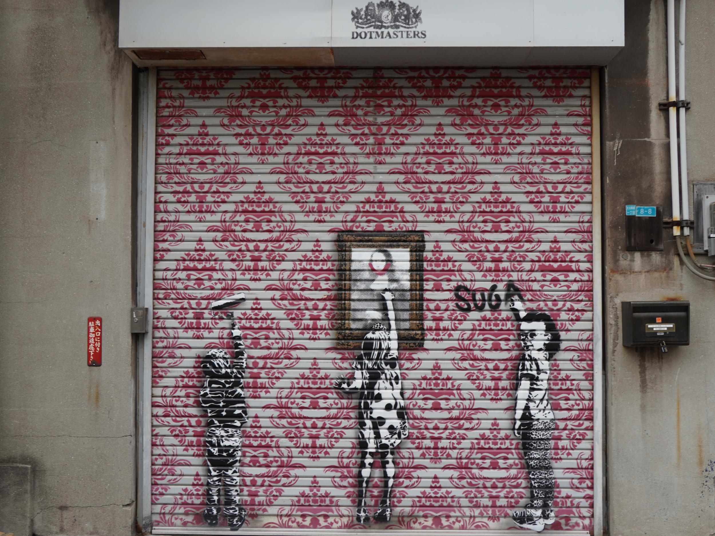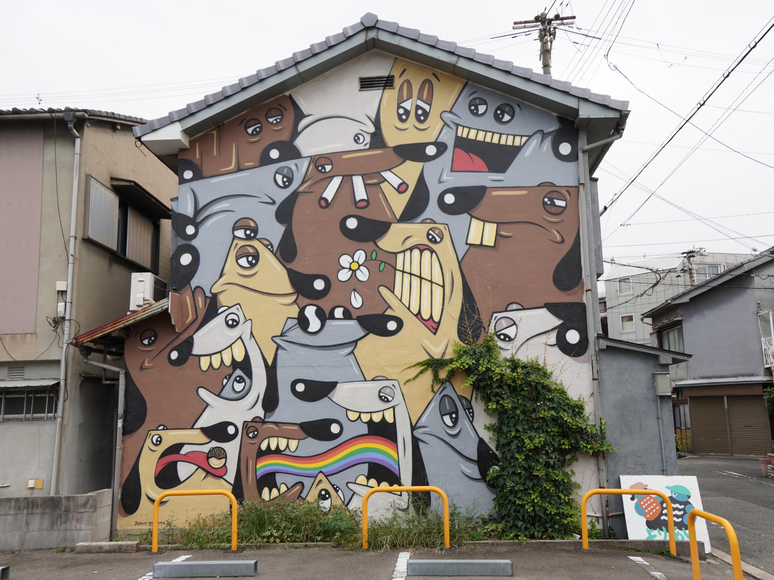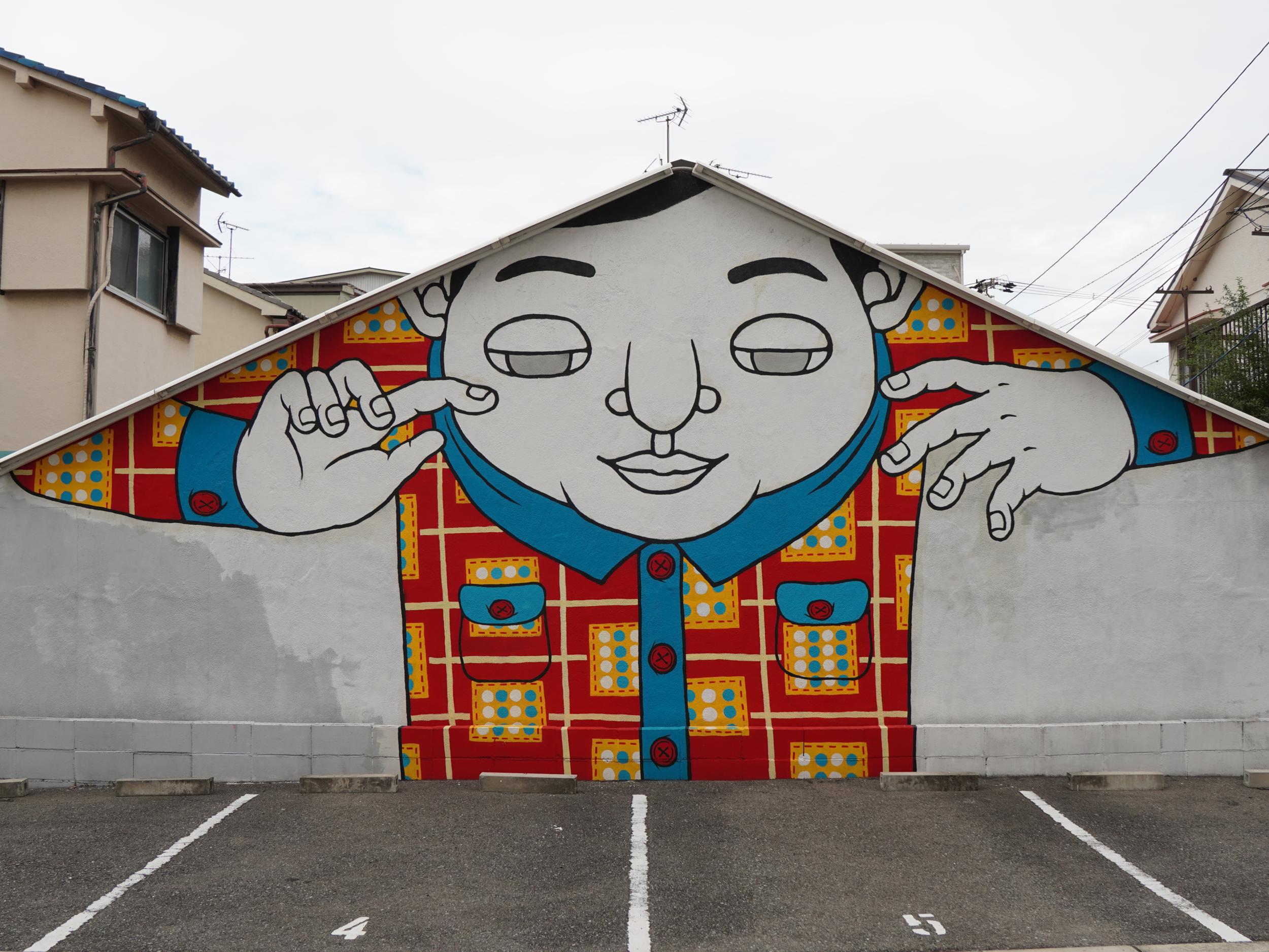 造船所跡向かいに。パラドールと名付けられたこの場所には異質で、スパニッシュスタイルの瀟洒なマンションの前、北加賀屋クリエイティブビレッジのマップの②番、鐡羅佑 かすむ。オオサンショウウオならぬ、巨大カスミサンショウウオです。スペインでお城や修道院などを改装した国営ホテルがパラドール、大昔に泊まったことを思い出しました。