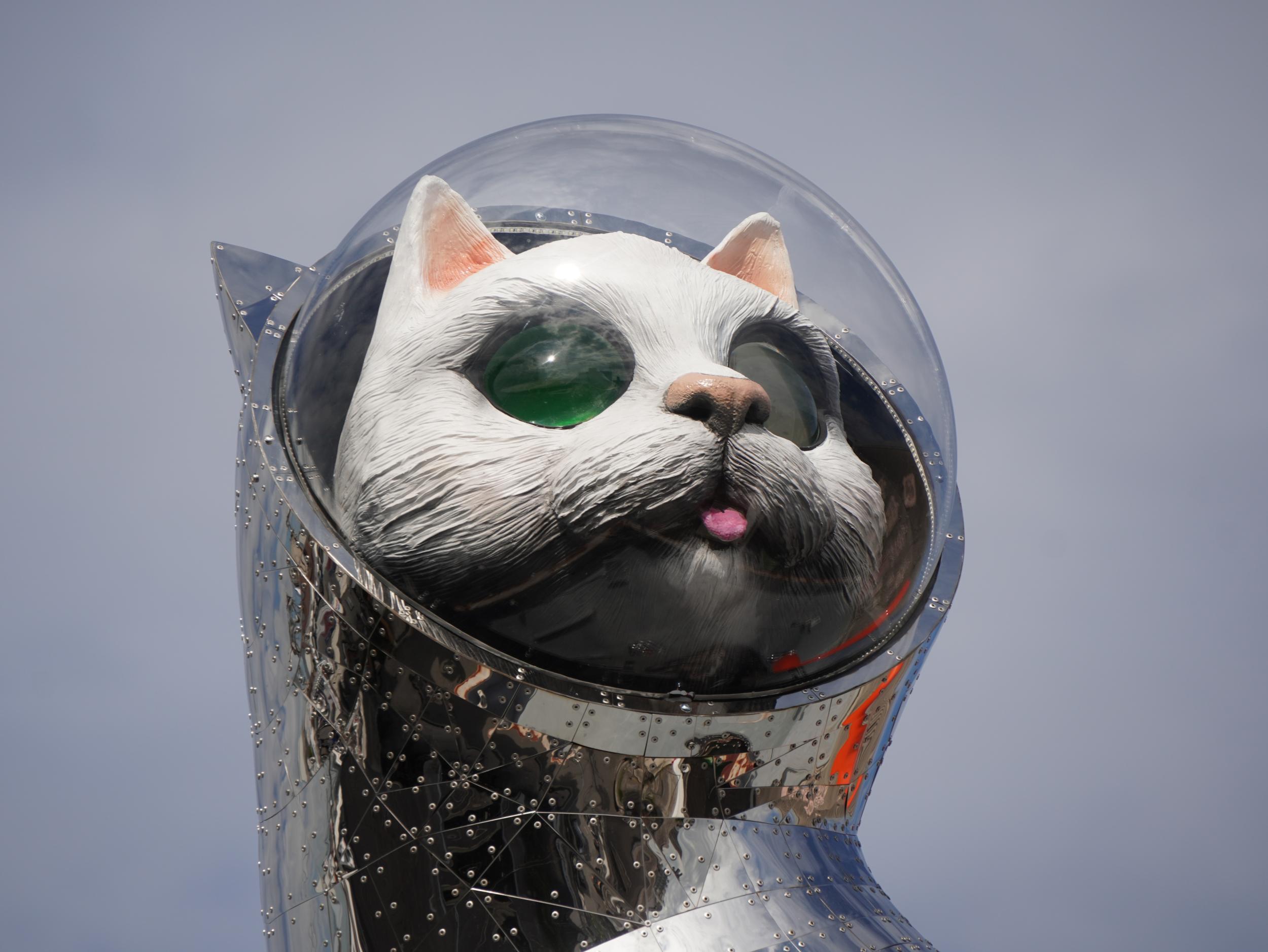 金色の顔の胴体からの離れ方も太陽の塔の黄金の顔と同じ、太陽の塔の黒い顔同様に背中に緑色の顔が描かれているのが少し見えるものの、後ろに回り込めないのが残念。ヤノベ氏のウェブページで緑色の顔を確認できます。ルカ号に乗って35億年前の地球にやってきた宇宙猫の物語もYouTubeで確認できます。