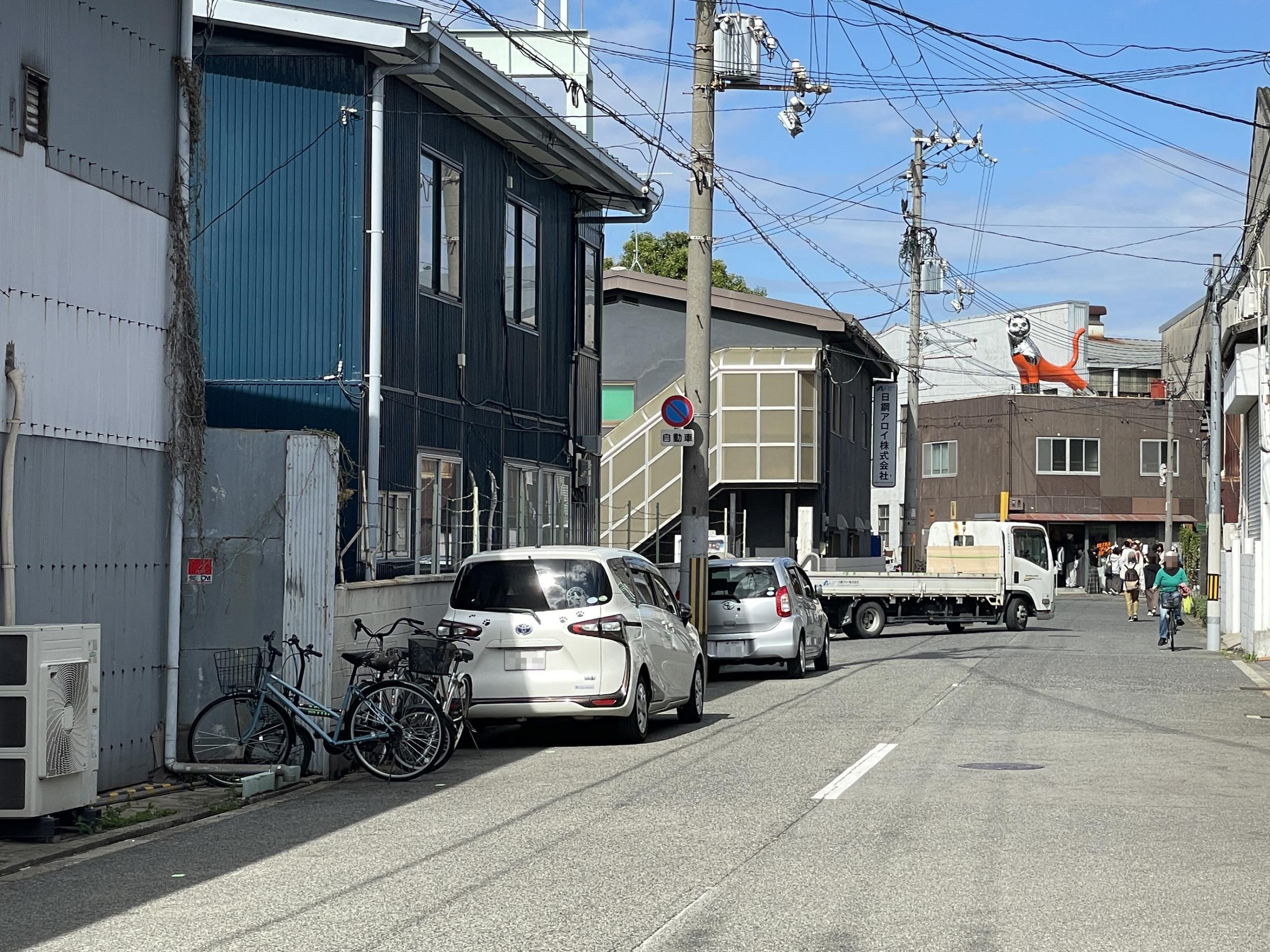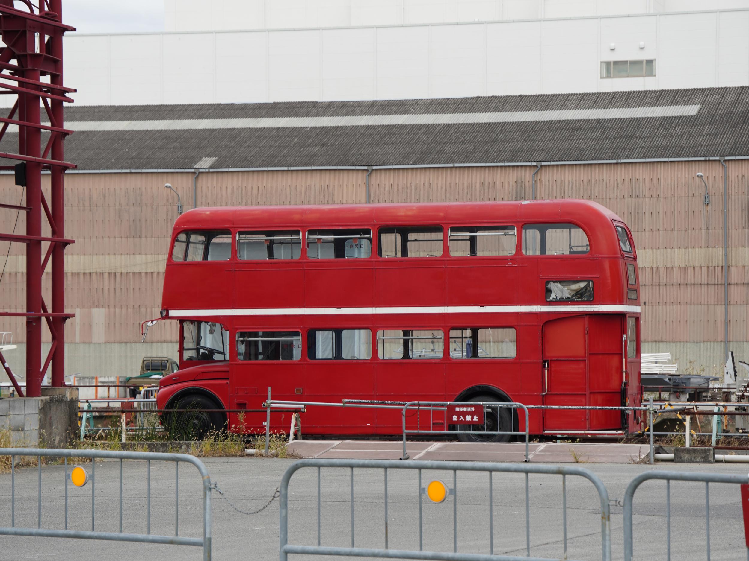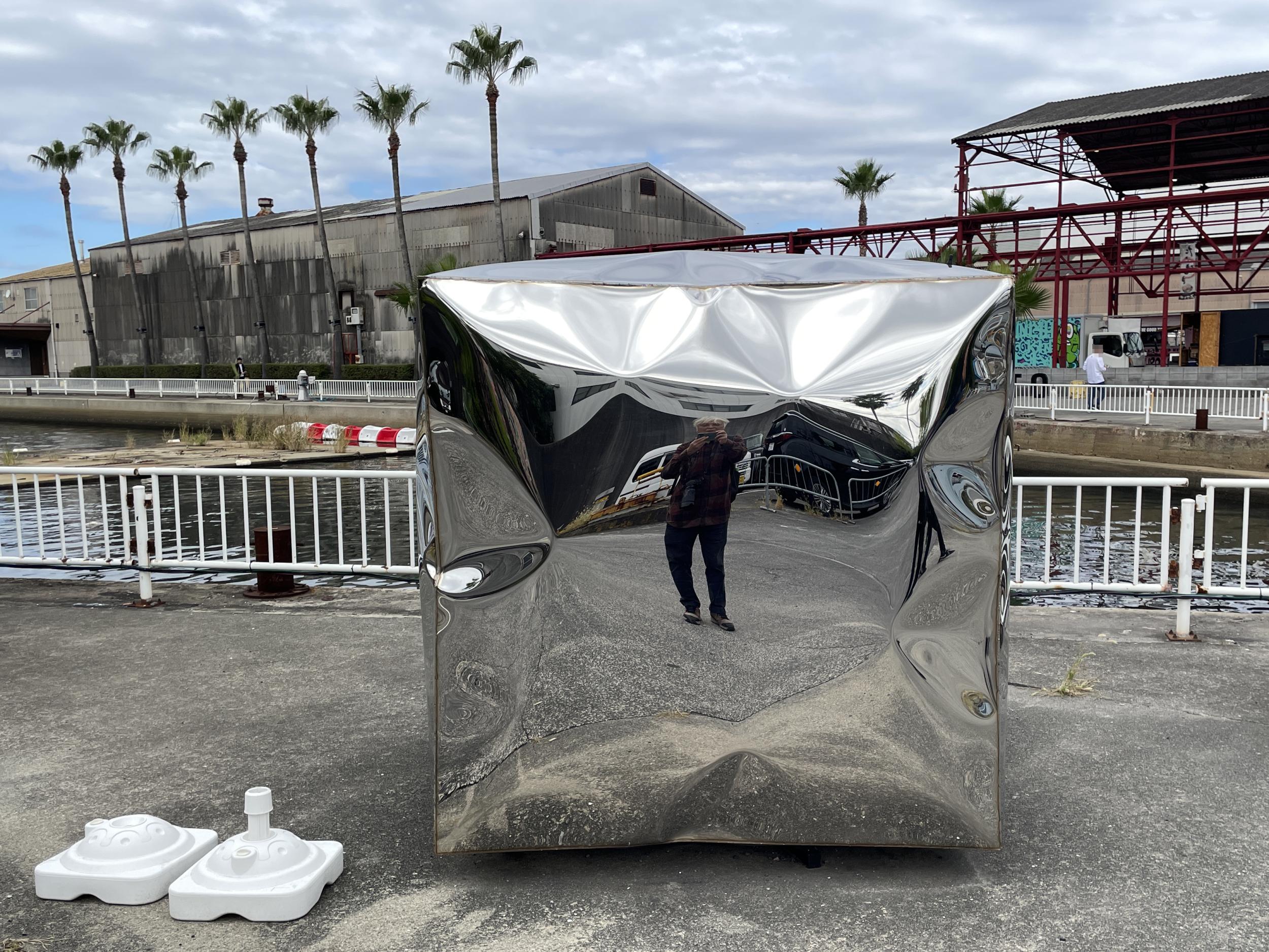 右手になぜかロンドンバス。左手の岸壁に上田要 北加賀屋の空気という鏡のオブジェ、自分の体が歪んでます。北加賀屋クリエイティブビレッジのマップの⑥番。