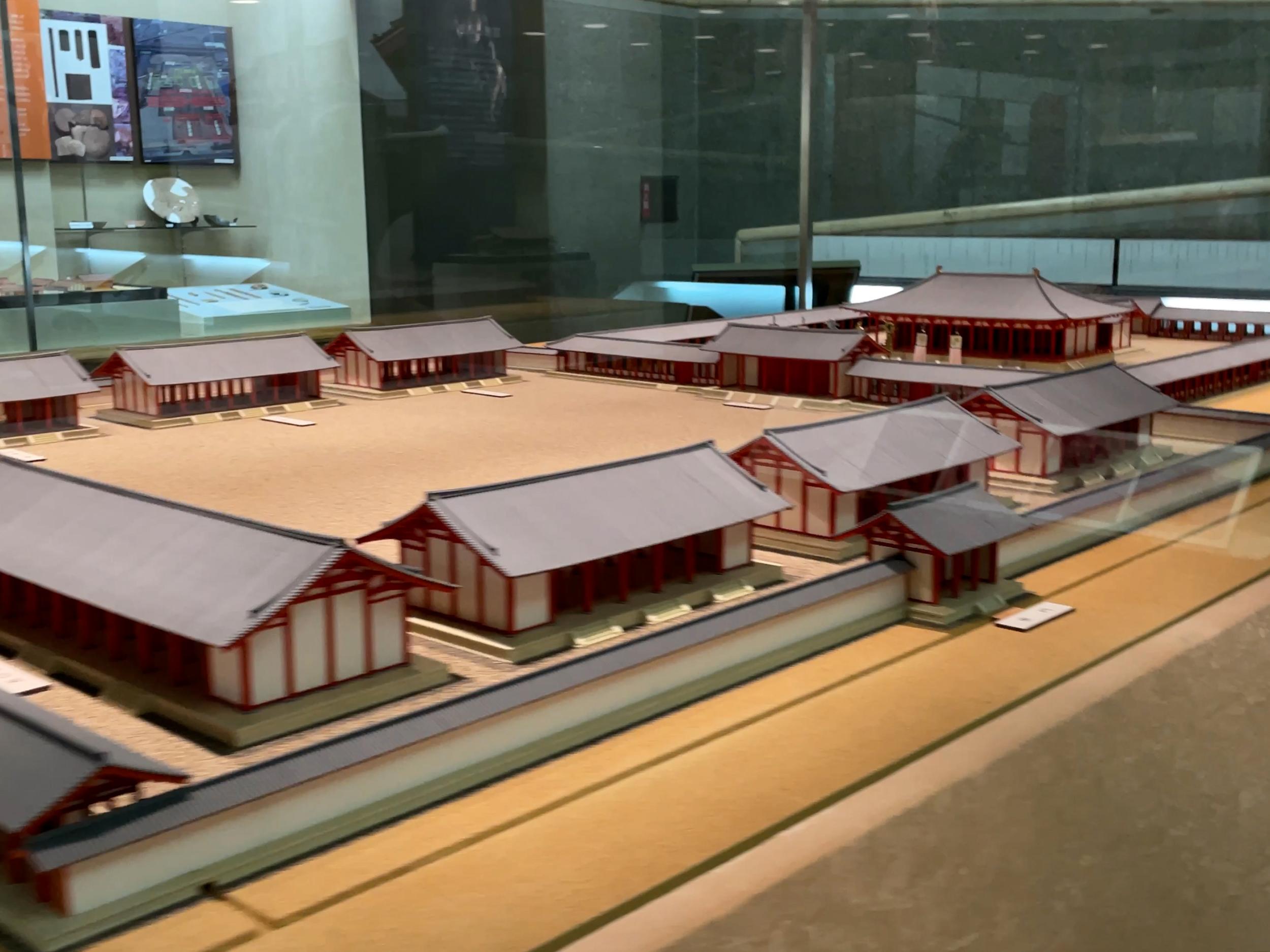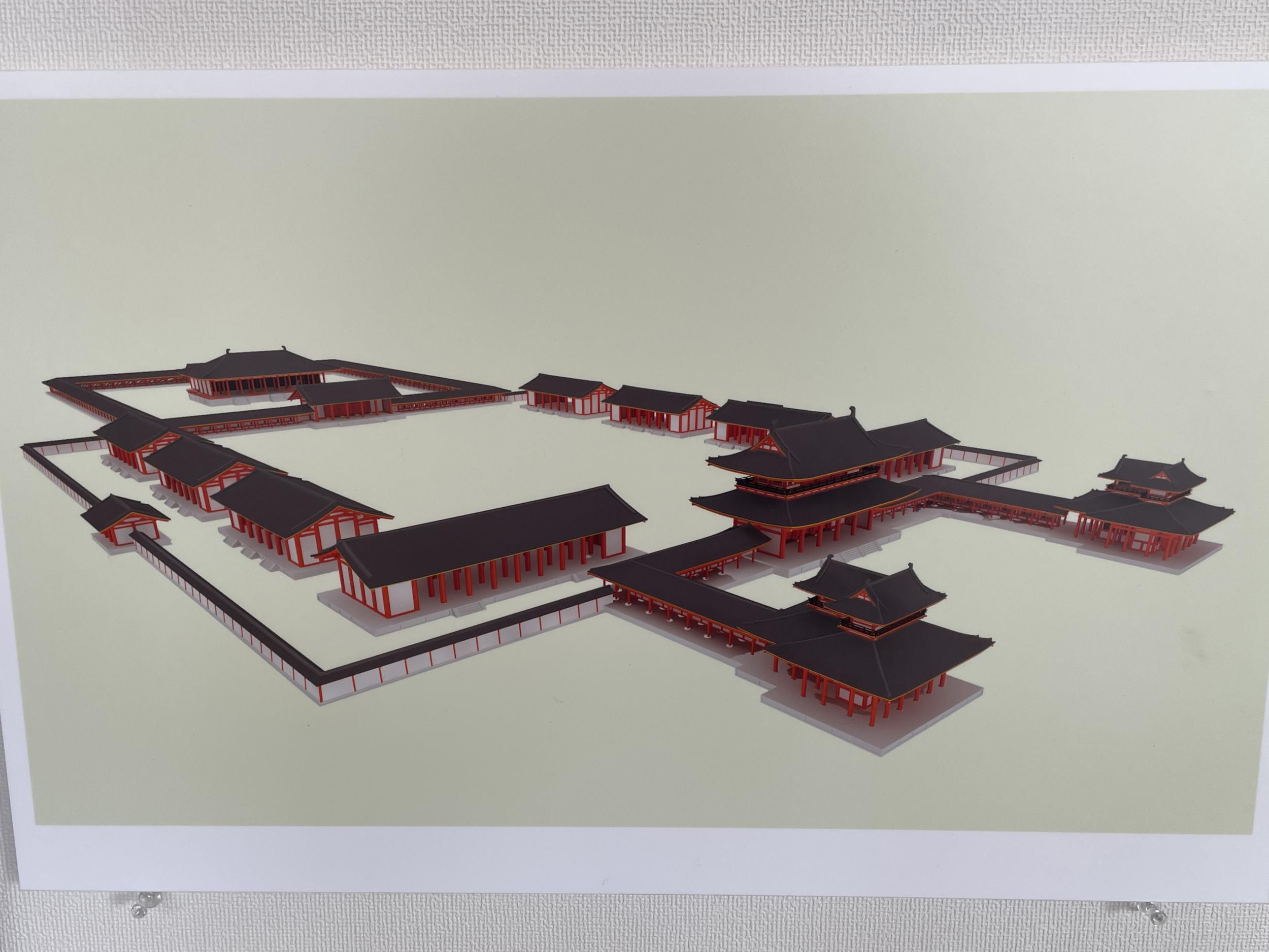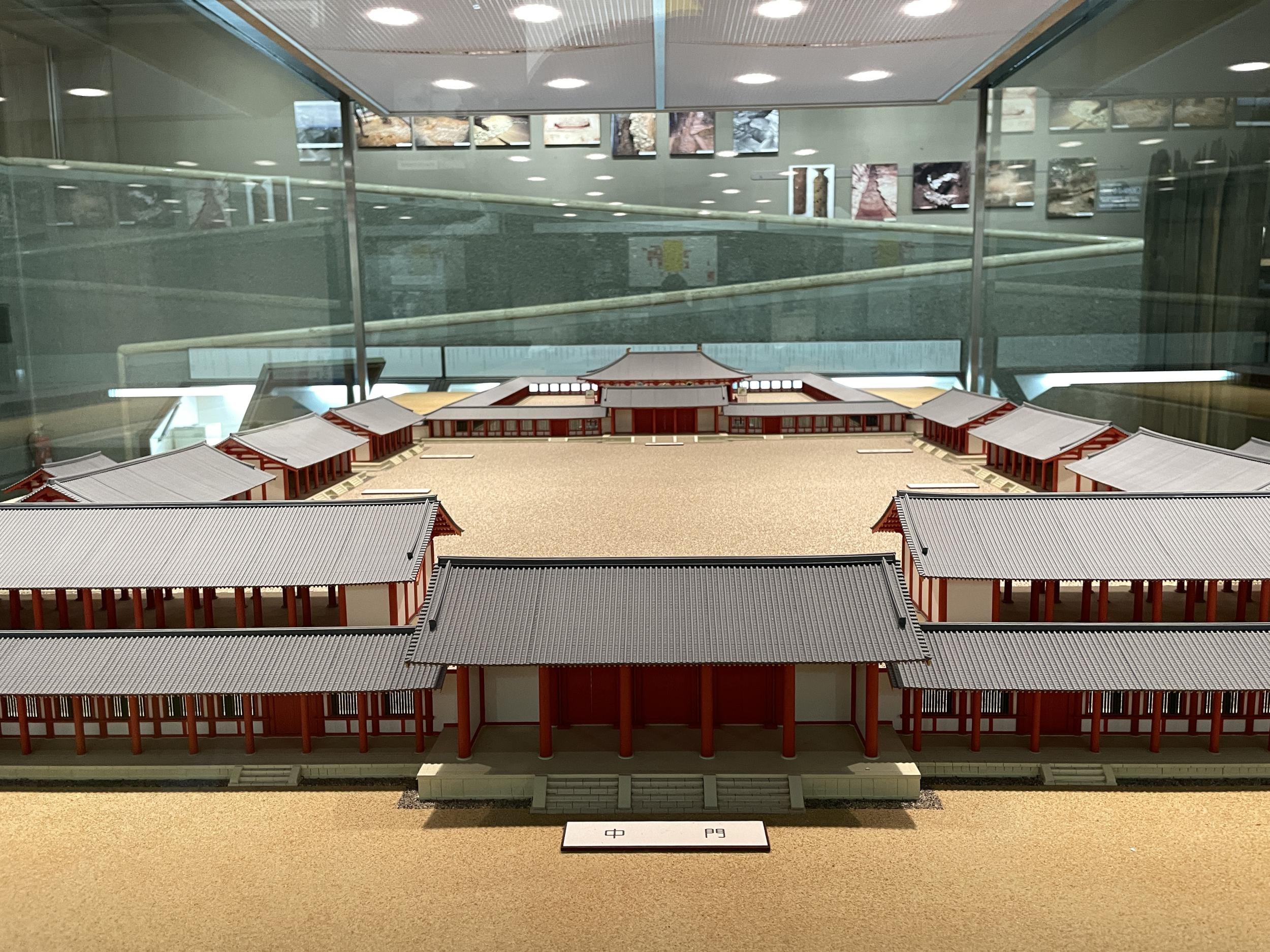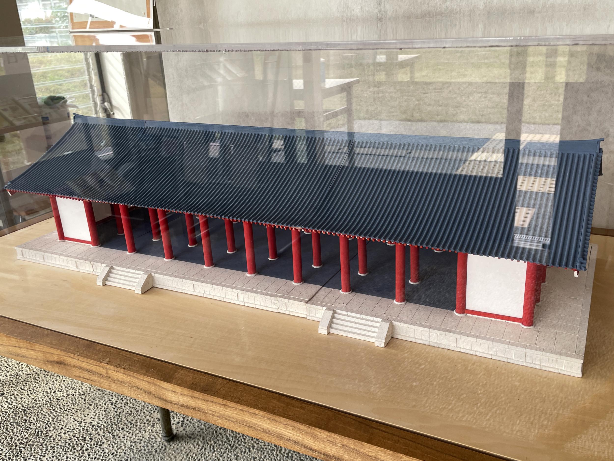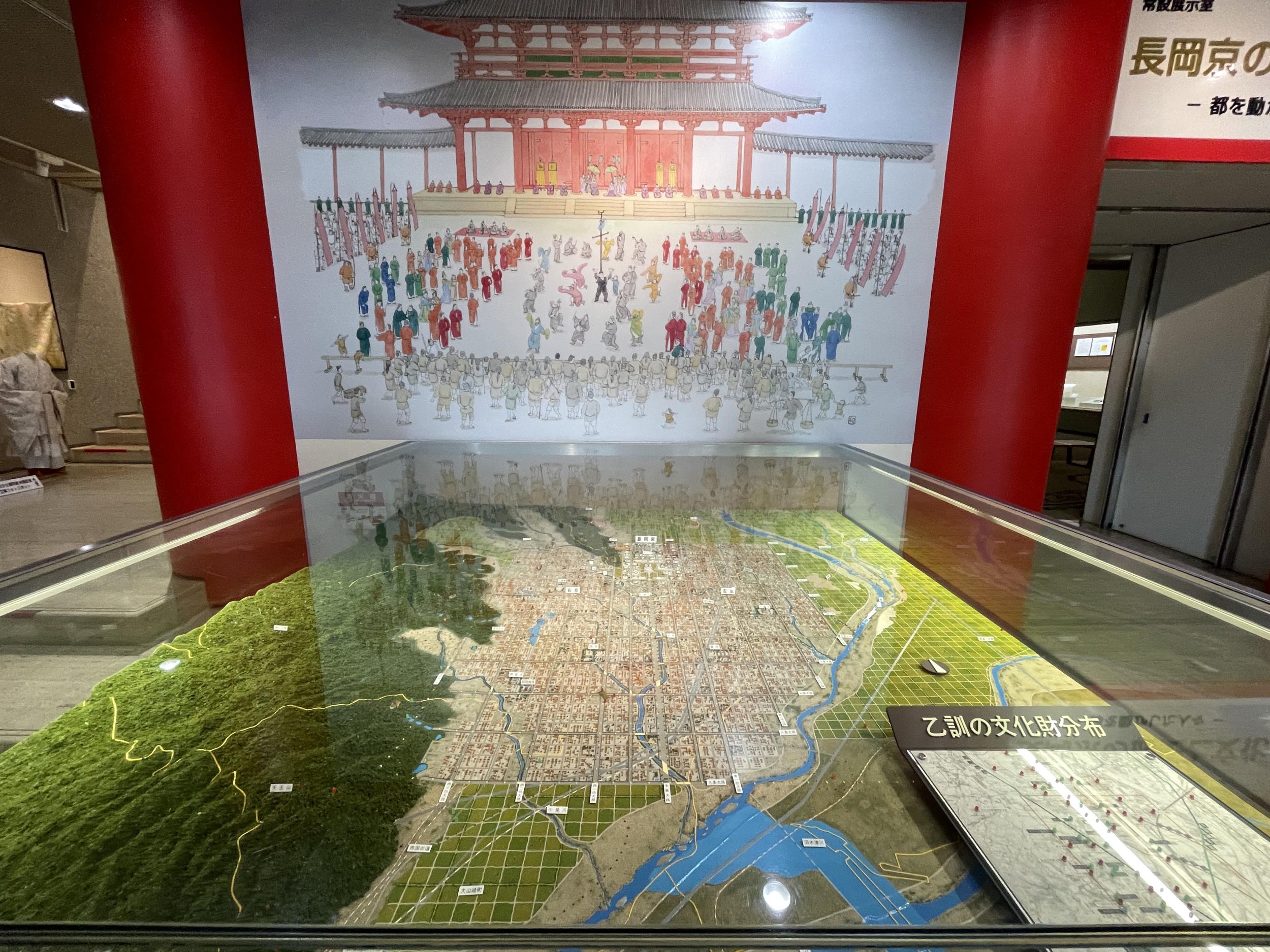 長岡宮のジオラマ。一枚目は南側からのアングルですが、朝堂院公園案内書のCGや説明板で案内されていた応天門から両翼に伸びていたはずの楼閣(翔鸞楼、栖鳳楼)がありません。発掘調査で楼閣が確認される前に作られたジオラマなのかも。
