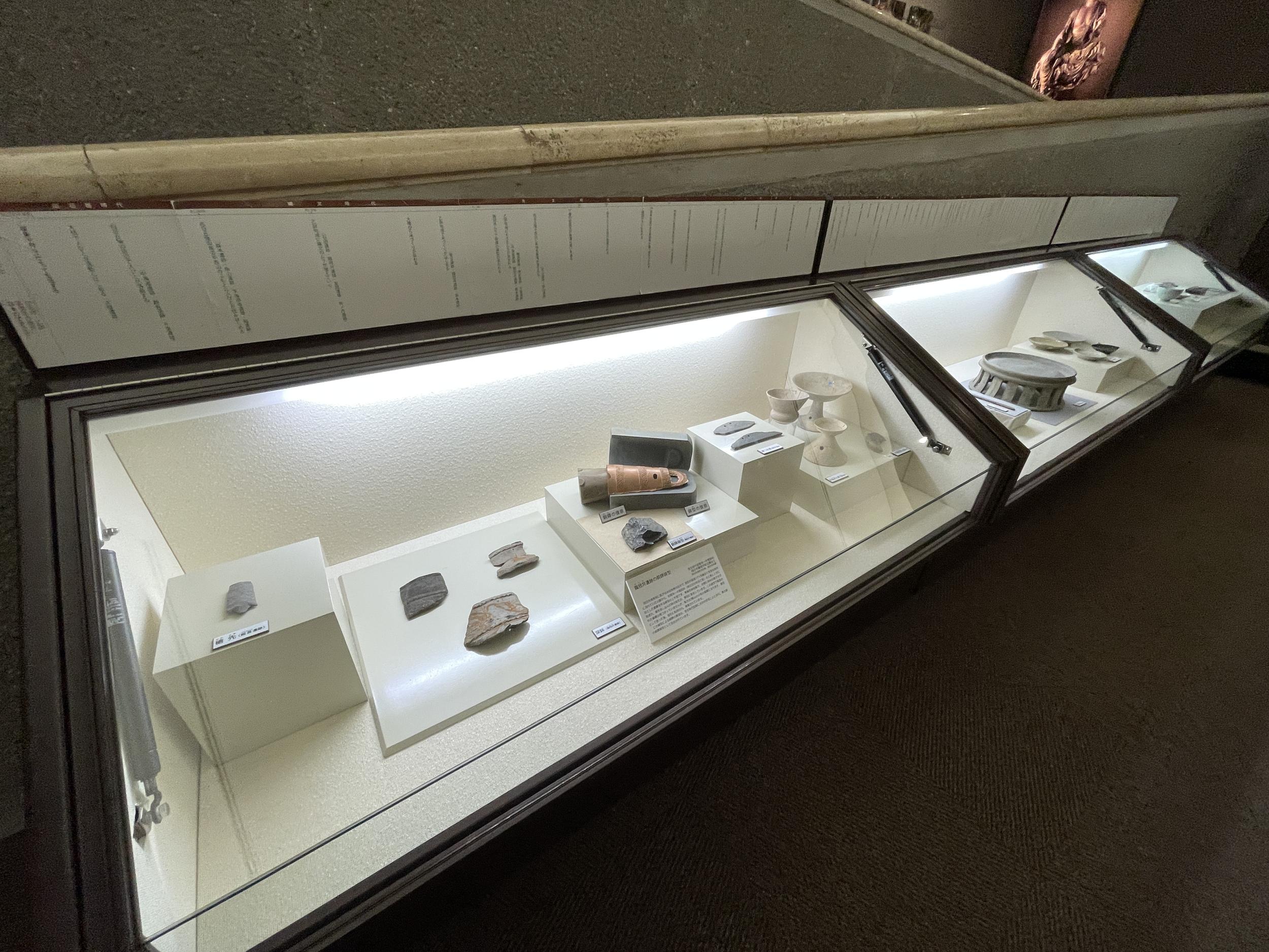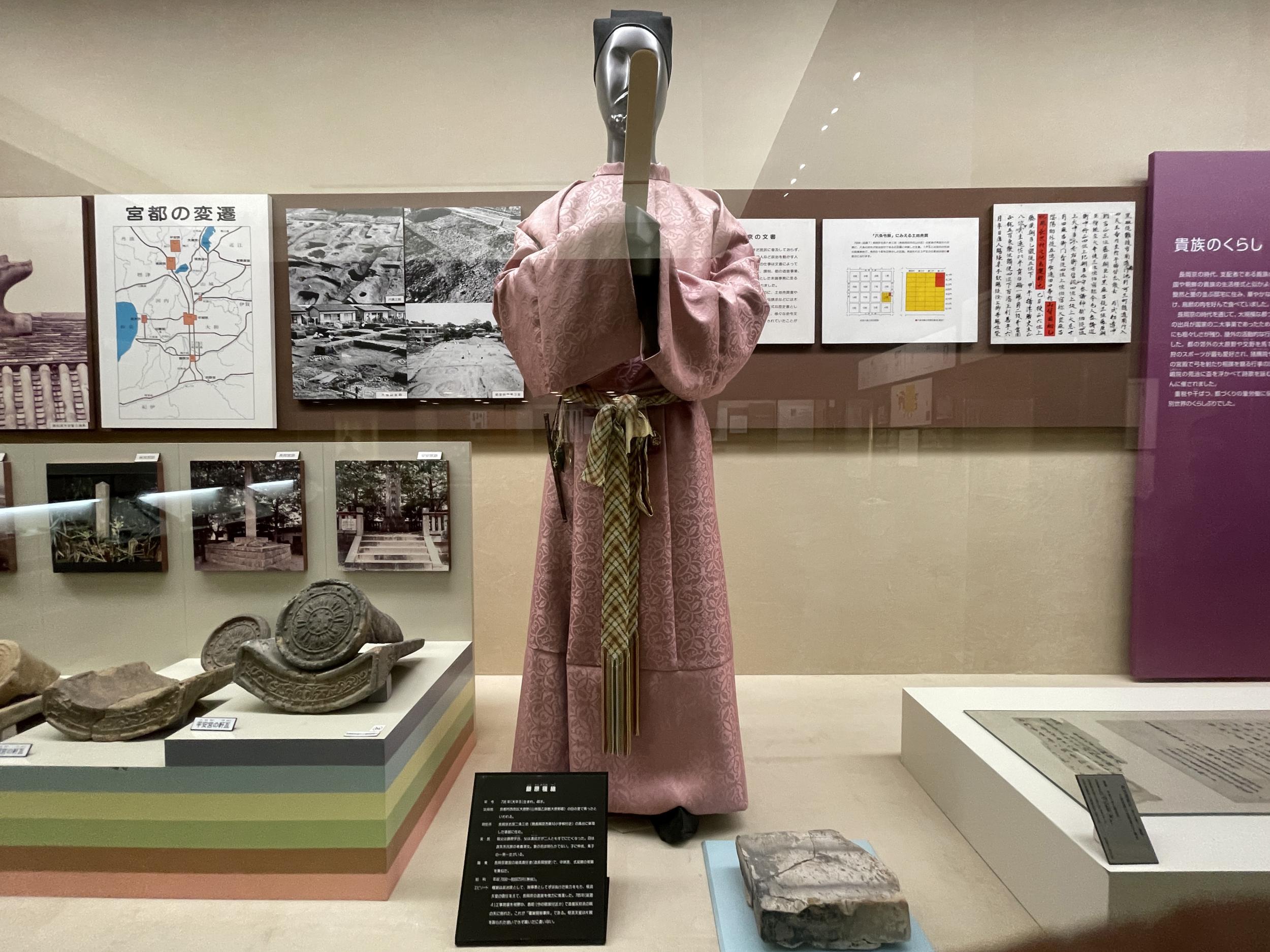 軽間嶋枌(かるまのしますき)は出土木簡に名前が残る長岡京の下級役人(史生、書記)。長岡京左京三条二坊八・九町にあった太政官厨家で、地子(税・貢進物)として各地から運ばれてきた米・塩等を、木札(木簡)による送り状・記録と照合し、記録に残す業務を行っていたらしい(ChatGPT談)。展示パネルには妻の浄女との恋愛は物語ともなって有名とあったのですが、ChatGPTに詳しく調べてもらっても分かりませんでした。何とか生活できる年収180万円だったらしい。