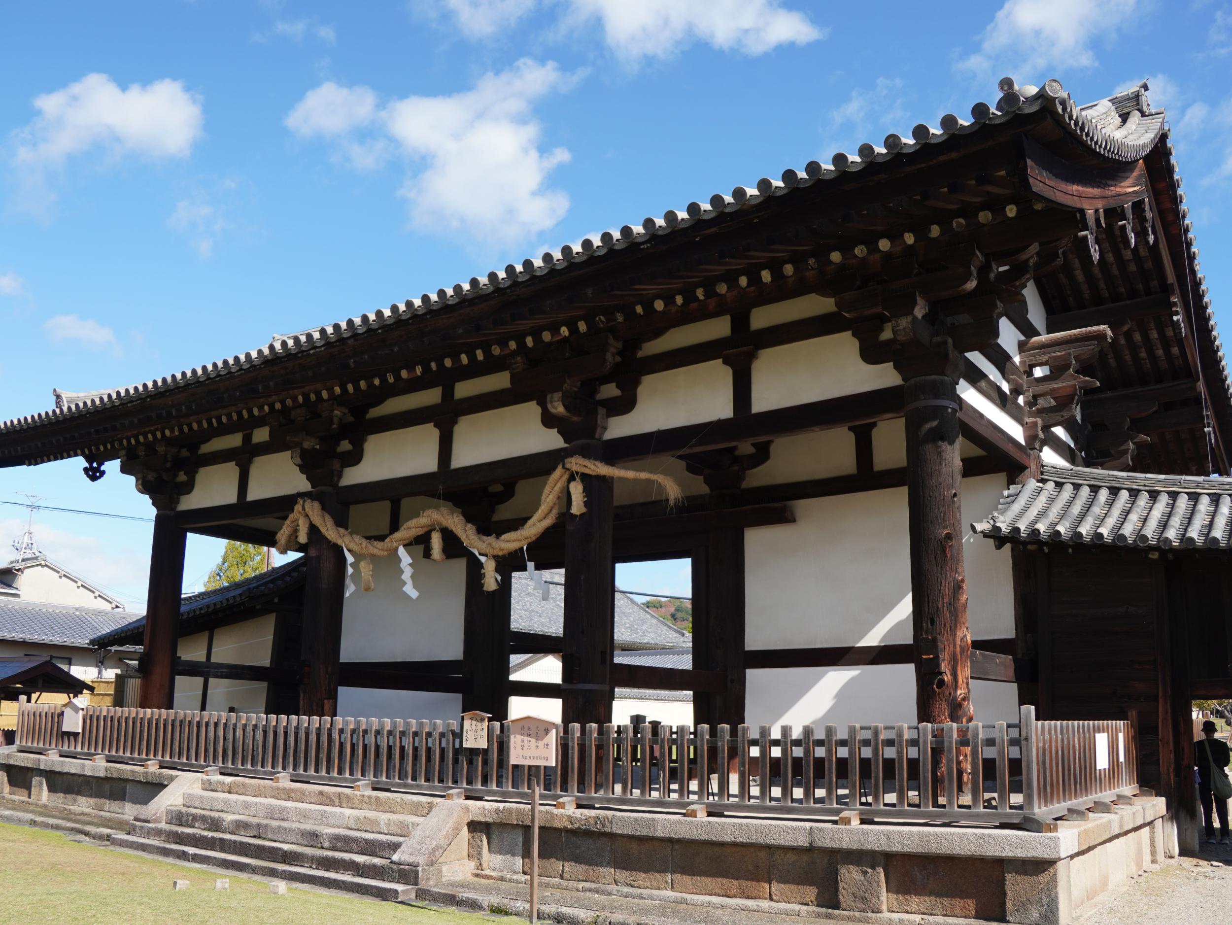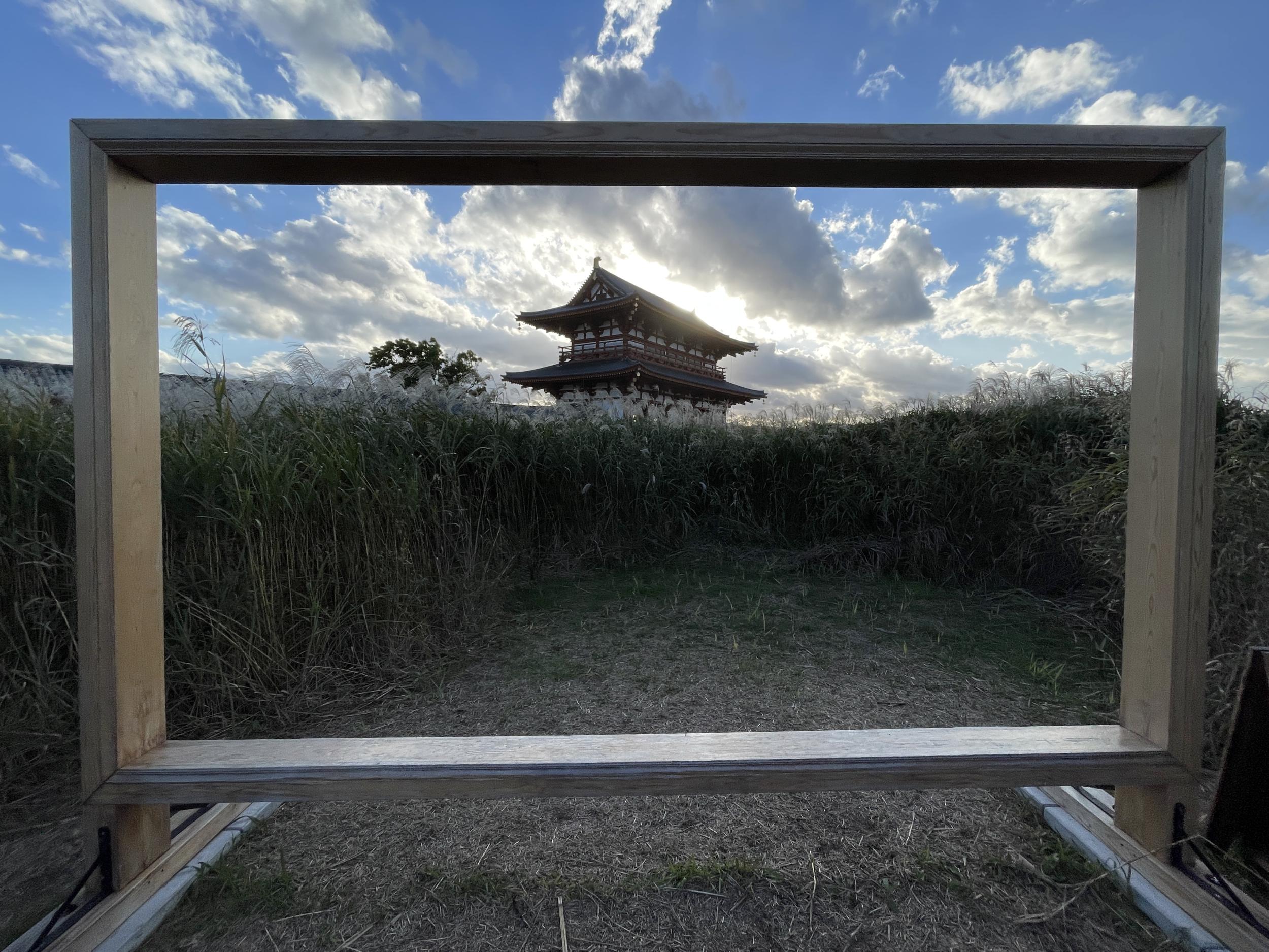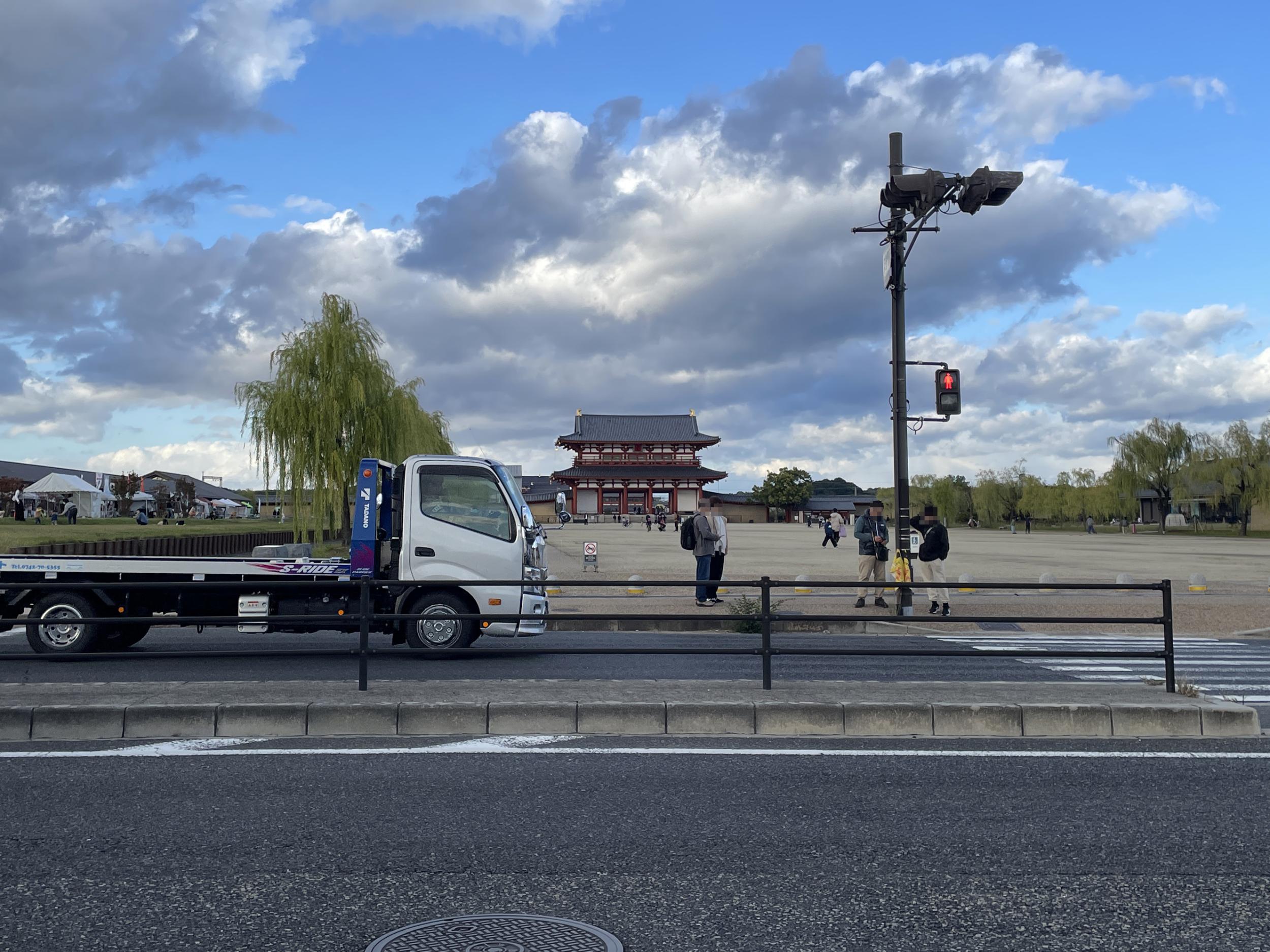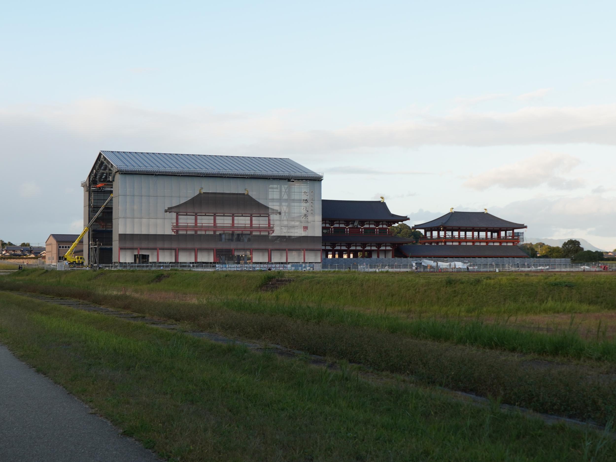朱雀門を抜けると直線上に大極門、右手に姿を現したばかりの東楼、東楼を覆っていた工事用の素屋根が大極門の左に移動し西楼の工事が始まっています。さらに直線上の向こうに大極殿がちらり。