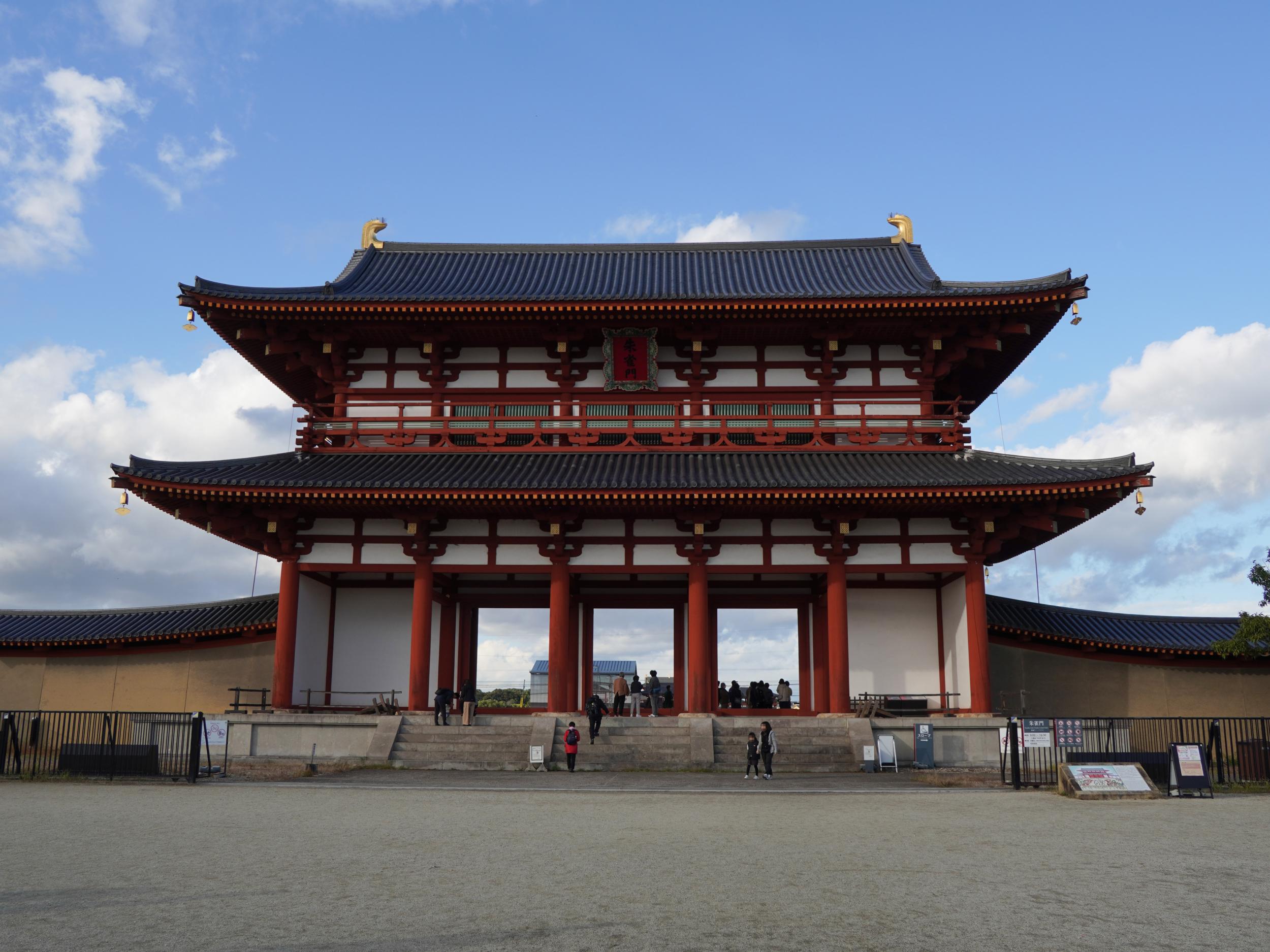 朱雀門です。昨日長岡宮朝堂院公園を訪ねたばかり、長岡宮朝堂院南門あるいは平安宮応天門に相当する平城宮の正門、昨日見たジオラマやCGの実物が目の前に聳える感じがします。