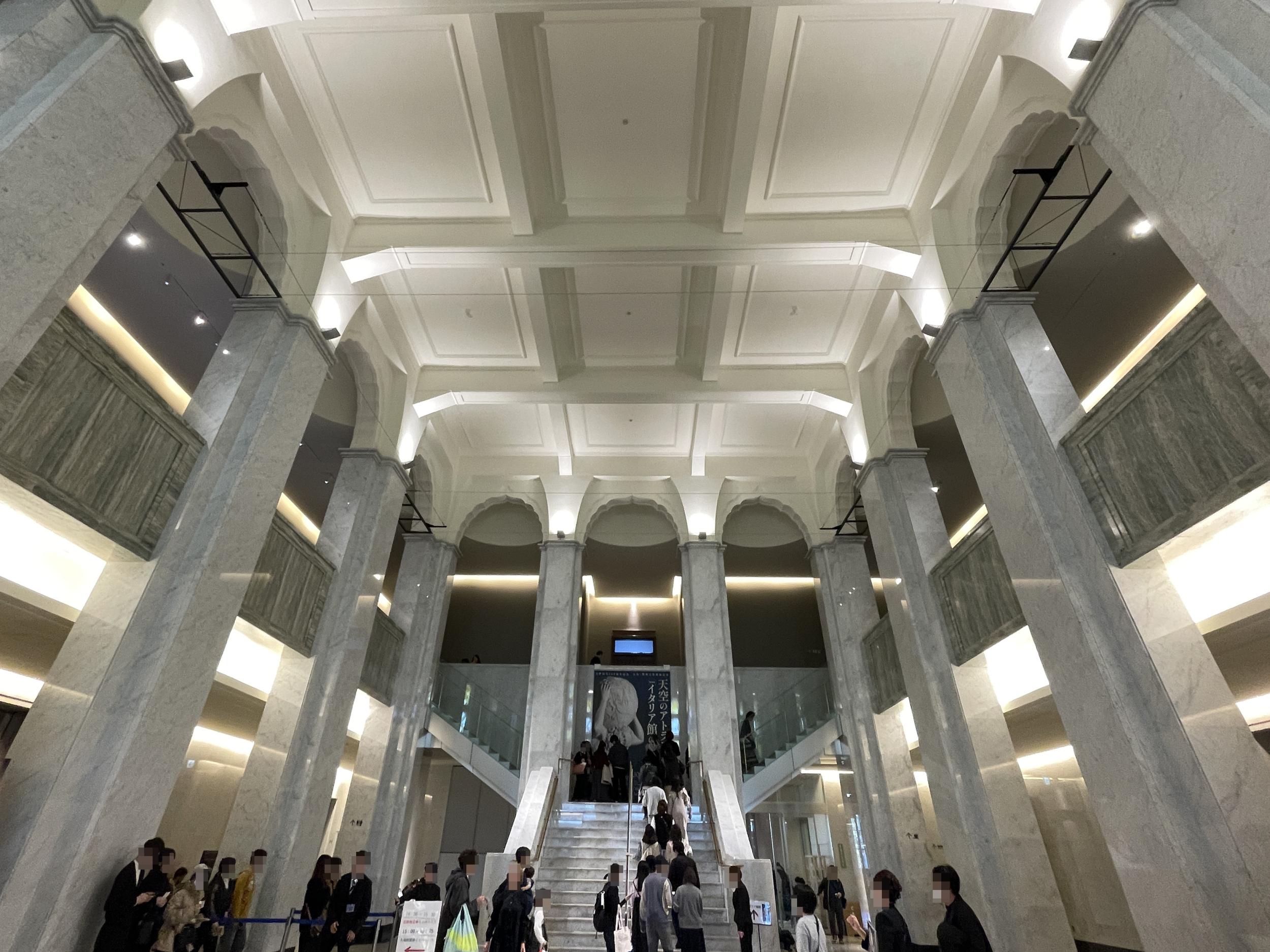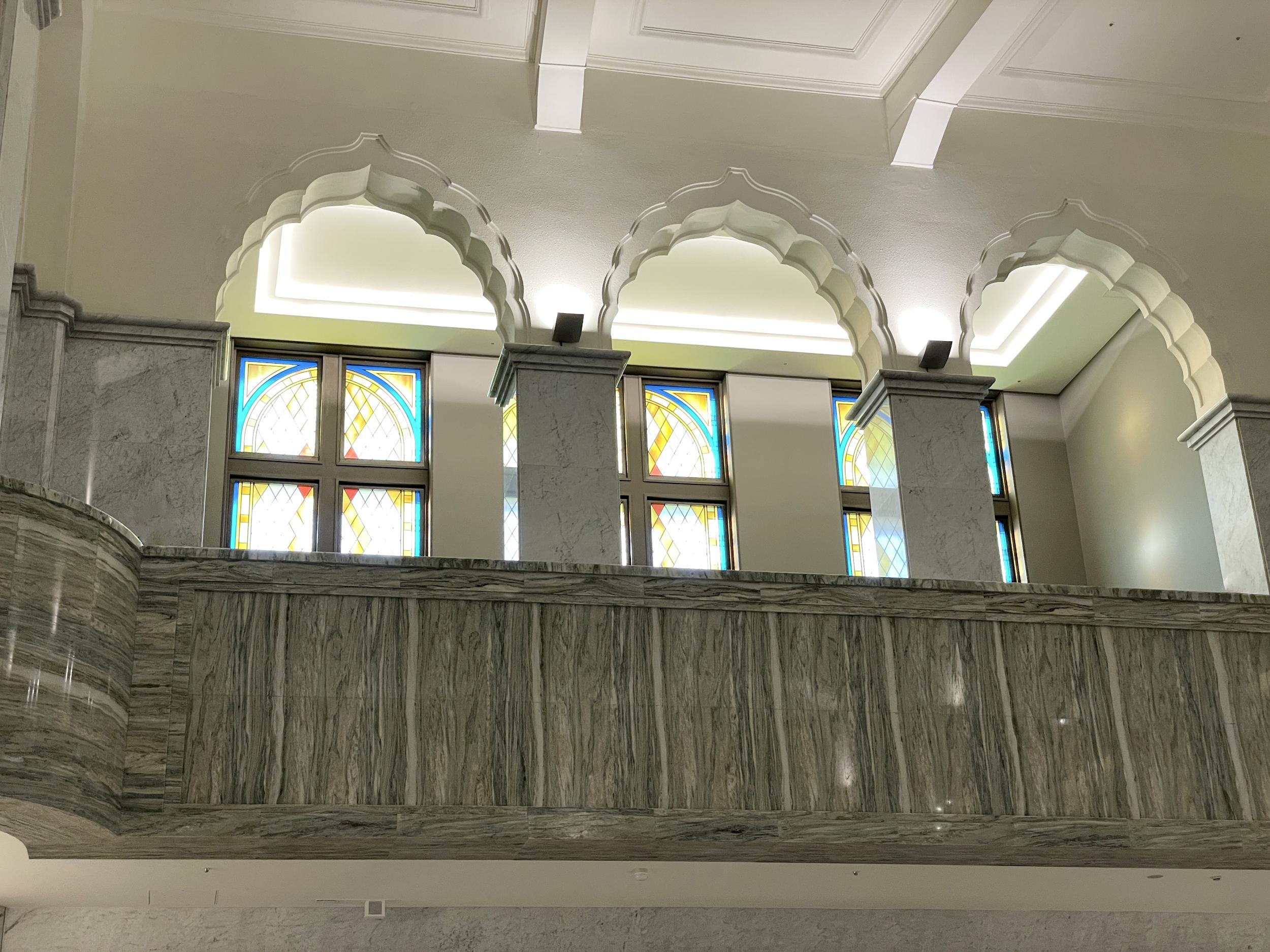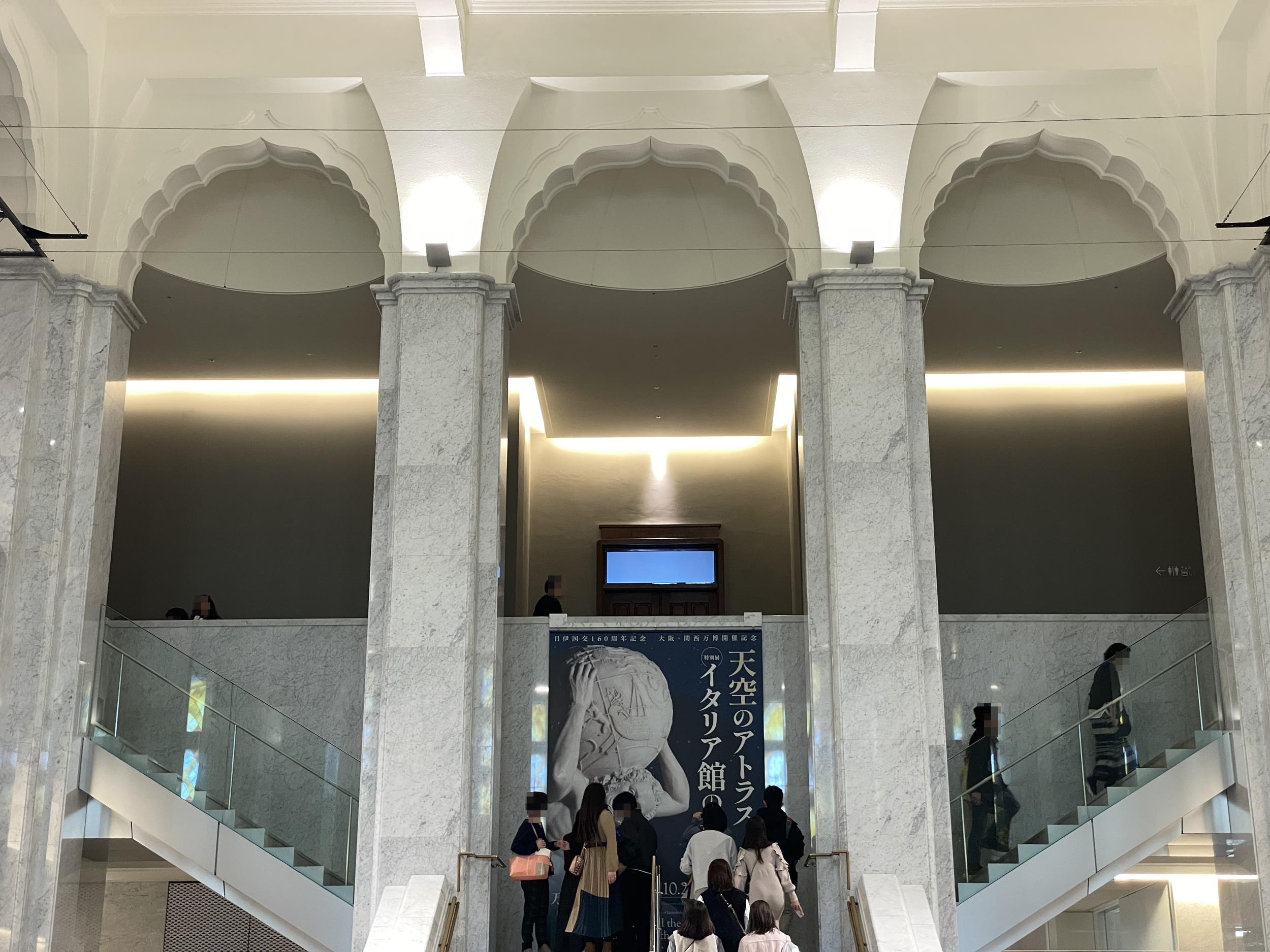 大阪市立美術館エントランスホール2階のステンドグラス。天空のアトラスの顔出し看板は大人気でした。