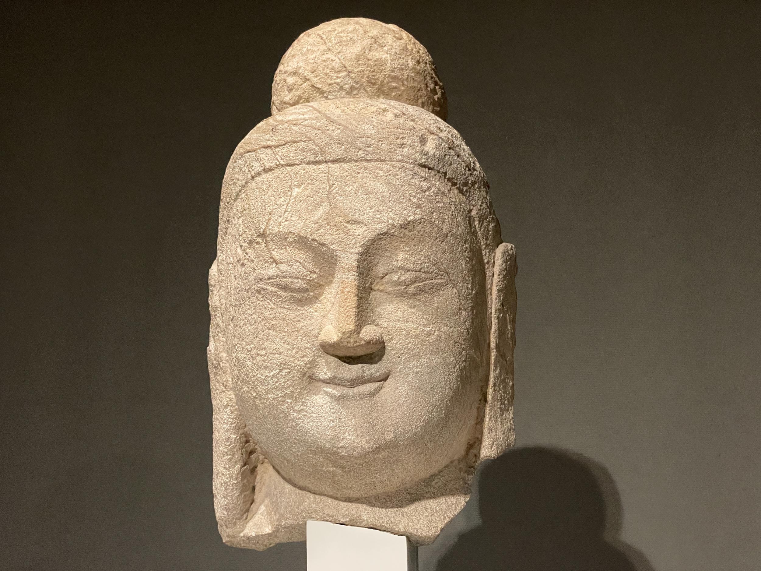 微妙に異なるアルカイックスマイルを浮かべた菩薩立像頭部(北魏、6世紀前半、龍門石窟賓陽中洞将来)、如来立像頭部(北魏、5世紀後半、伝雲岡石窟将来)、如来像頭部(北魏、5-6世紀、雲崗石窟か)。